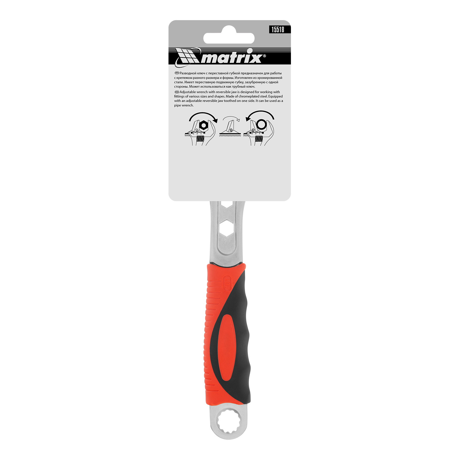 Разводной ключ Matrix 15518 длиной 250 мм, с переставной губкой и двухкомпонентной рукояткой, предназначен для выполнения монтажных работ. Способен заменить целый арсенал гаечных ключей, поскольку справляется с болтами разного размера. Переставная губка с зазубринами позволяет использовать ключ для работы предметами без специального профиля, например, трубами.