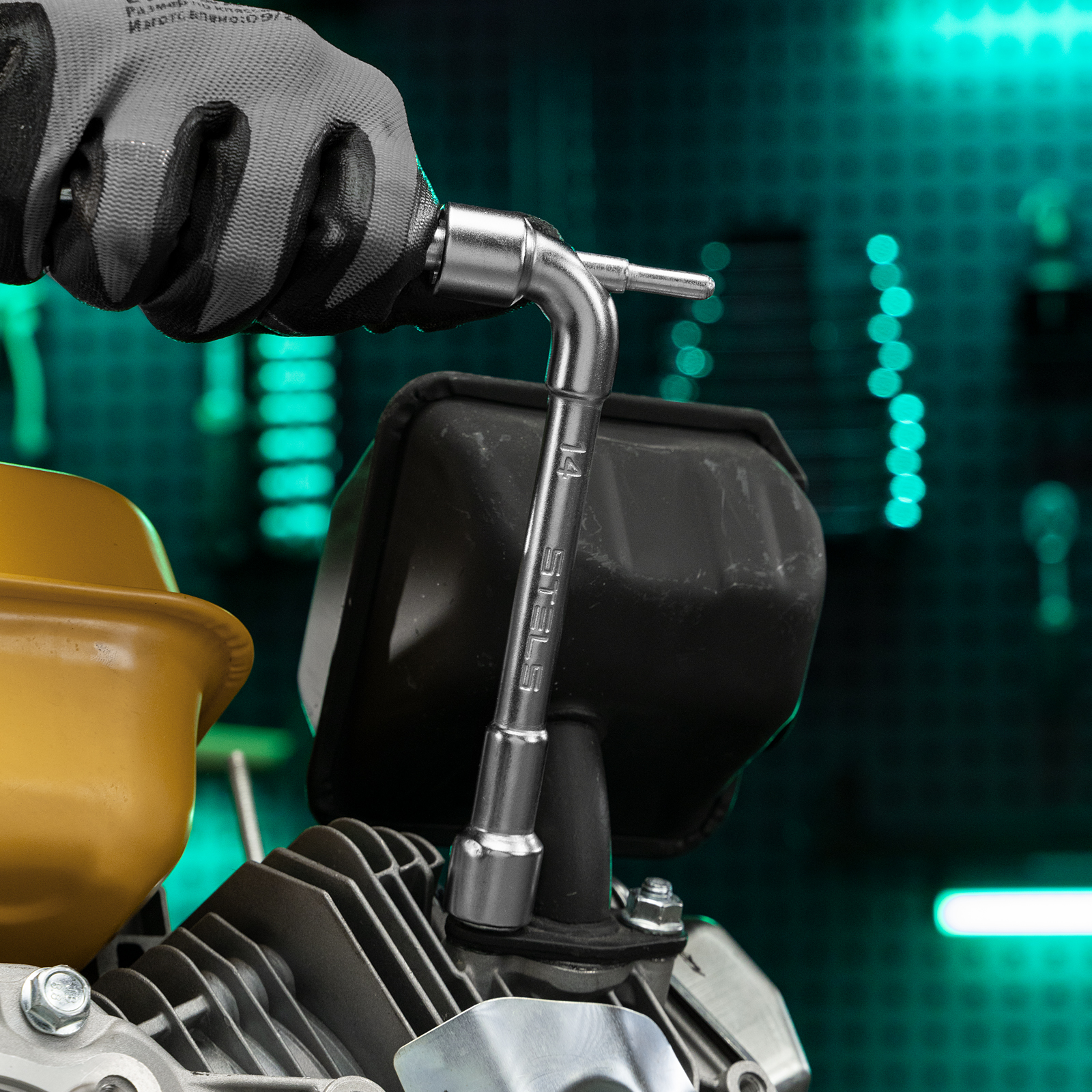 Угловой проходной ключ Stels 14235 размером 14 мм используется для работы в труднодоступных местах, когда обычный рожковый или накидной ключ не достает до крепежа. Будет полезен частным и профессиональным мастерам.