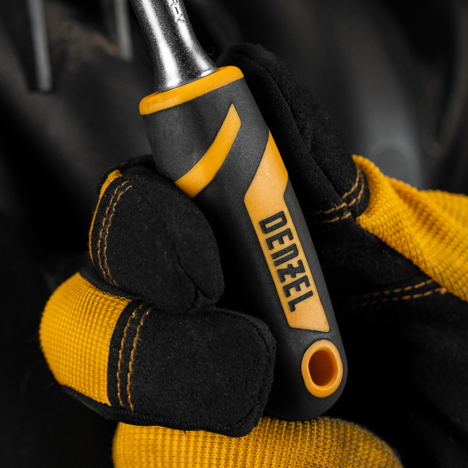 Ключ-трещотка Denzel 14031 из стали CrV, с присоединительным квадратом 1/4", с быстрым сбросом и храповым механизмом с 90 зубьями, предназначен для установки торцевых головок, а также адаптеров и удлинителей с посадочным размером соответствующего размера. Угол поворота трещотки составляет всего 4°, что упрощает работу в труднодоступных местах. Инструмент будет полезен в сервисном центре, на СТО, а также пригодится дома или в поездке.