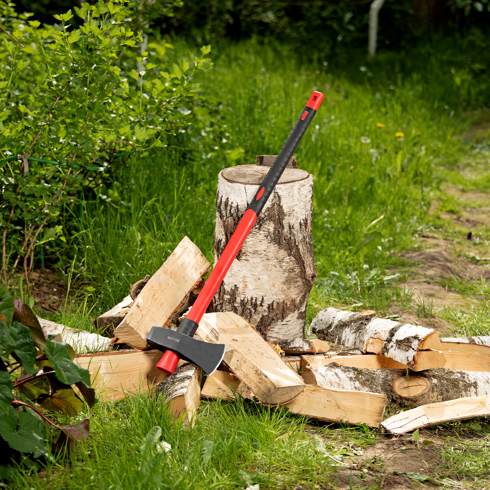 - Большая сила удара — колун оснащен длинной рукояткой 900 мм, полотно весит 3,6 кг.