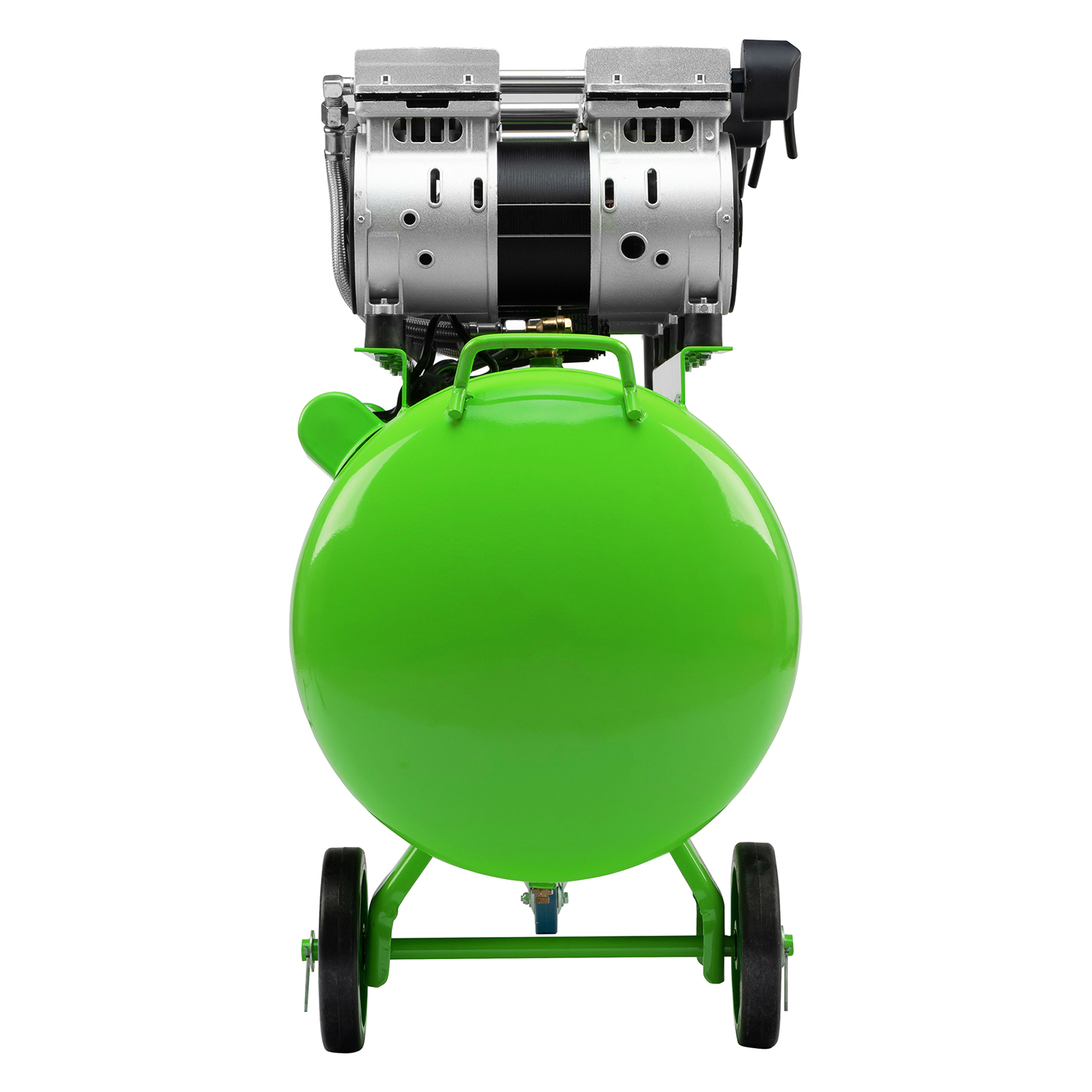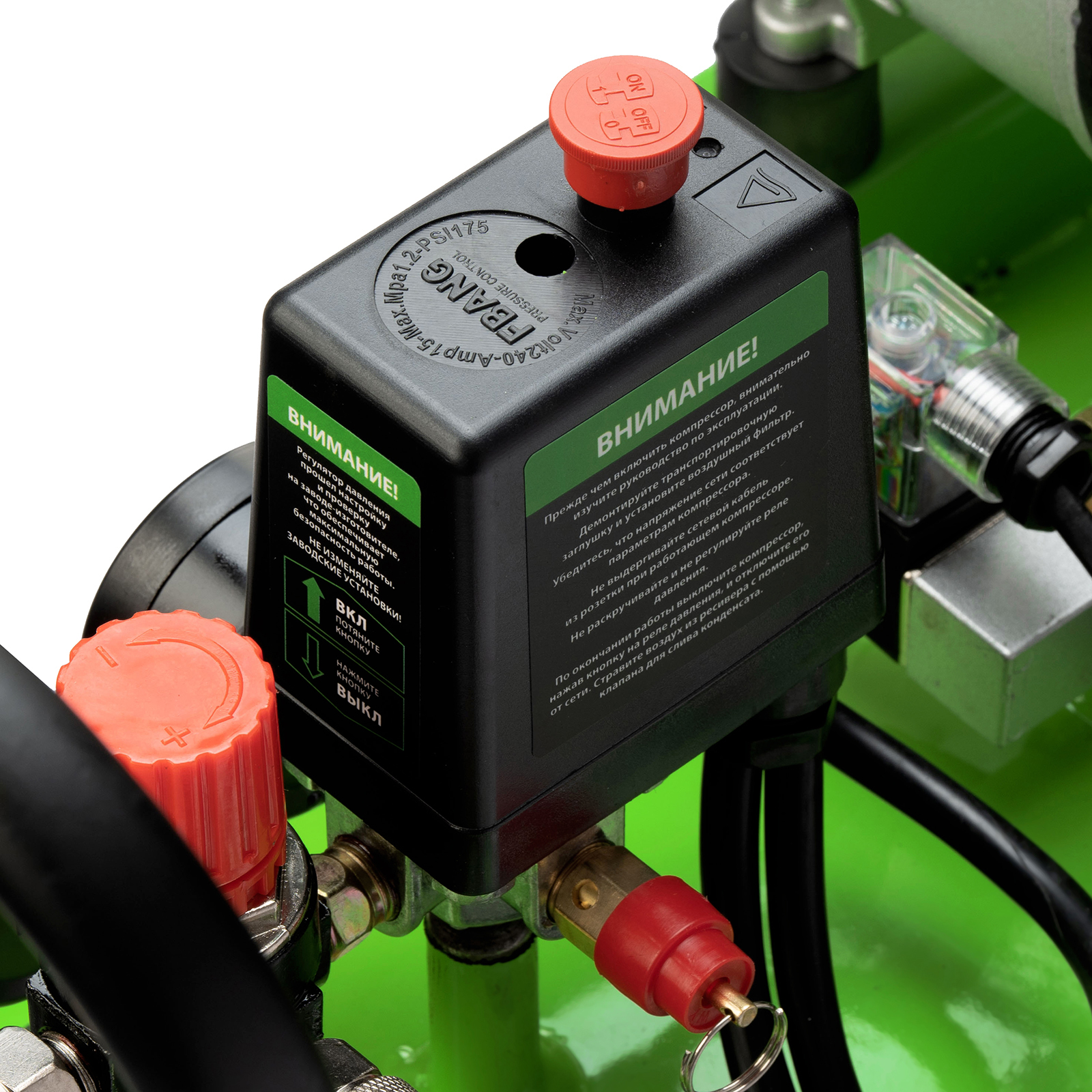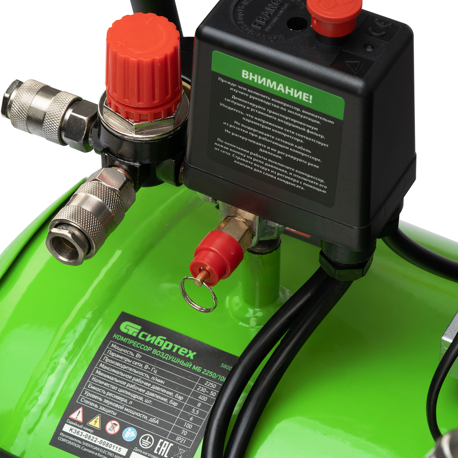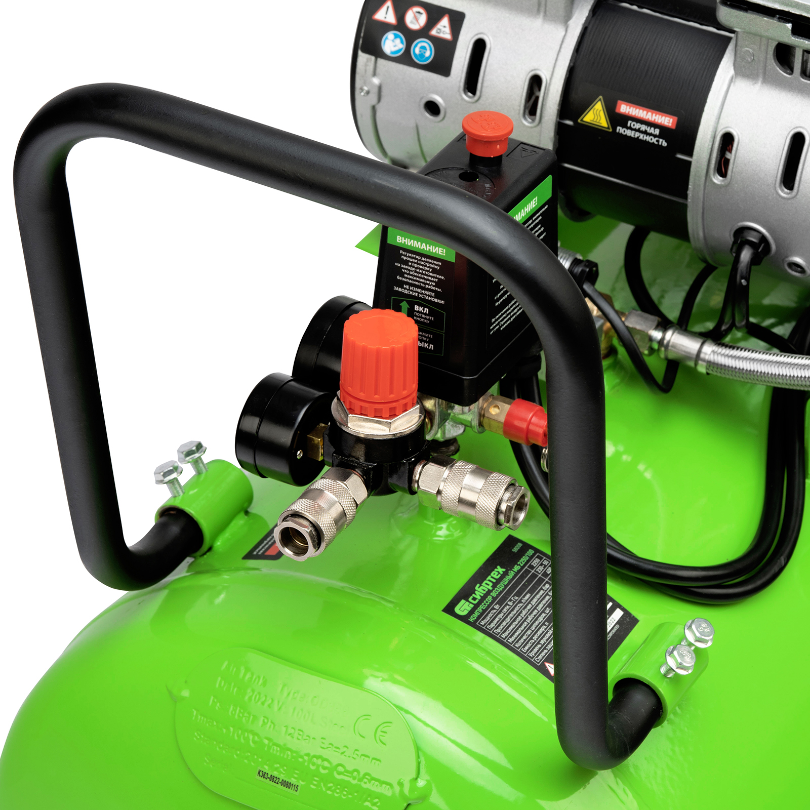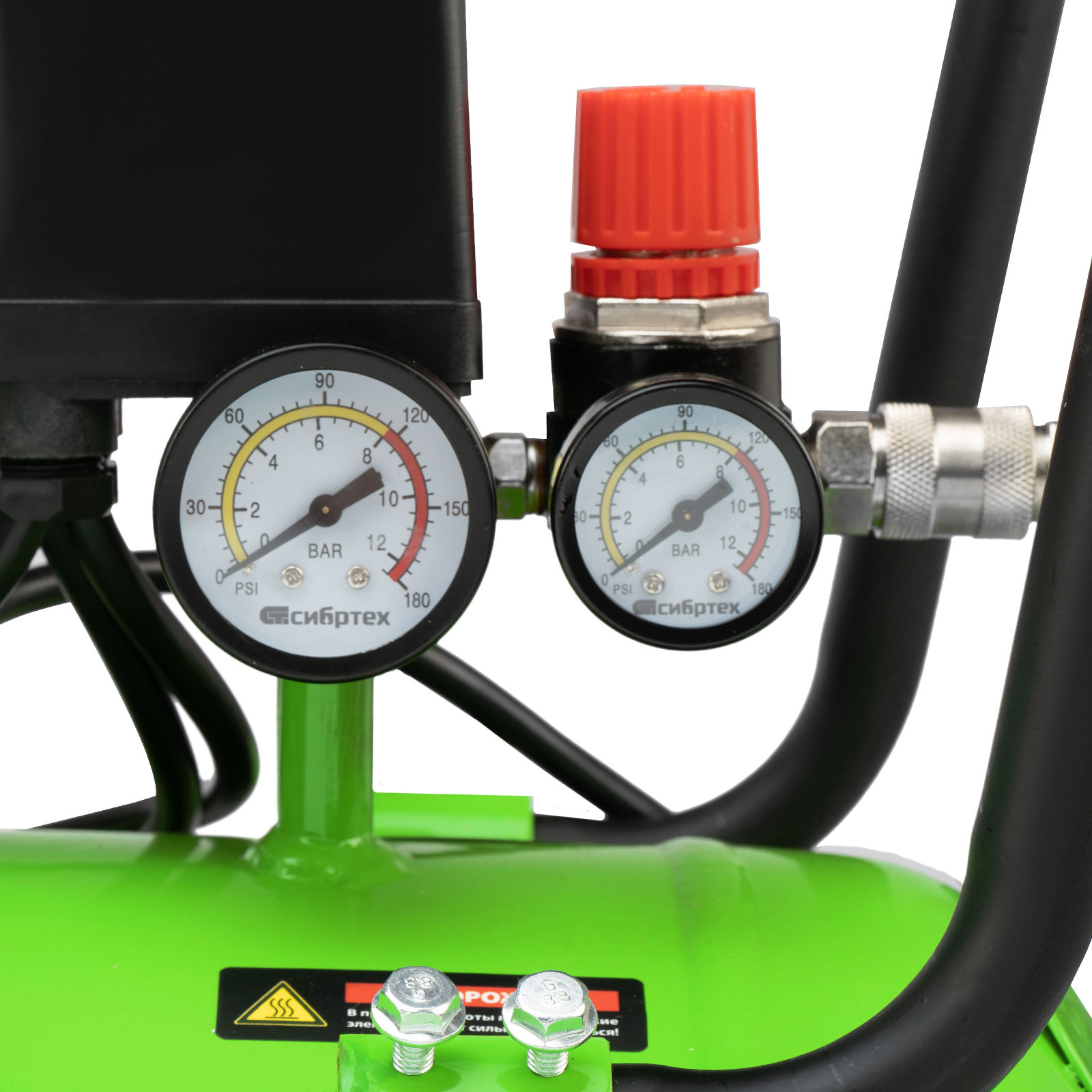 - Контроль рабочих параметров — компрессор оборудован механическим манометром для отслеживания давления.