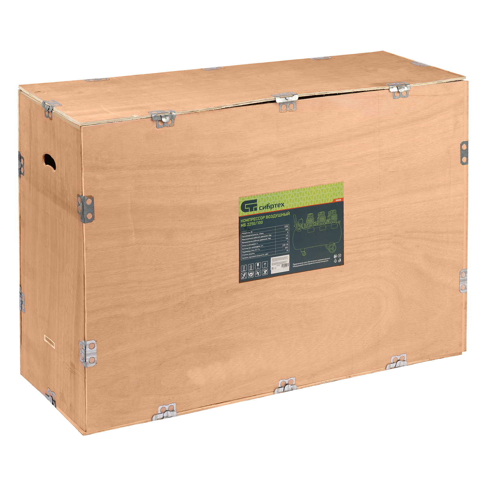 Безмасляный малошумный компрессор Сибртех МБ 2250/100 58008 мощностью 2250 Вт и объемом ресивера 100 л имеет производительность на входе 400 л/мин и сжимает воздух под давлением до 8 бар. Используется для обеспечения функционирования пневмоинструмента, например, краскораспылителя, перфоратора или пневматического шуруповерта. Для работы устройства не требуется масло, поэтому воздух на выходе не содержит его частиц. Компрессор оптимален для проведения покрасочных работ и продувки электронных компонентов.,Одна из ключевых особенностей компрессора — низкий уровень шума (не превышает 70 дБ), позволяющий использовать устройство в жилом помещении без дискомфорта для людей.