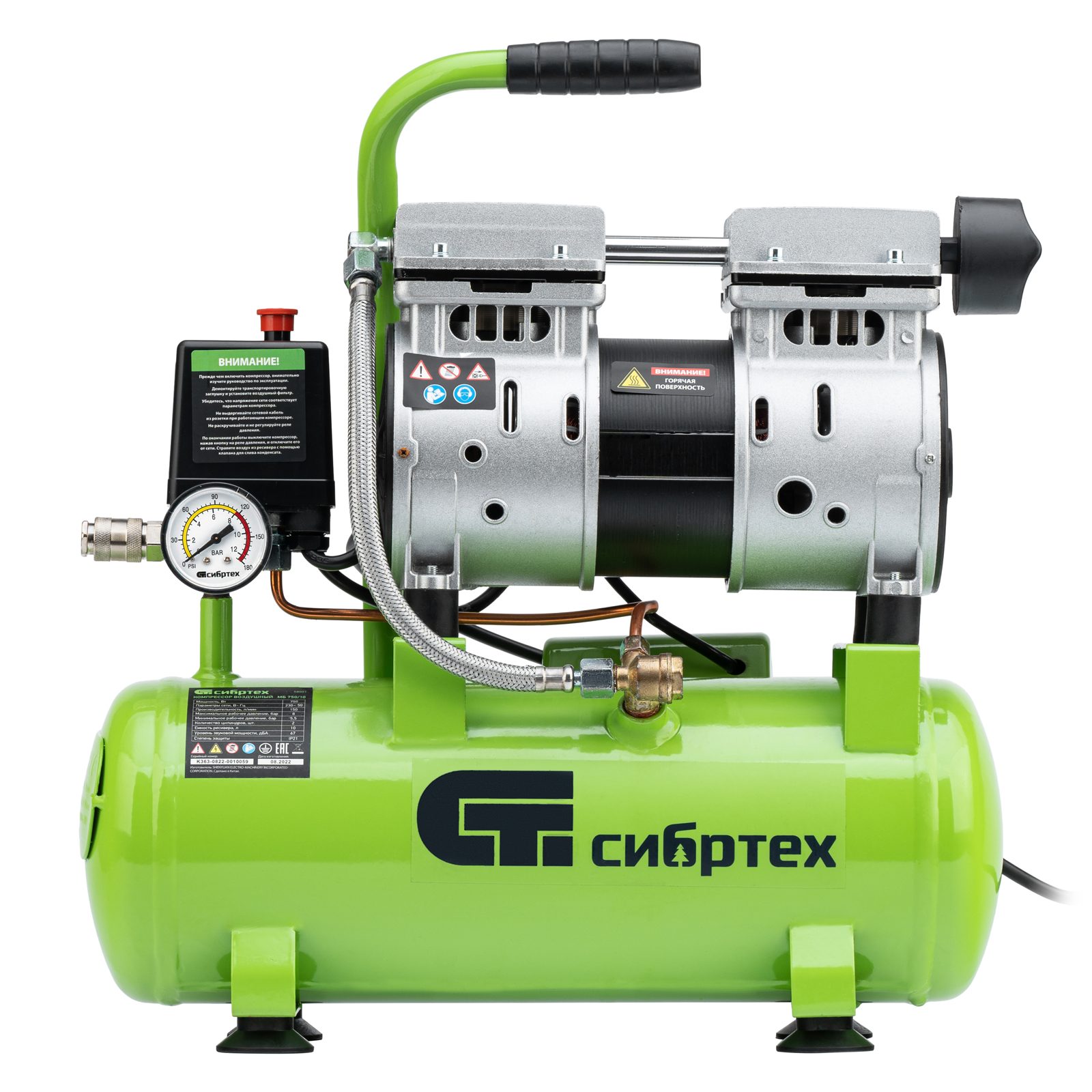 Безмасляный малошумный компрессор Сибртех МБ 750/10 58001 мощностью 750 Вт и объемом ресивера 10 л имеет производительность на входе 150 л/мин и сжимает воздух под давлением до 8 бар. Используется для обеспечения функционирования пневмоинструмента, например, краскораспылителя или пневматического шуруповерта. Для работы устройства не требуется масло, поэтому воздух на выходе не содержит его частиц. Компрессор оптимален для проведения покрасочных работ и продувки электронных компонентов.,Одна из ключевых особенностей компрессора — низкий уровень шума (в районе 65 дБ), позволяющий использовать устройство в жилом помещении без дискомфорта для людей.