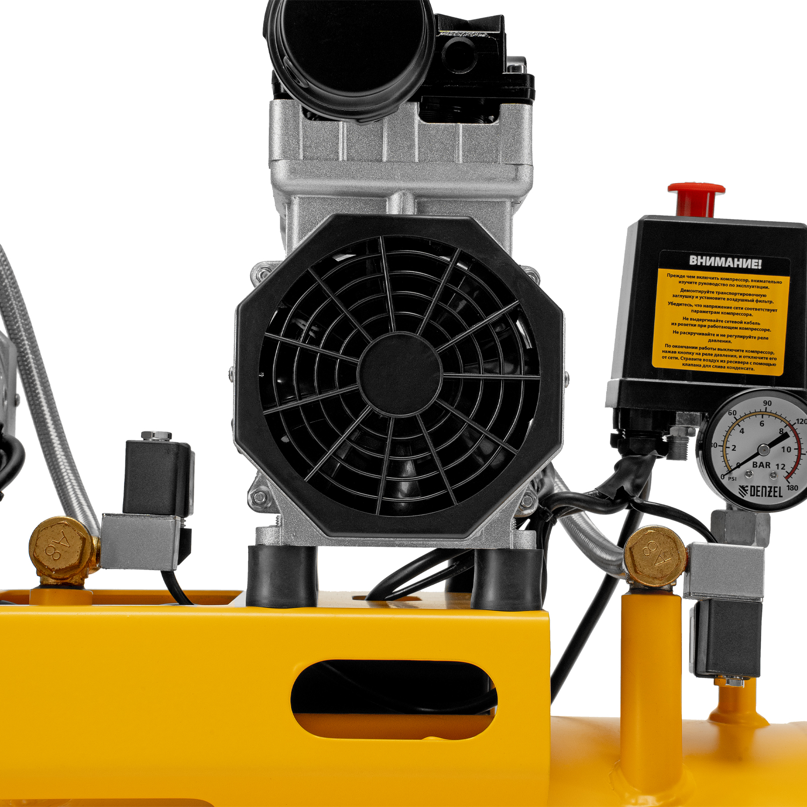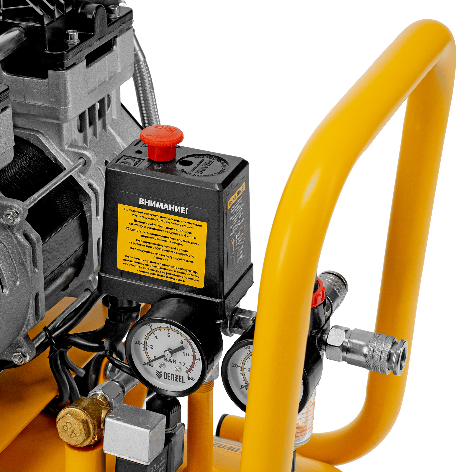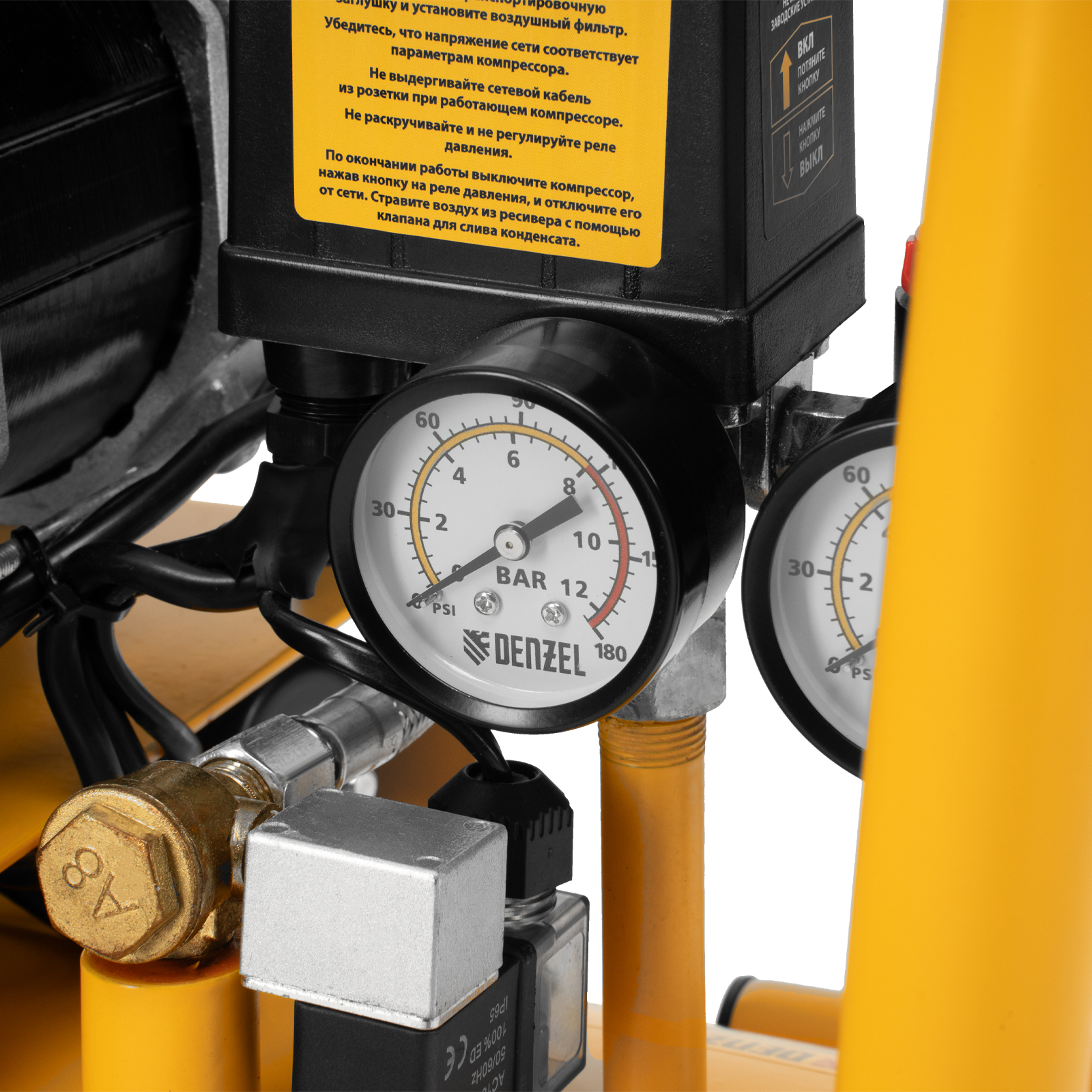 - Контроль давления в ресивере и на выходной магистрали — компрессор оборудован двумя манометрами.