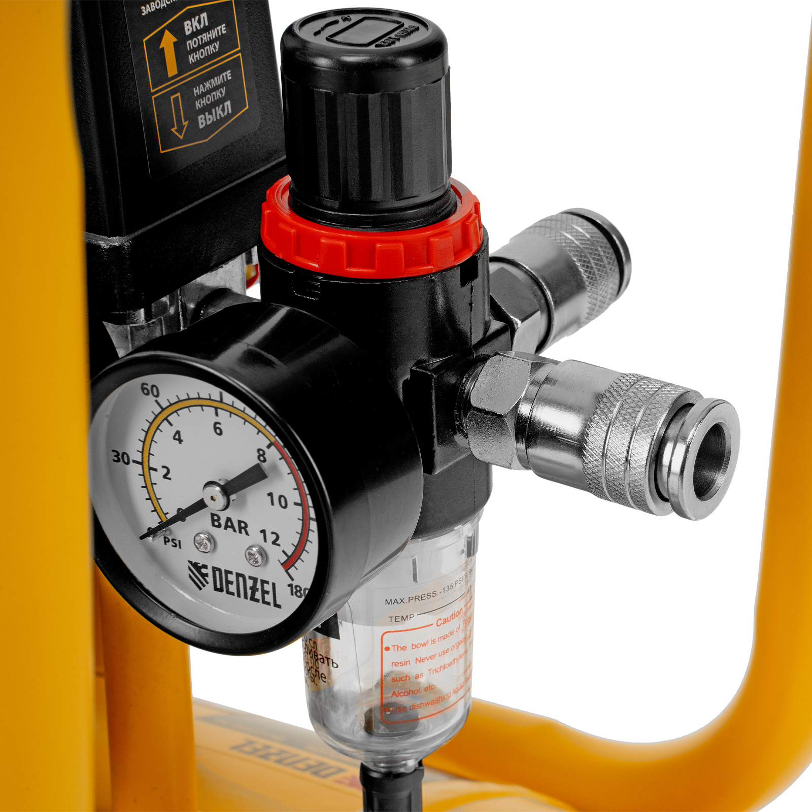 - Регулятор давления на выходе — можно выбрать оптимальный режим подачи воздуха в соответствии с характеристиками пневмоинструмента.