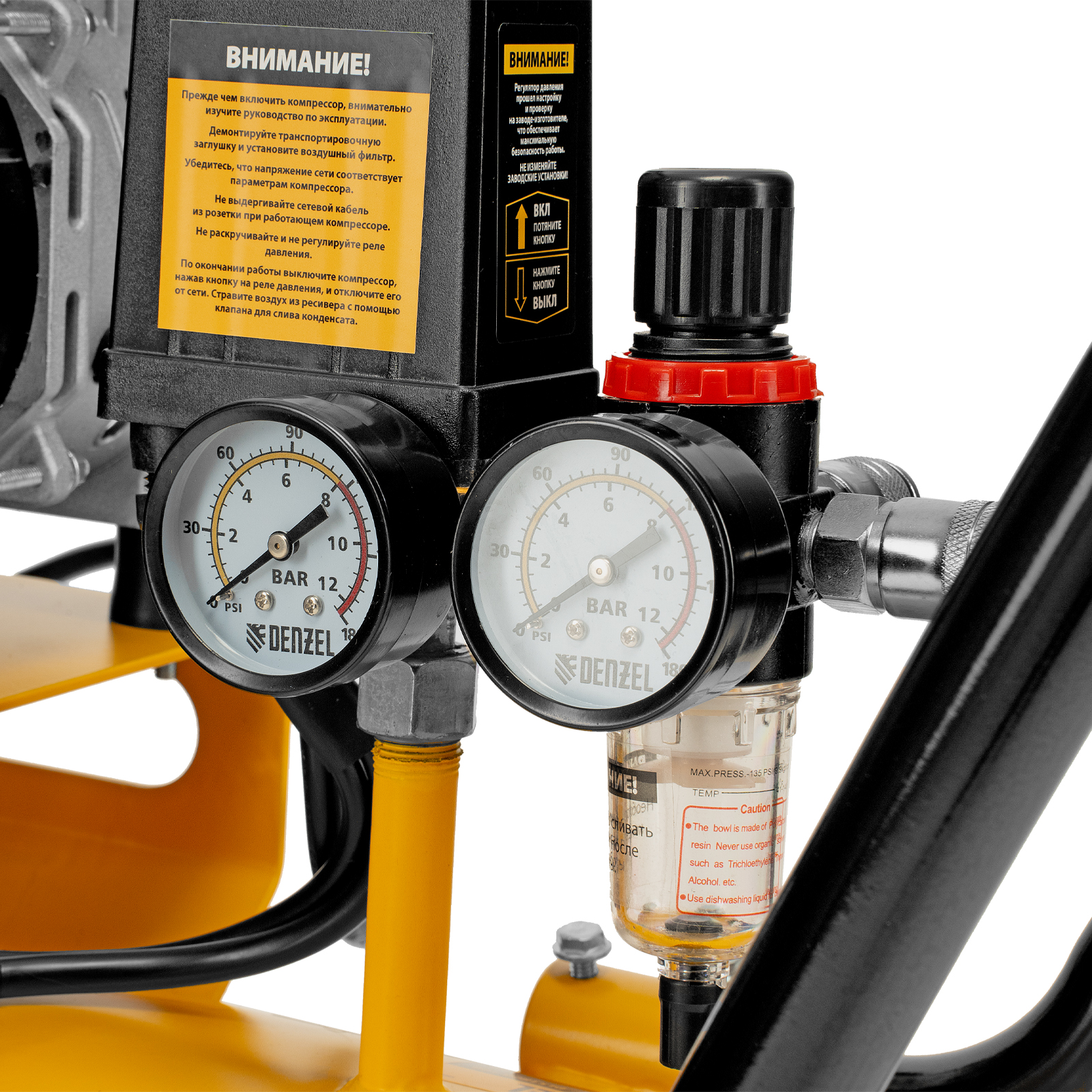 - Контроль давления в ресивере и на выходной магистрали — компрессор оборудован двумя манометрами.