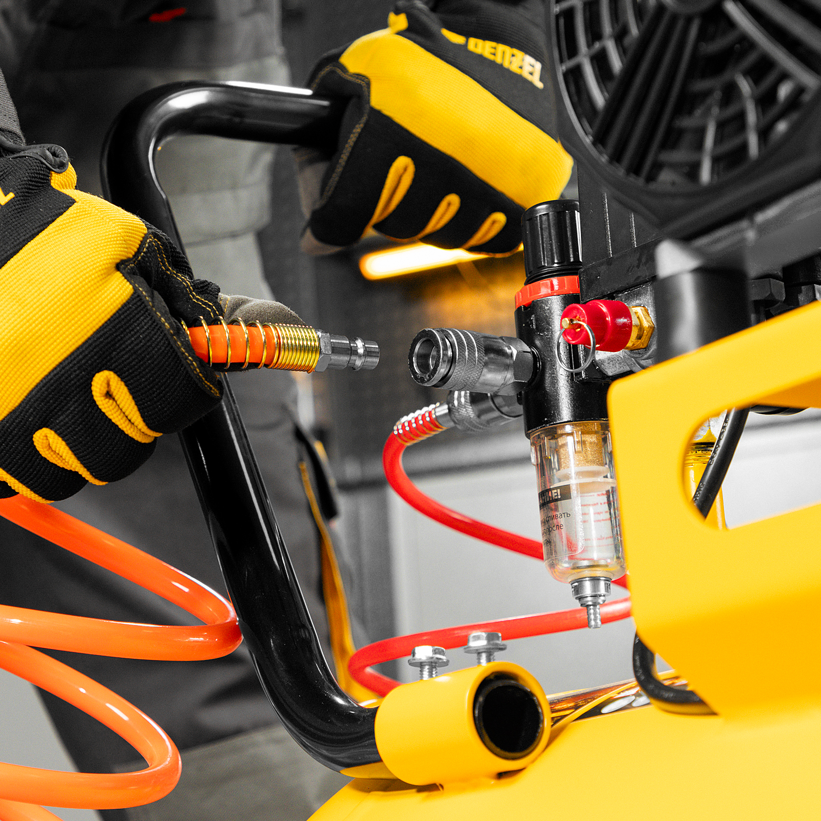 - Простая подготовка к работе — благодаря быстросъемному выходному коннектору подключение пневмоинструмента занимает несколько секунд.
