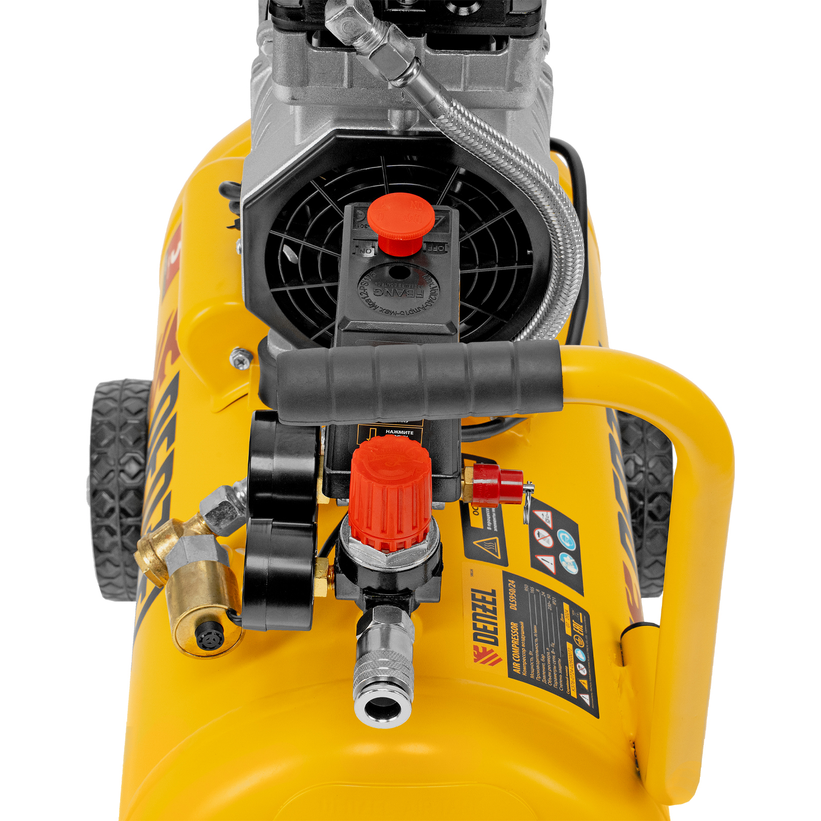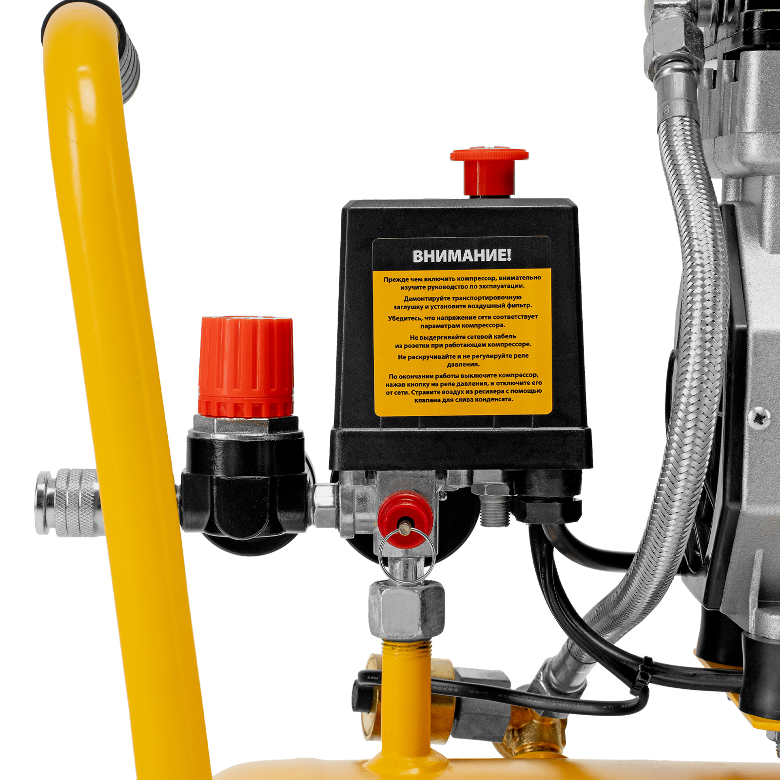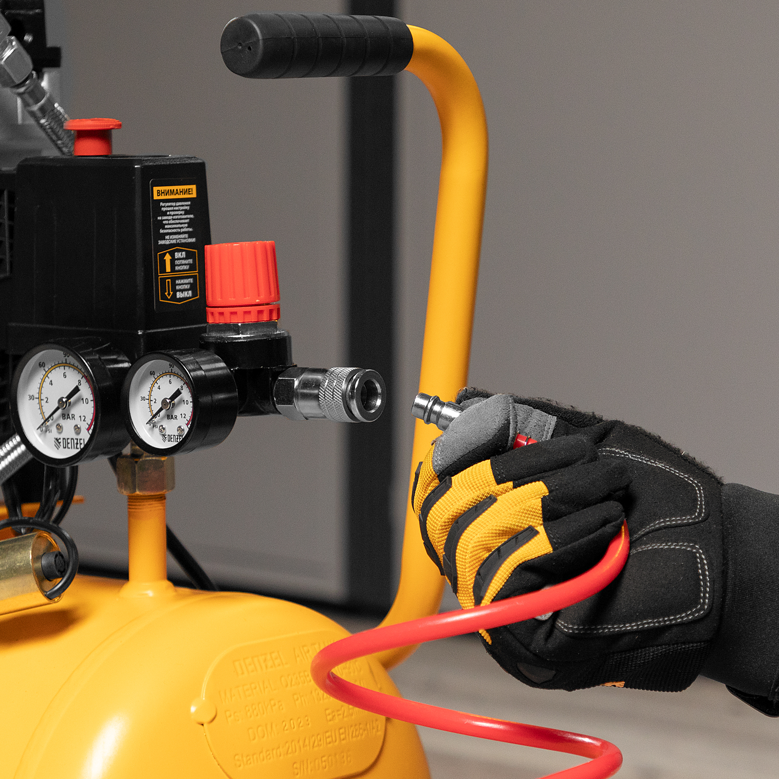 - Безопасность и высокая устойчивость — резиновые ножки гасят вибрации и удерживают компрессор на месте в процессе работы.