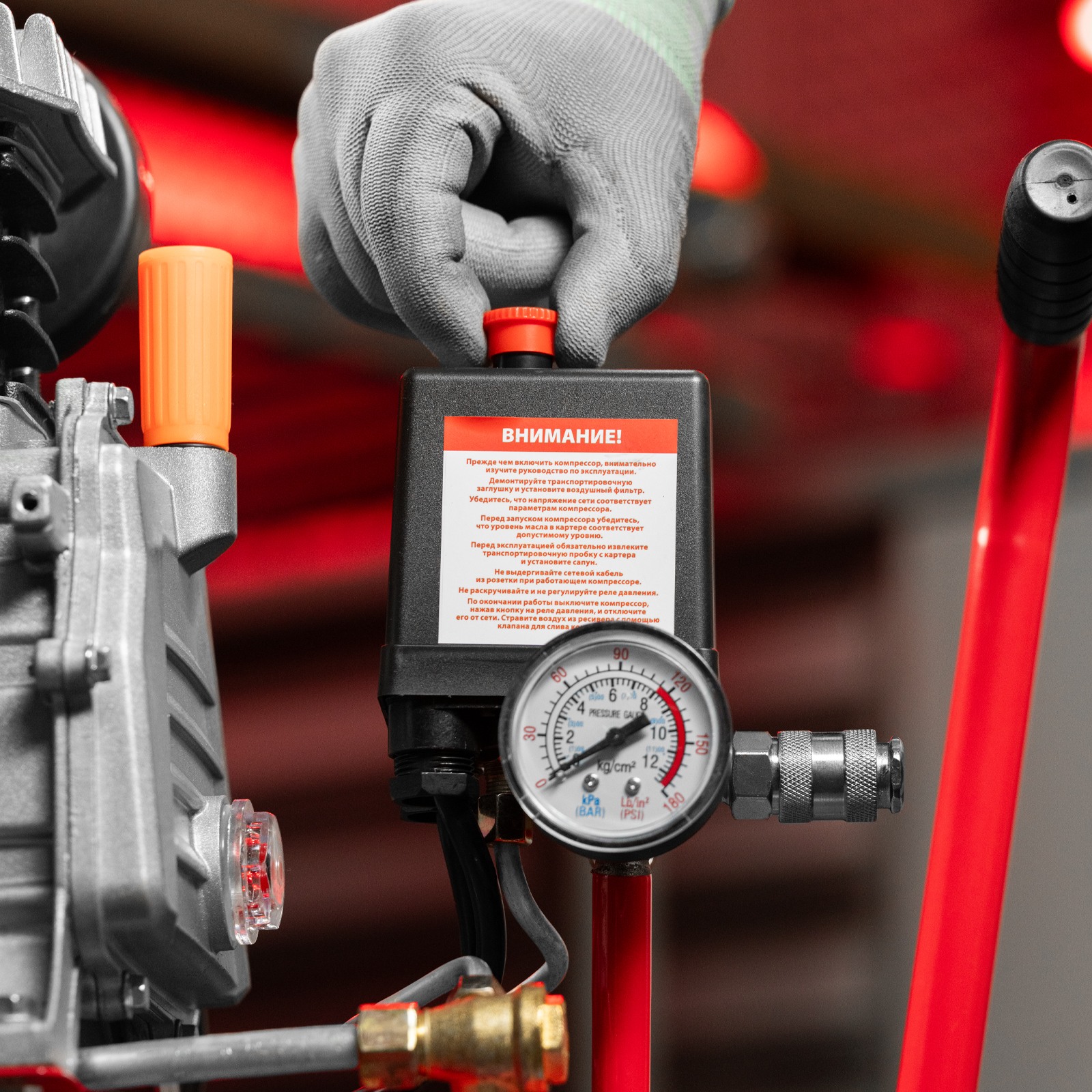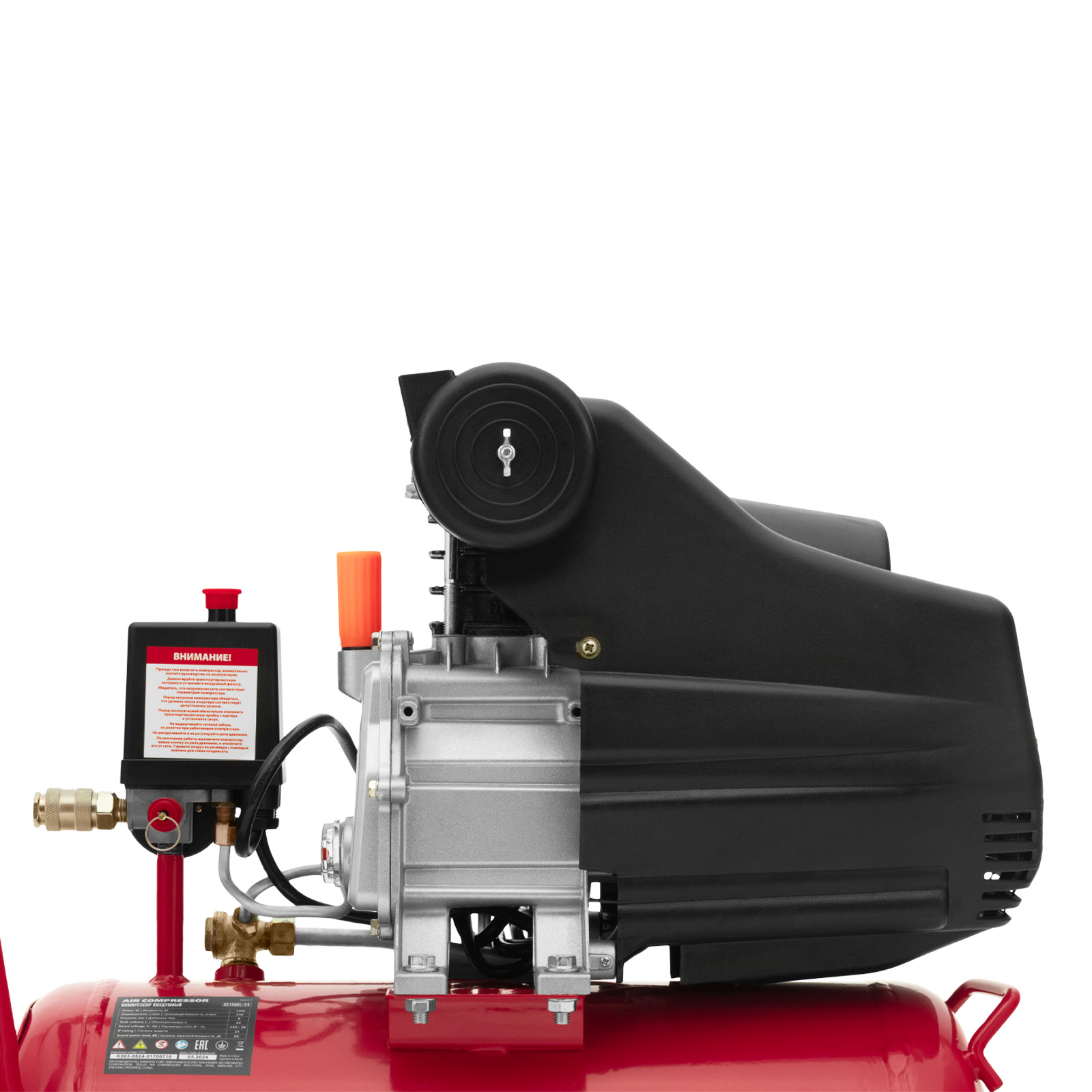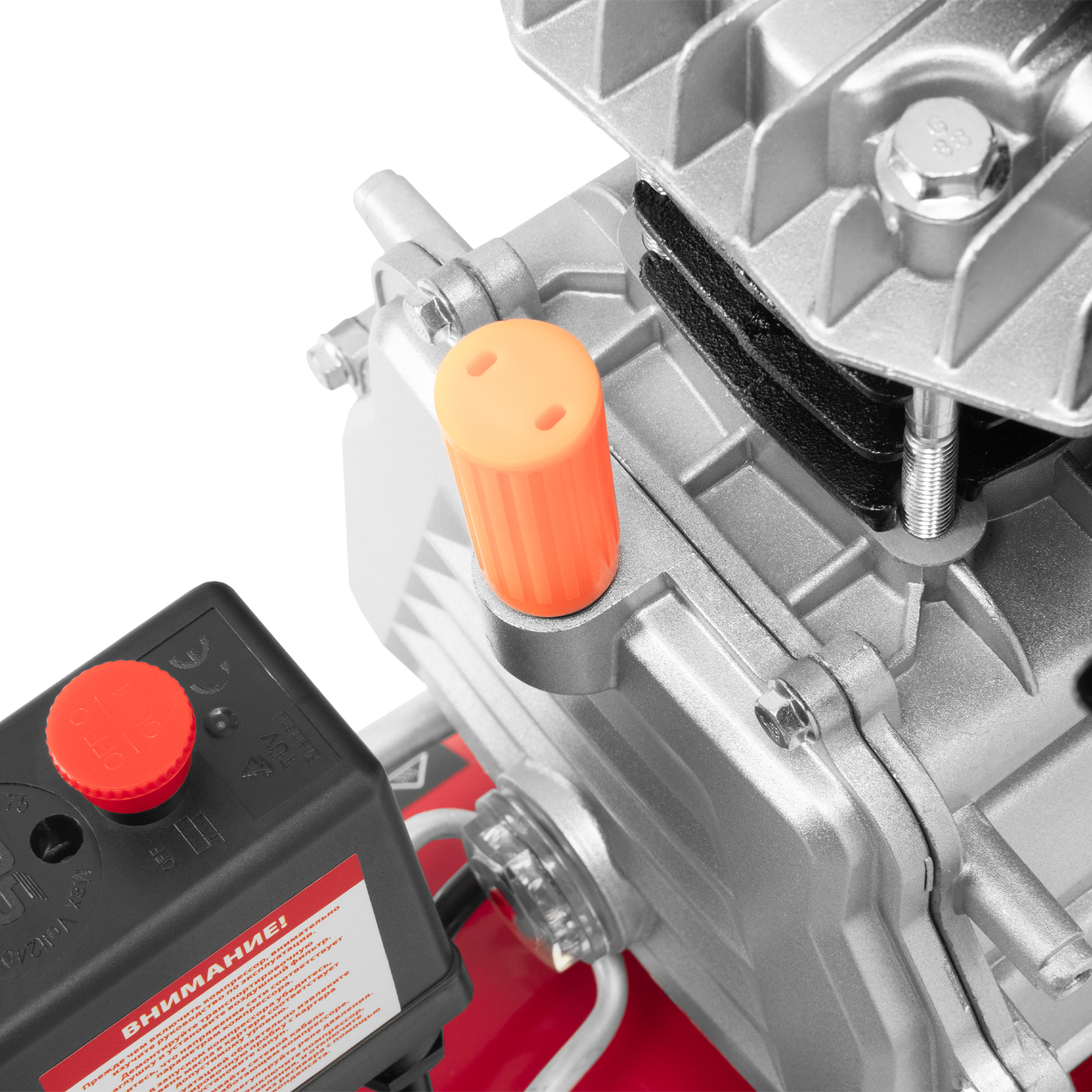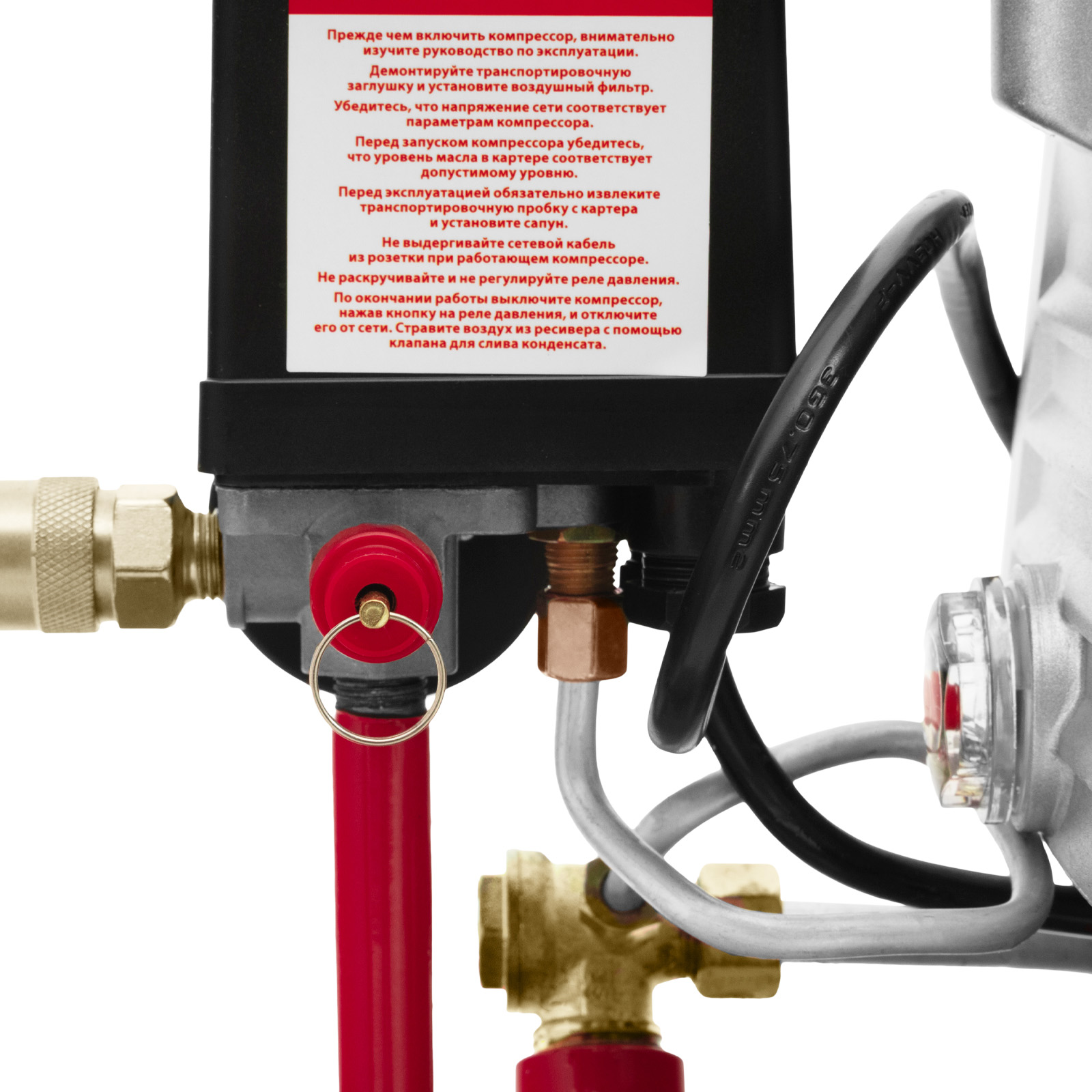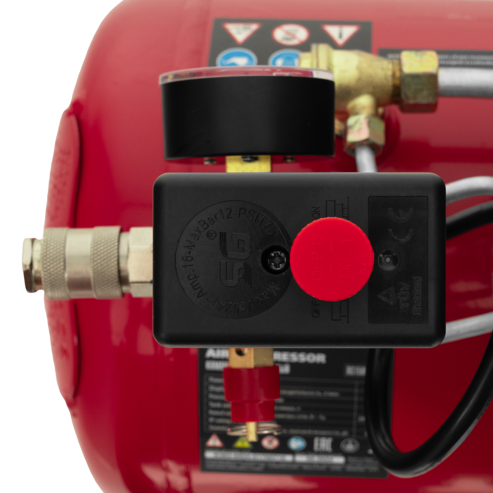 - Удобный контроль давления в ресивере — компрессор оснащен механическим манометром.