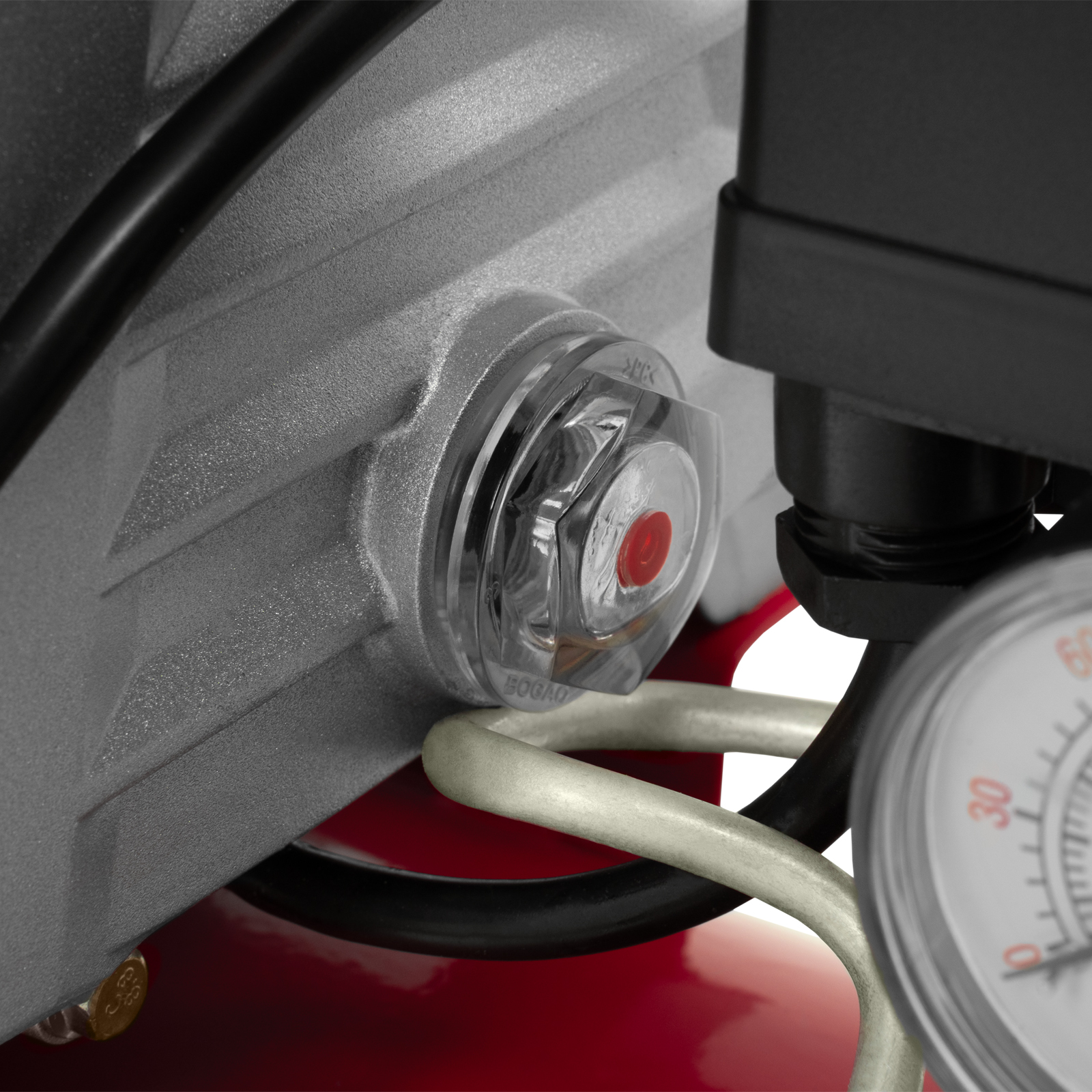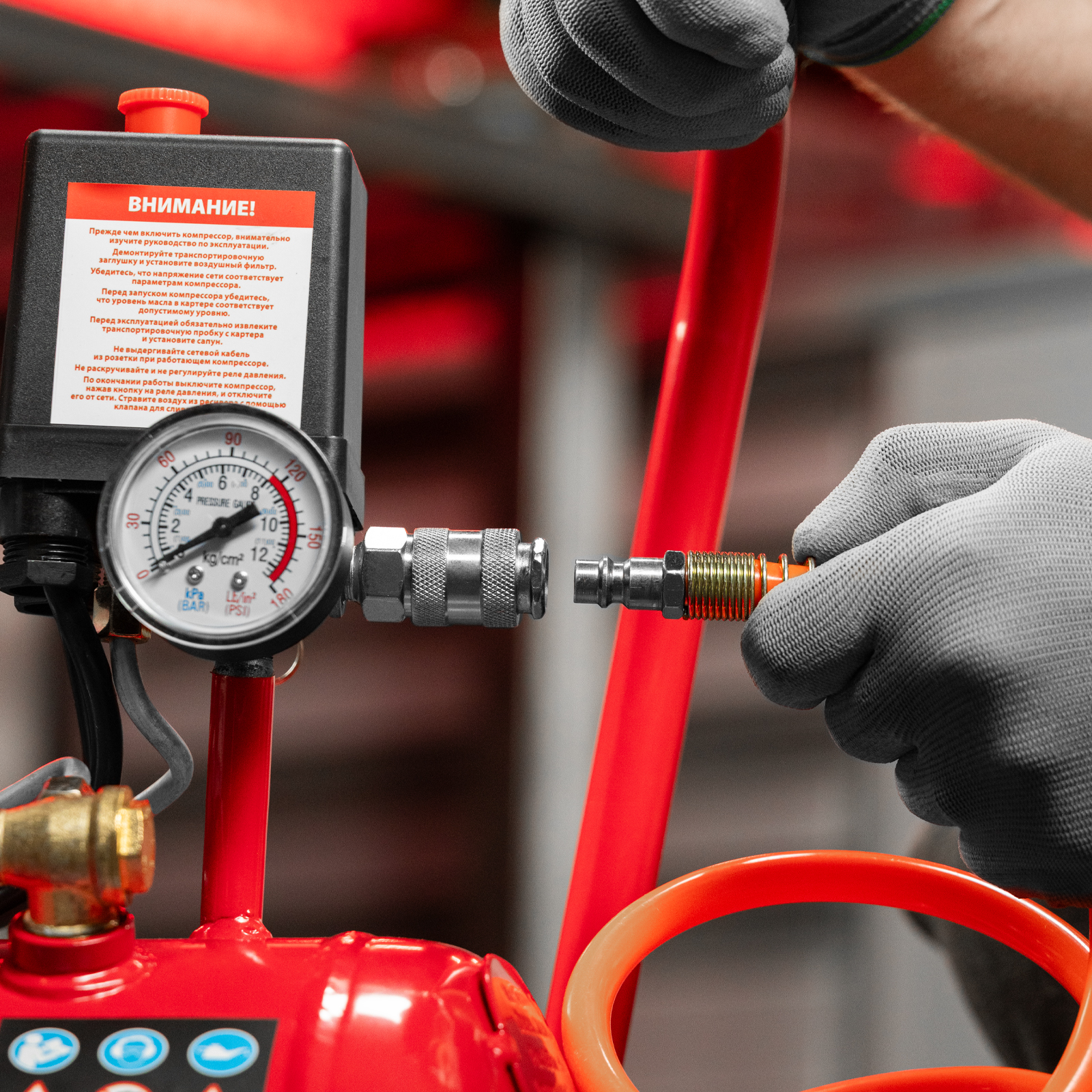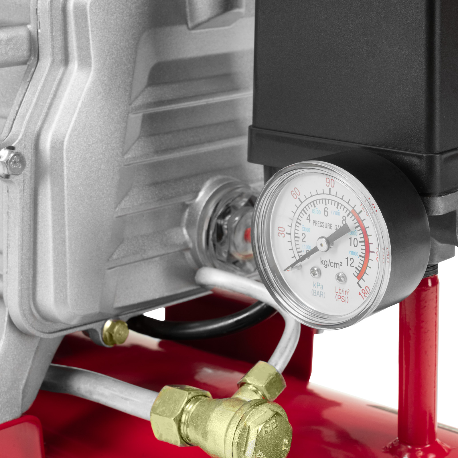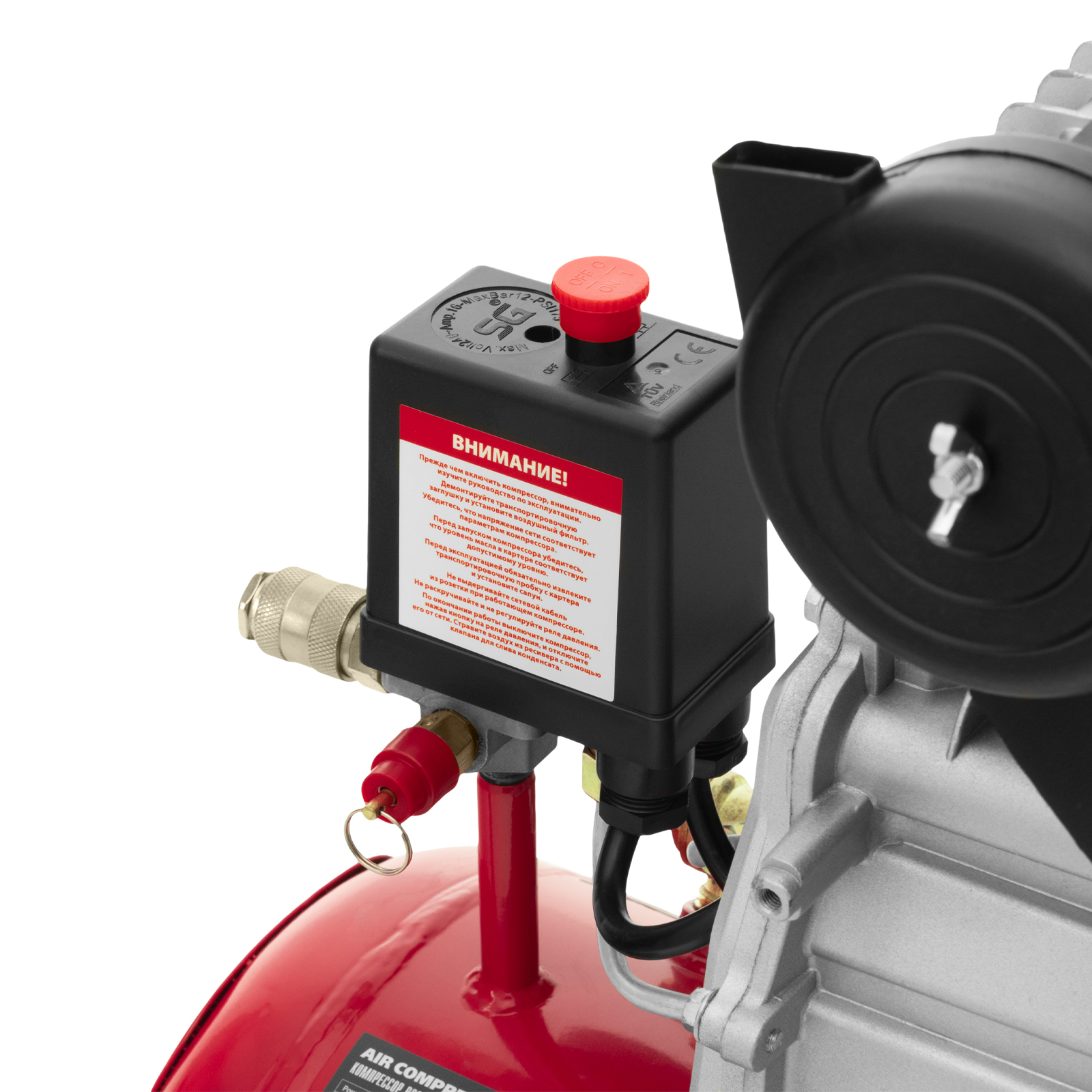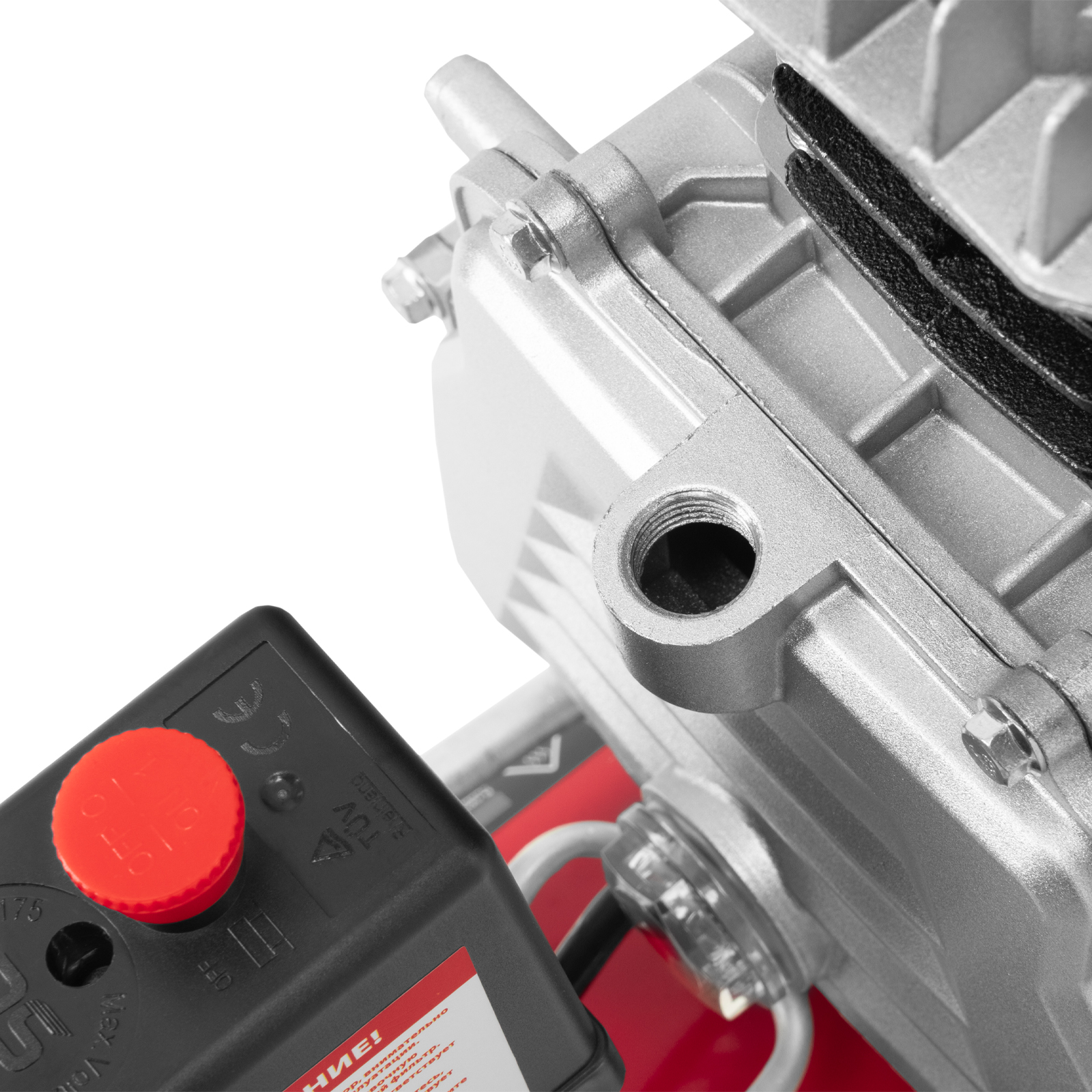 - Удобный контроль давления в ресивере — компрессор оснащен механическим манометром.