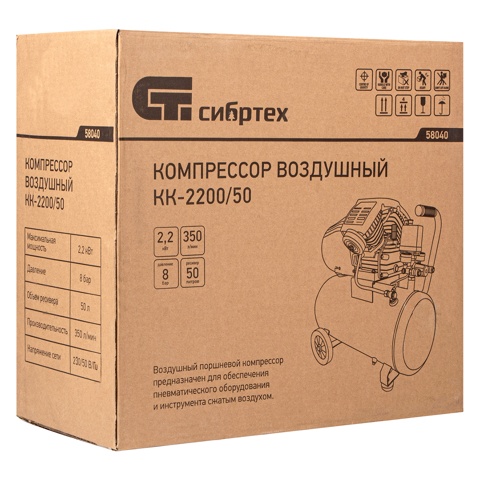 Универсальный передвижной компрессор идеально впишется в бытовые условия, автосервис, гараж, строительную площадку, небольшое производство. Его подключают к пневмоинструментам, например, к гайковерту или продувочному пистолету.,Устройство способно выработать за 1 час 350 л сжатого воздуха. Показатель мощности увеличен до 2.2 кВт, а объем ресивера составляет 50 литров. Двухцилиндровая компоновка, увеличенный магнитопровод статора и автоматизированная намотка двигателя позволили увеличить производительную мощность и достичь высокого рабочего потенциала.,Производитель предусмотрел систему защиты двигателя. Кожух из прочного пластика препятствует попаданию пыли и посторонних частиц в основной узел, сохраняет его от поломок. Системы защиты по току и от перегрева автоматически отключает систему при скачках напряжения и превышении нормальной температуры двигателя.,Еще одно преимущество компрессора — дополнительная обработка картера, которая обеспечивает плотное прилегание прокладок и защиту от протечек масла.