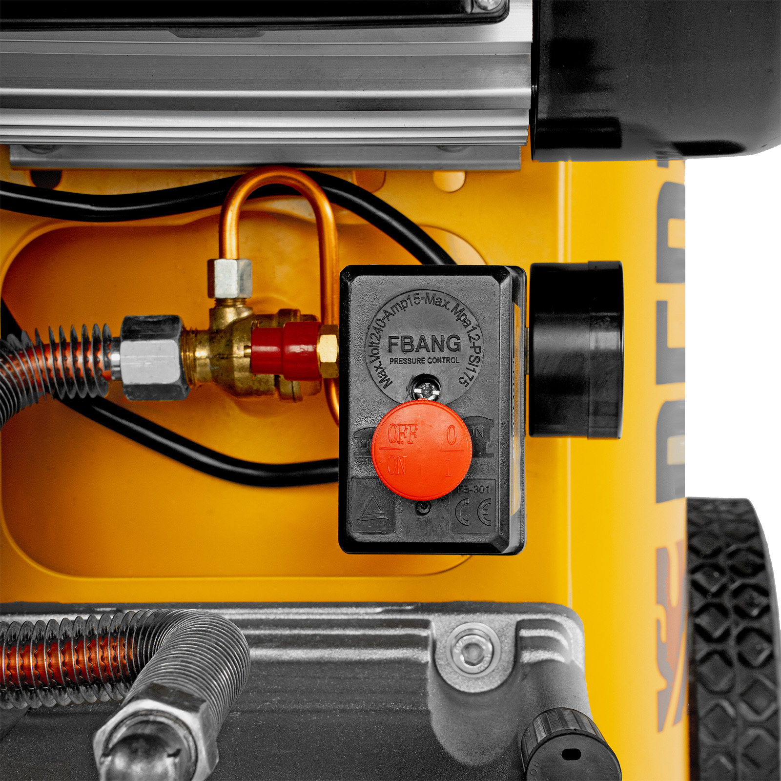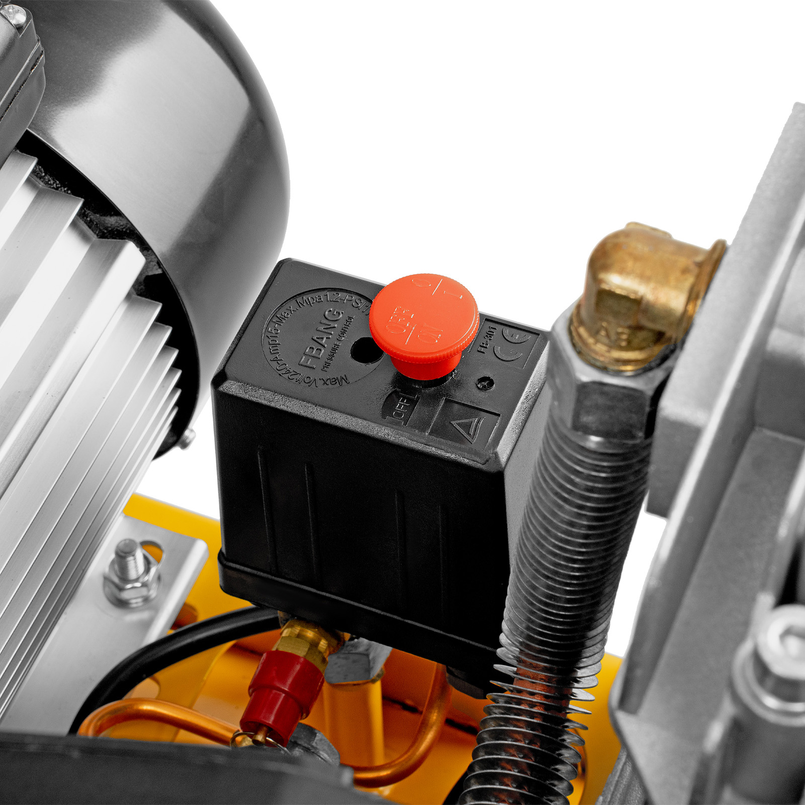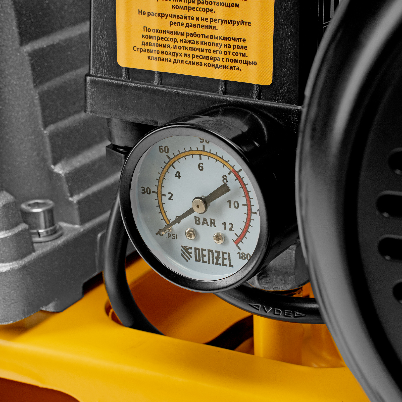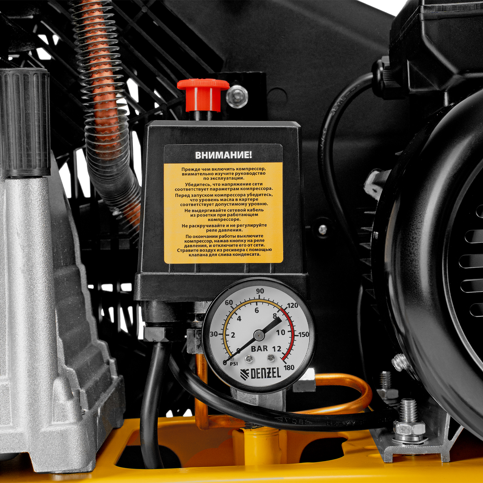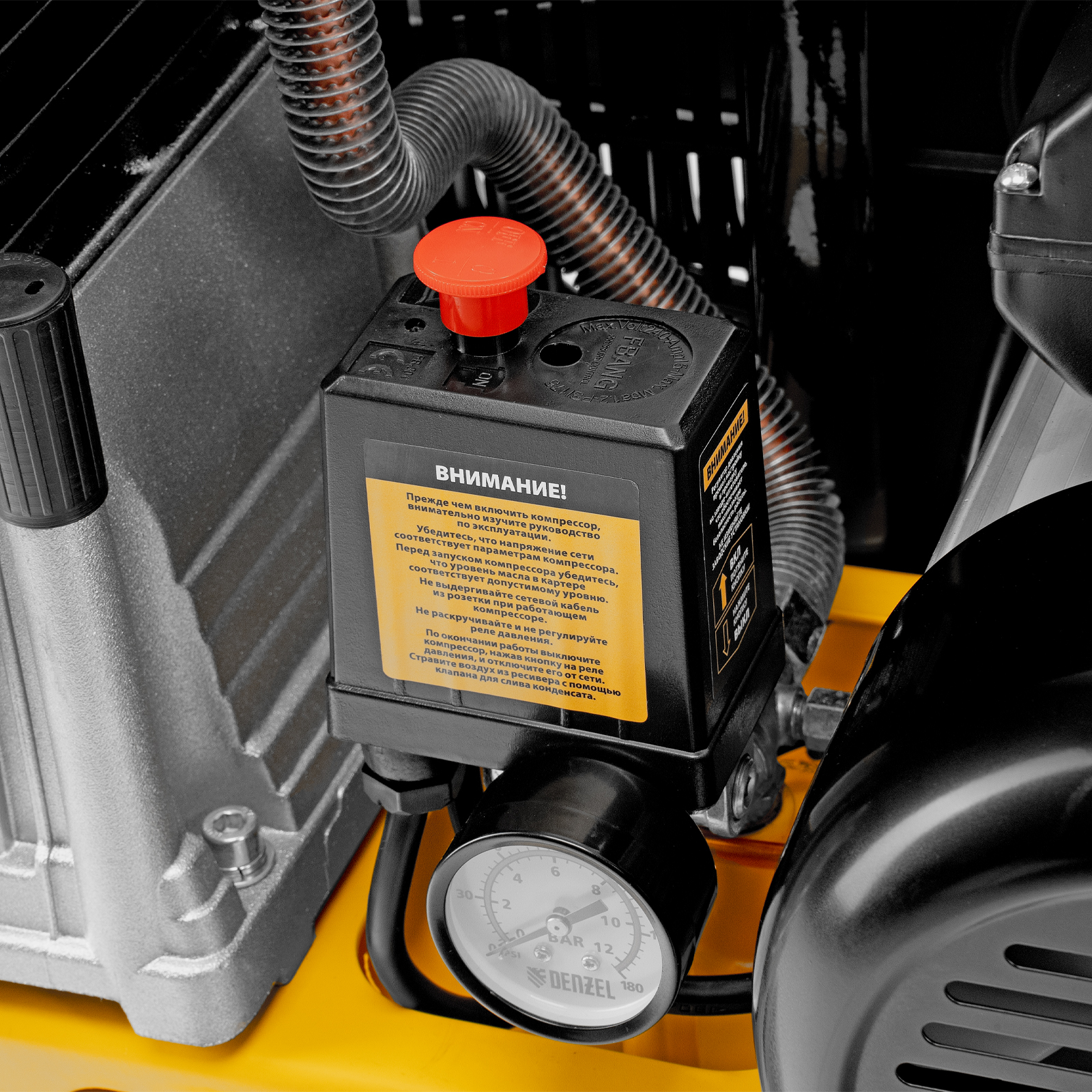 - Автономная работа — прессостат останавливает компрессор по достижении максимального рабочего давления 8 бар и запускает его, если давление падает ниже допустимого уровня.