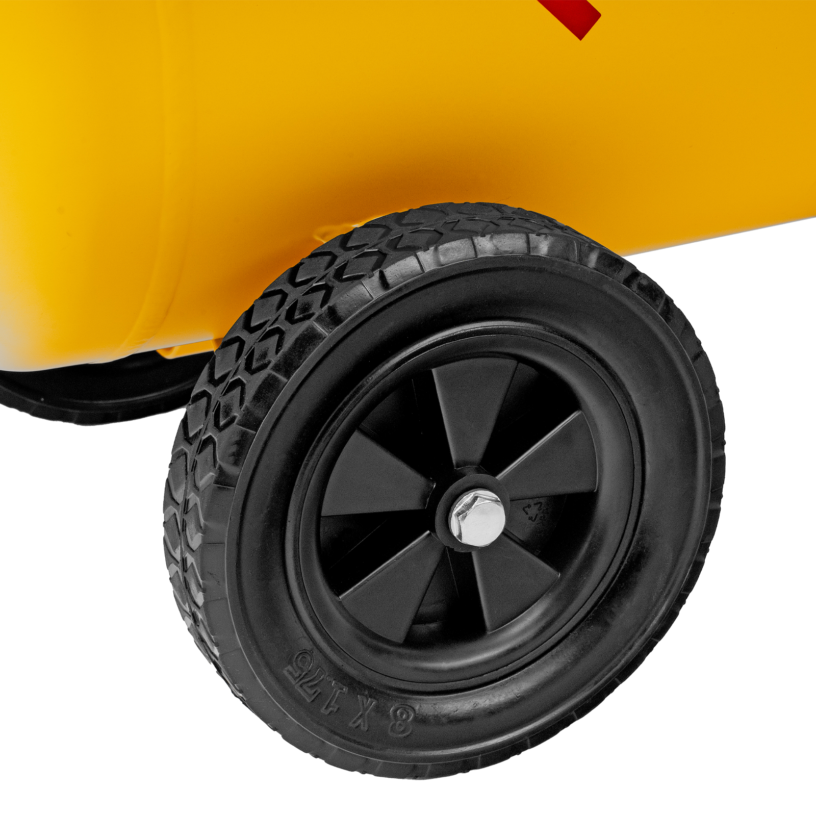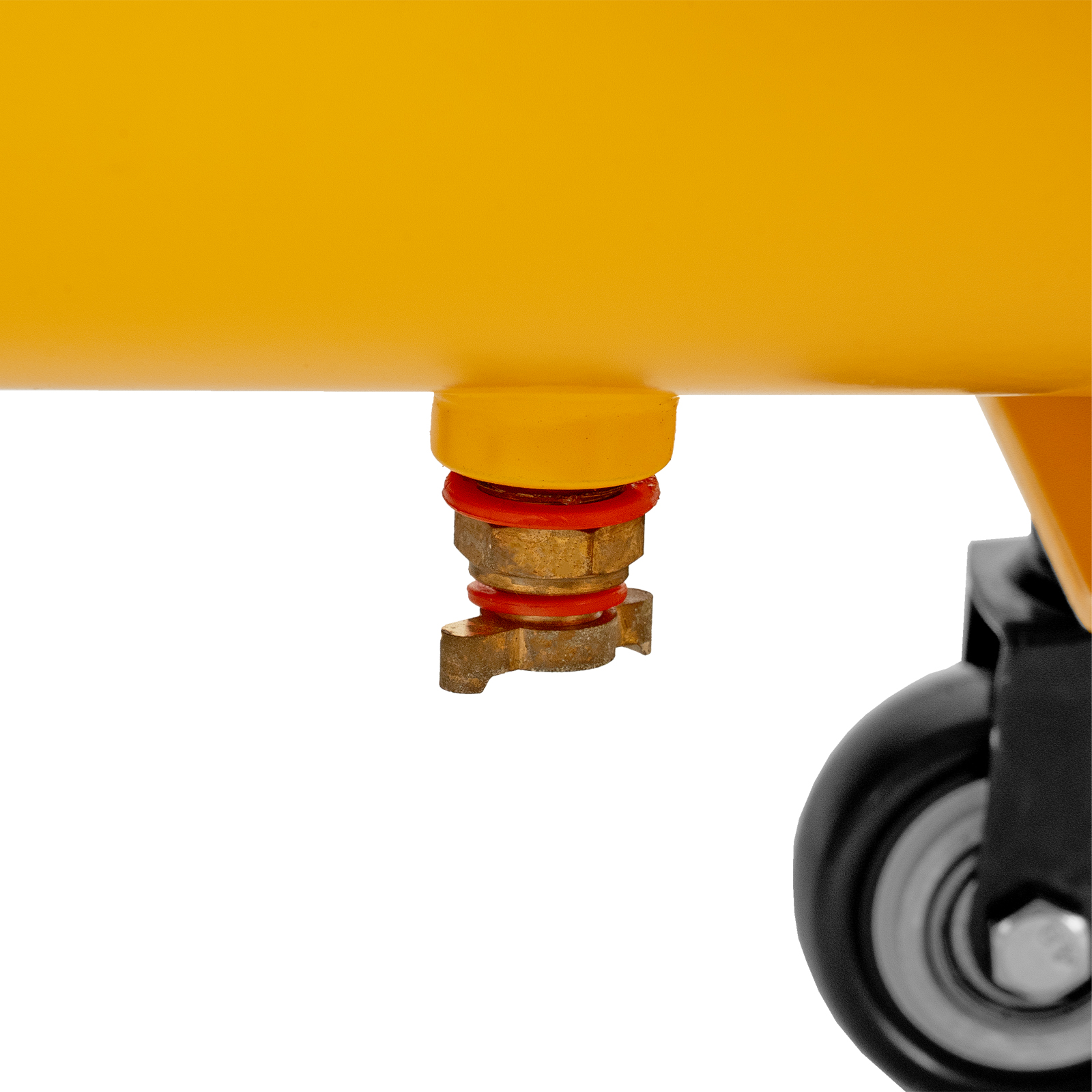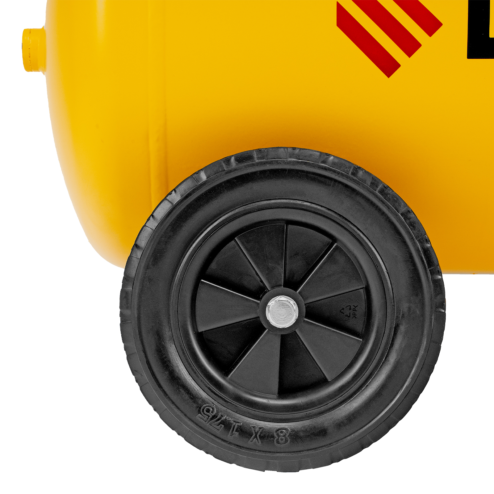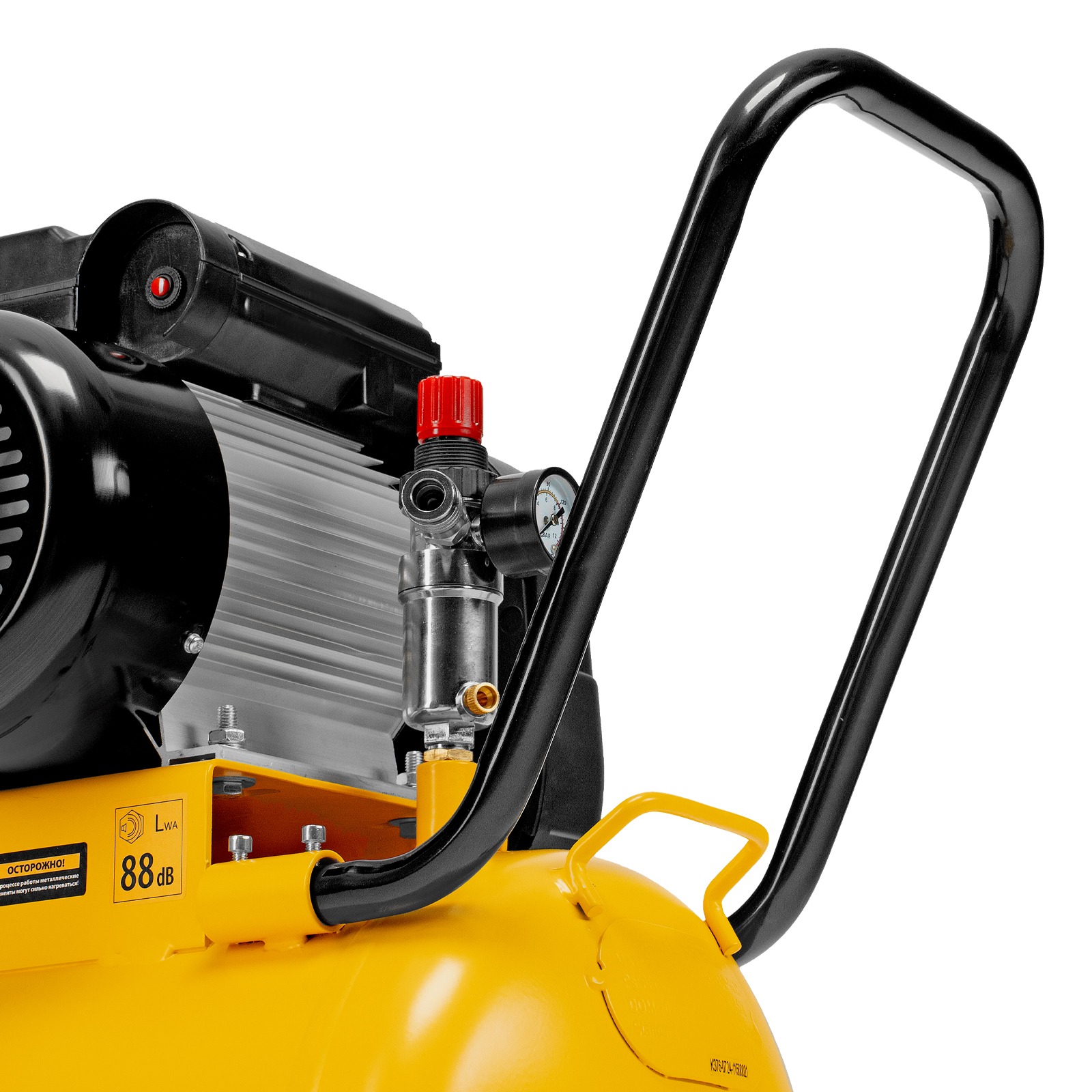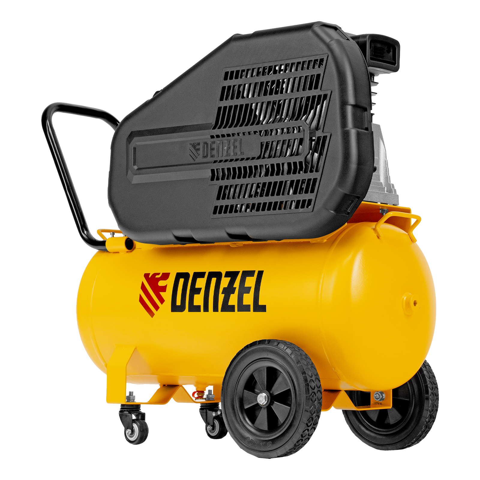 - Удобная транспортировка — на компрессоре установлены колеса, в т. ч. поворотные, и П-образная рукоятка.