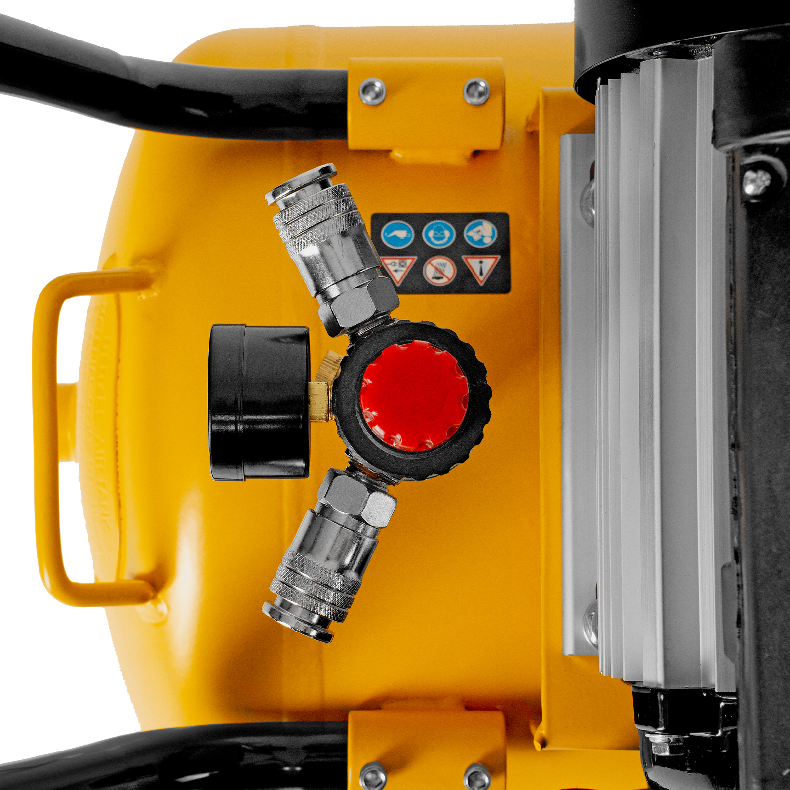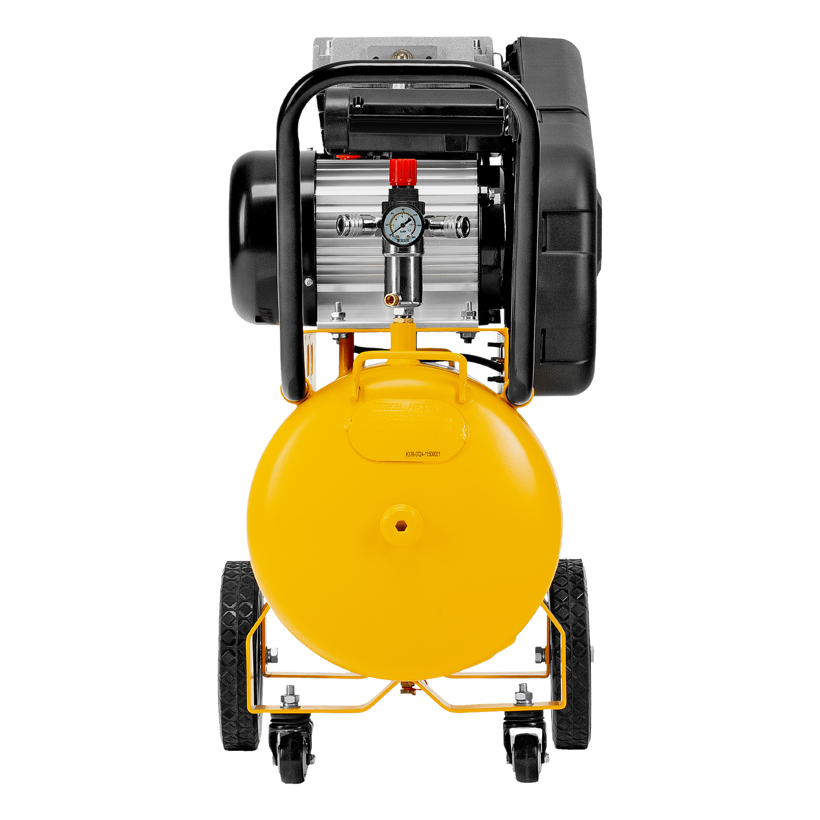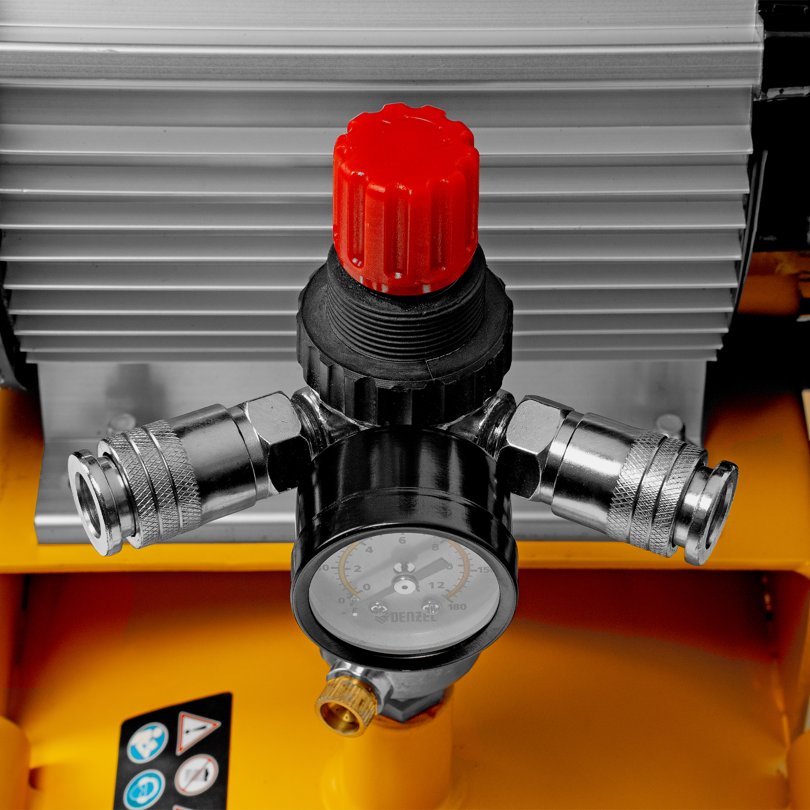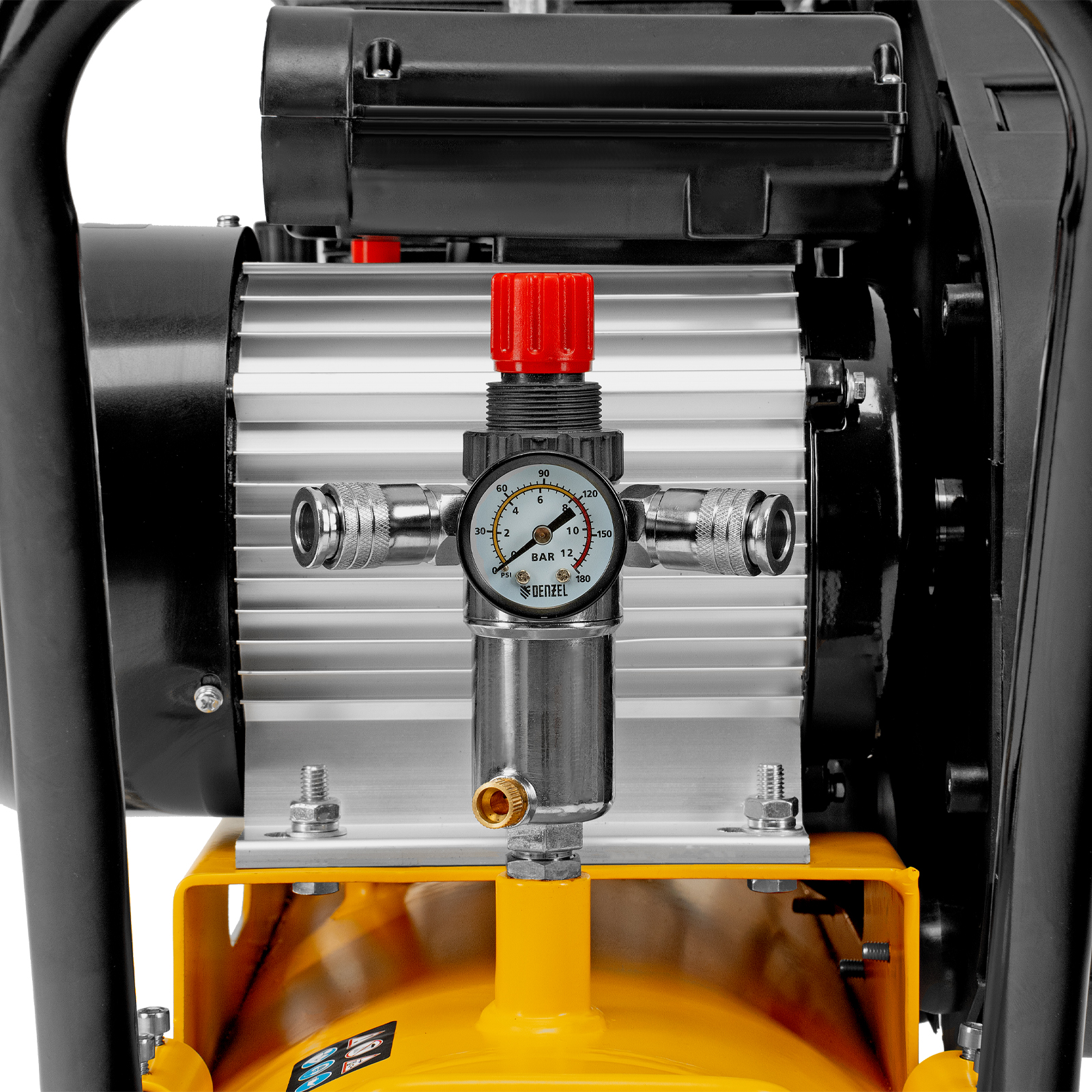 - Удобный контроль давления в ресивере и пневмомагистрали — компрессор оснащен двумя механическими манометрами.