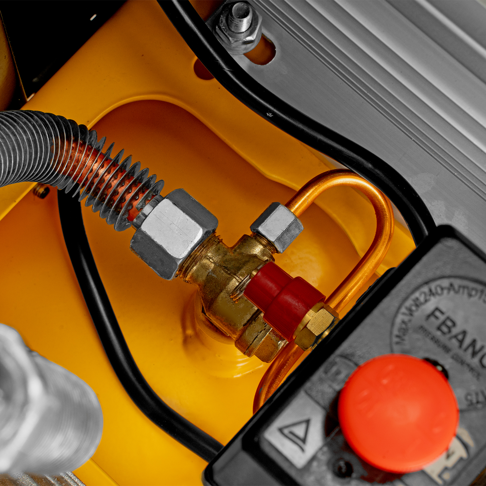 - Безопасность — в случае превышения максимально допустимого давления в ресивере срабатывает предохранительный клапан.