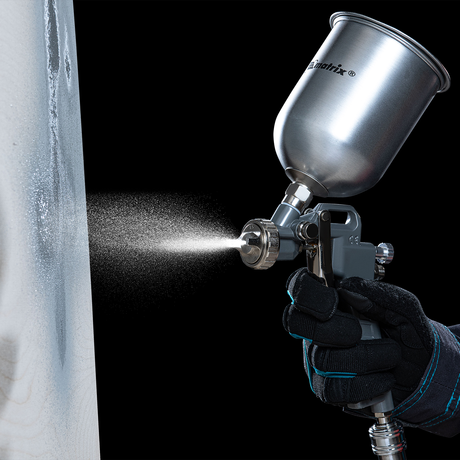 Пневматический краскораспылитель Matrix 57314 с верхним бачком объемом 0,6 л и соплами диаметром 1,2, 1,5 и 1,8 мм используется для окрашивания поверхностей и нанесения защитных составов. Он может работать с различными составами, такими как шпаклевка, лак и краска, т. к. в комплекте идет набор сменных сопел различного диаметра. Краскораспылитель пригодится в автосервисе или на стройке, а также на мебельном производстве для обработки дерева лаком.