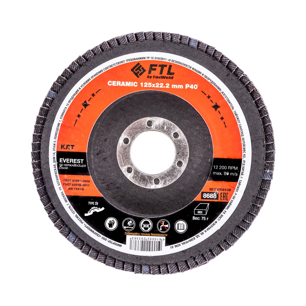 Круг лепестковый с керамическим абразивом для шлифования по нержавеющей стали FTL Everest 29 125 х 22,2 мм P40
