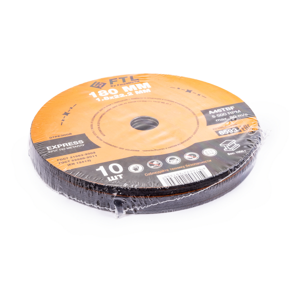 Диск отрезной по металлу FTL Express 180 х 1,8 х 22,2 мм A46TBF - расходный инструмент для ручной угловой шлифовальной машины, предназначенный для резки различных изделий из чёрных металлов (чугунов). Конструктивно представляет собой плоский диск (тип 41), поверхность которого покрыта слоем абразивных частиц. Посыпка скреплена между собой бакелитовой связкой и армирована одной стекловолоконной сеткой и тканой подложкой. Поставляется во влагозащитной упаковке. Серия EXPRESS представляет абразивный состав высокой твёрдости, оптимизированный для скоростного реза чёрных металлов. Не рекомендуется для реза изделий из нержавеющей стали во избежание перегрева, прижога, окисления, потери эффективности легирующих добавок.ИЗНОСОСТОЙКОСТЬ: Благодаря премиальной формуле режущая и шлифовальная способность абразива снижается в процессе работы значительно медленнее, позволяя выполнить больше работы.УНИКАЛЬНЫЙ СОСТАВ: Технология производства включает в себя эксклюзивный рецепт абразива и смол: применение только твёрдых составов класса ВТ1, ВТ2, армирование сеткой из стекловолокна. Высокая твёрдость связывающей смолы позволяет сделать значительно большее количество резов по сравнению с кругами с обычным абразивом.МЕТАЛЛИЧЕСКОЕ КОЛЬЦО: Металлическое кольцо на диске обеспечивает плотную посадку на фланец УШМ, исключая биения и вибрацию при работе.ГЕРМЕТИЧНОСТЬ УПАКОВКИ: Диски упакованы в специальную термоусадочную герметичную плёнку, которая предохраняет от пыли и влаги при длительном хранении в условиях повышенной влажности, на строительных объектах и крупных промышленных производствах.ПРЕИМУЩЕСТВА:По чёрному металлу (!)Тип 41 (плоский)Быстрый резСостав на базе оксида алюминияМеталлическое кольцо для плотной посадки на фланец УШМВысокая твёрдость составаВлагозащитная упаковкаКОМПЛЕКТАЦИЯ: Отрезной круг по чёрному металлу в термоусадочной плёнке со вкладышем – 10 шт.