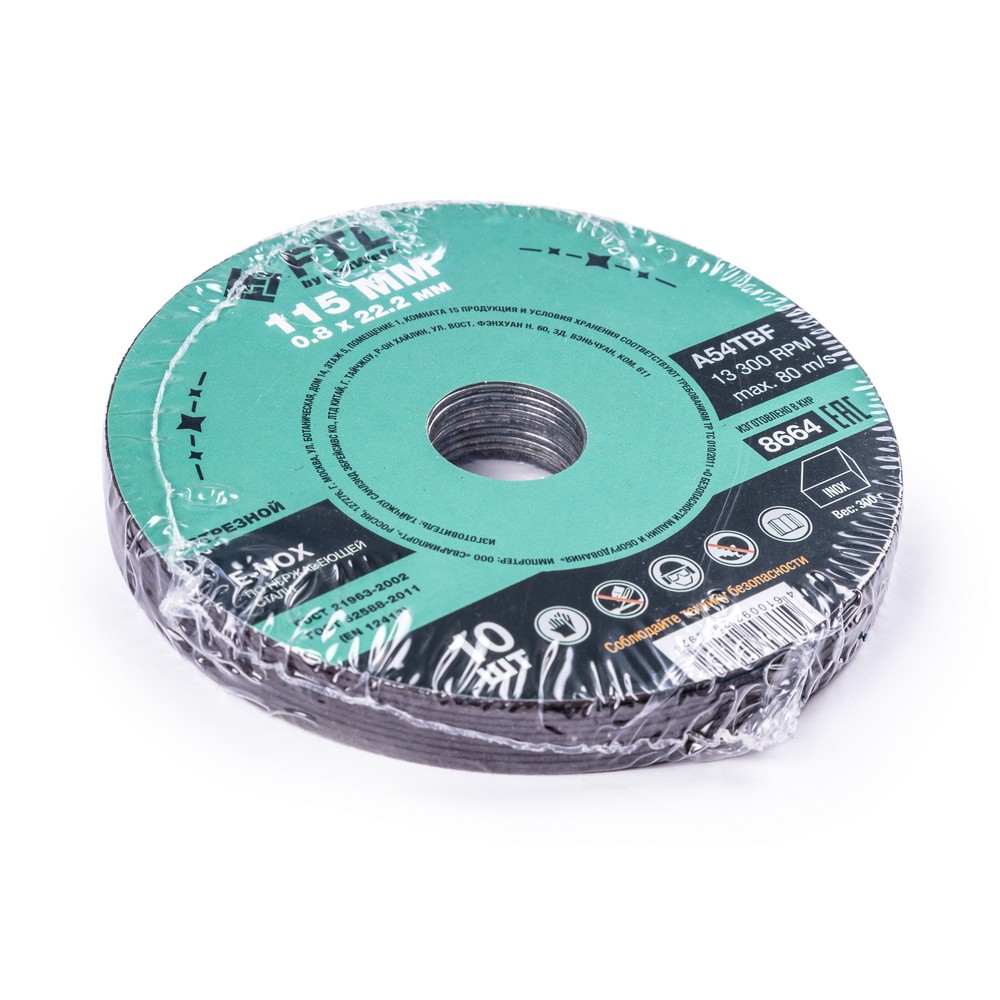 Диск отрезной по нержавеющей стали FTL E-Nox 115 х 0,8 х 22,2 мм A54TBF – это расходный инструмент для ручной угловой шлифовальной машины, предназначенный для резки деталей и конструкций, профиля и листового металла из нержавеющих и легированных сталей. Конструктивно представляет собой плоский диск (тип 41), поверхность которого покрыта слоем абразивных частиц. Посыпка скреплена между собой бакелитовой связкой и армирована одной стекловолоконной сеткой и тканой подложкой. Поставляется во влагозащитной упаковке. Серия E-NOX - новый специализированный абразивный компаунд для работы по изделиям из нержавеющей стали. Оксид циркония с лучшей теплопроводностью эффективно отводит тепло из зоны реза, противостоит прижогу и перегреву, сохраняя легирующие свойства нержавеющей стали. Минимальные значения железа, серы и хлора в составе абразива гарантируют защиту от окисления. Не рекомендуется к работе с изделиями из чёрных металлов из-за недостаточной износостойкости (увеличенного расхода материала диска при работе).УВЕЛИЧЕННАЯ СКОРОСТЬ РЕЗА: Компаунд на базе оксида циркония не перегревает, не окисляет, не искрит, не дымит, при этом демонстрируя высокий результат по количеству резов и скорости работы по сравнению с составами абразива общего значения.ВЫСОКОКАЧЕСТВЕННЫЙ ОКСИД ЦИРКОНИЯ: Серия E-NOX – это новый, узко специализированный состав для работы по нержавеющей стали, титану и меди. Благодаря присутствию оксида циркония в составе компаунда, круги не перегревают материалы, сберегая заготовки от побежалостей, посинений, окислений, при этом демонстрируя высокие результаты по количеству резов и скорости работы. Комфортный и мягкий рез по нержавейке.УНИКАЛЬНЫЙ СОСТАВ: Технология производства включает в себя эксклюзивный рецепт абразива и смол: применение только твёрдых составов класса ВТ1, ВТ2, армирование сеткой из стекловолокна. Высокая твёрдость связывающей смолы позволяет сделать значительно большее количество резов по сравнению с кругами с обычным абразивом.МЕТАЛЛИЧЕСКОЕ КОЛЬЦО: Металлическое кольцо на диске обеспечивает плотную посадку на фланец УШМ, исключая биения и вибрацию при работе.ГЕРМЕТИЧНОСТЬ УПАКОВКИ: Диски упакованы в специальную термоусадочную герметичную плёнку, которая предохраняет от пыли и влаги при длительном хранении в условиях повышенной влажности, на строительных объектах и крупных промышленных производствах.ПРЕИМУЩЕСТВА:По нержавеющей и легированной сталиОксид циркония (не перегревает материалы)Минимальное содержание железа, серы, хлора (не окисляет материалы)Тип 41 (плоский)Увеличенный срок службыФибергласс – прочное стекловолоконное основание дискаМеталлическое кольцо для плотной посадки на фланец УШМВлагозащитная упаковкаКОМПЛЕКТАЦИЯ: Отрезной круг по чёрному металлу в термоусадочной плёнке со вкладышем – 10 шт.
