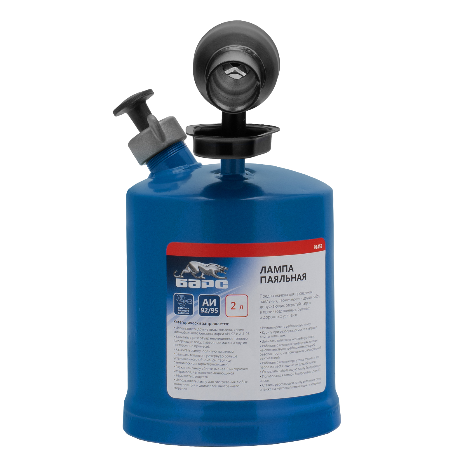 Паяльная лампа Барс 91452 с объемом бака 2 л предназначена для нагрева поверхностей при помощи открытого направленного пламени. Полной заправки 1,5 л топлива хватает больше чем на час работы при расходе 1,2 л/ч. Устройство используется для выполнения ремонтных и демонтажных работ — для пайки, термообработки деталей, установки термоусадочных трубок, снятия лакокрасочного покрытия. Также лампа будет полезна в сельском хозяйстве и в быту.