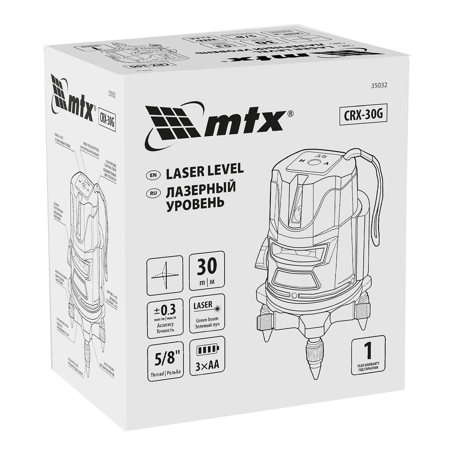 Лазерный уровень MTX CRX-30G 35032 с зеленым лучом, резьбой под штатив 5/8″, в комплекте с батарейками, проецирует на поверхность горизонтальную, вертикальную линии или крест дальностью до 30 м. Используется при проведении бытовых ремонтно-строительных работ в помещениях. Погрешность измерений составляет всего лишь ±1,5 мм 5 м.