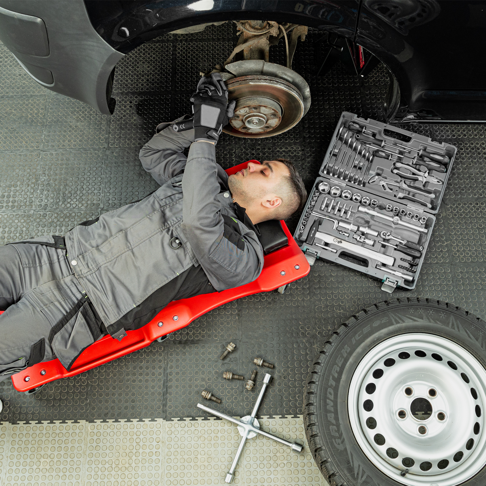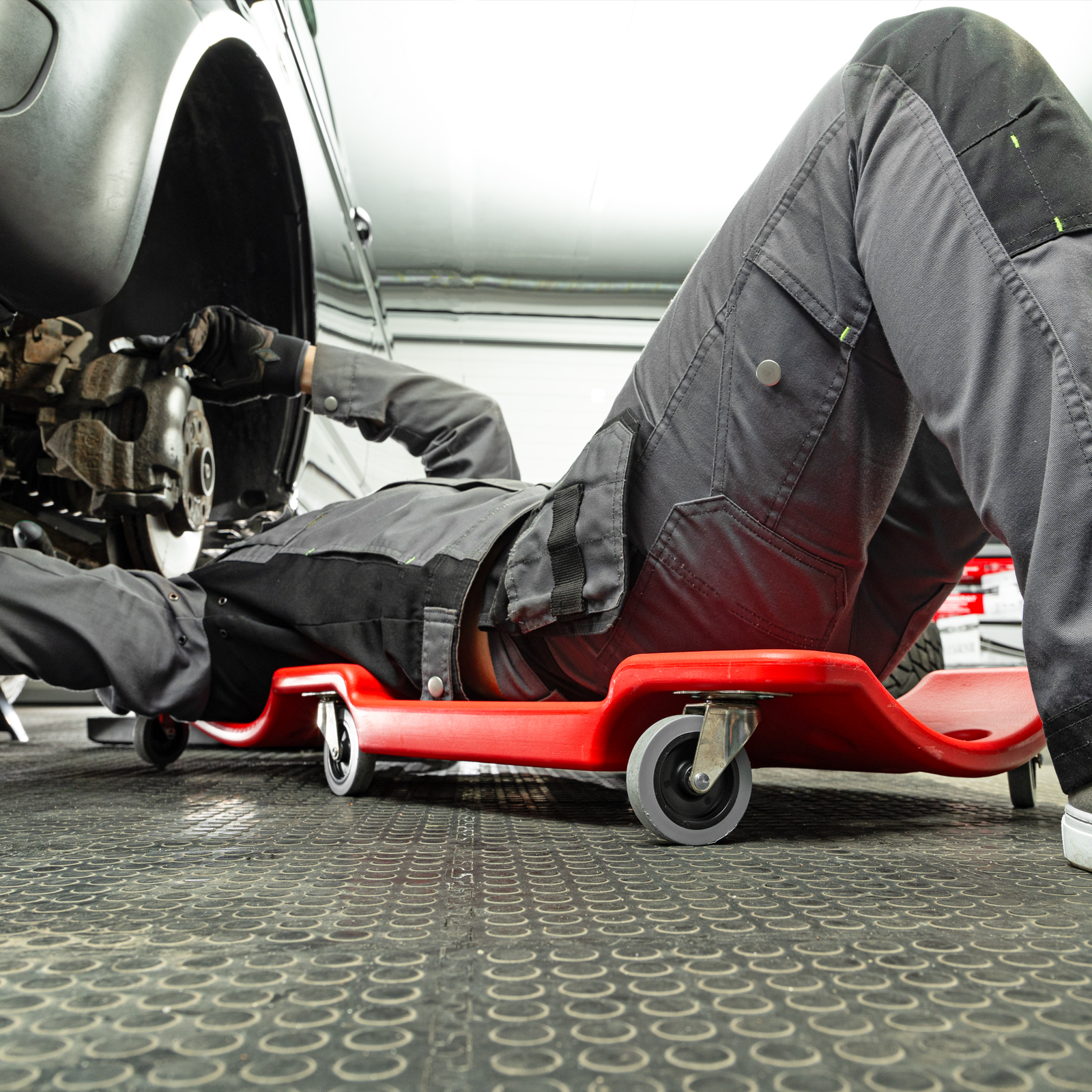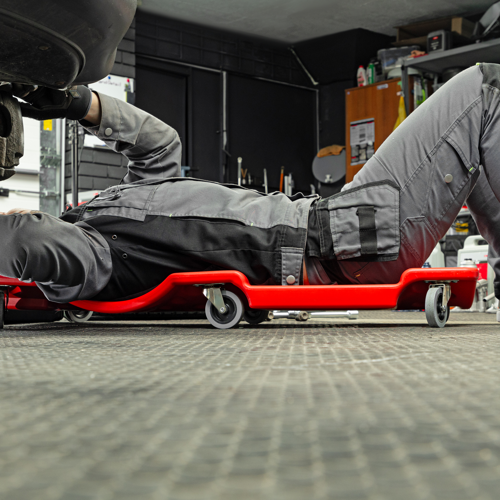 - Благодаря специальному отверстию на корпусе можно легко доставать лежак из-под автомобиля.