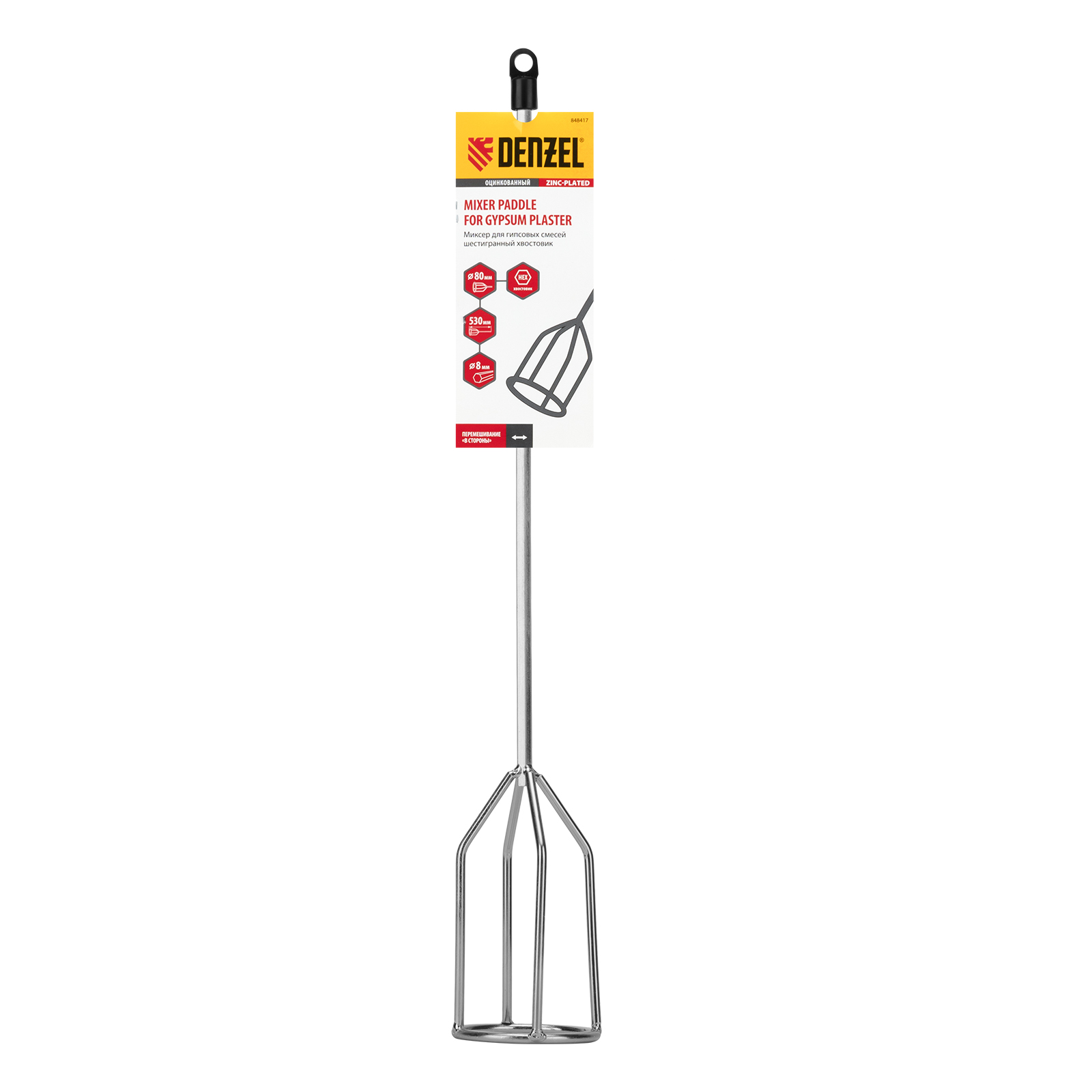 Оцинкованный миксер для гипсовых смесей Denzel 848417 диаметром 80 мм и длиной 530 мм, с шестигранным хвостовиком диаметром 8 мм — оснастка электроинструмента, которую применяют для перемешивания клеев, герметиков, заливочных компаундов, а также для наливных полов. Венчик с прямыми лопастями перемешивает раствор в горизонтальной плоскости, эффективно удаляя воздушные пузырьки и препятствуя образованию новых. Благодаря этому состав сохраняет свои эксплуатационные свойства. Насадка используется во время проведения строительных и отделочных работ.