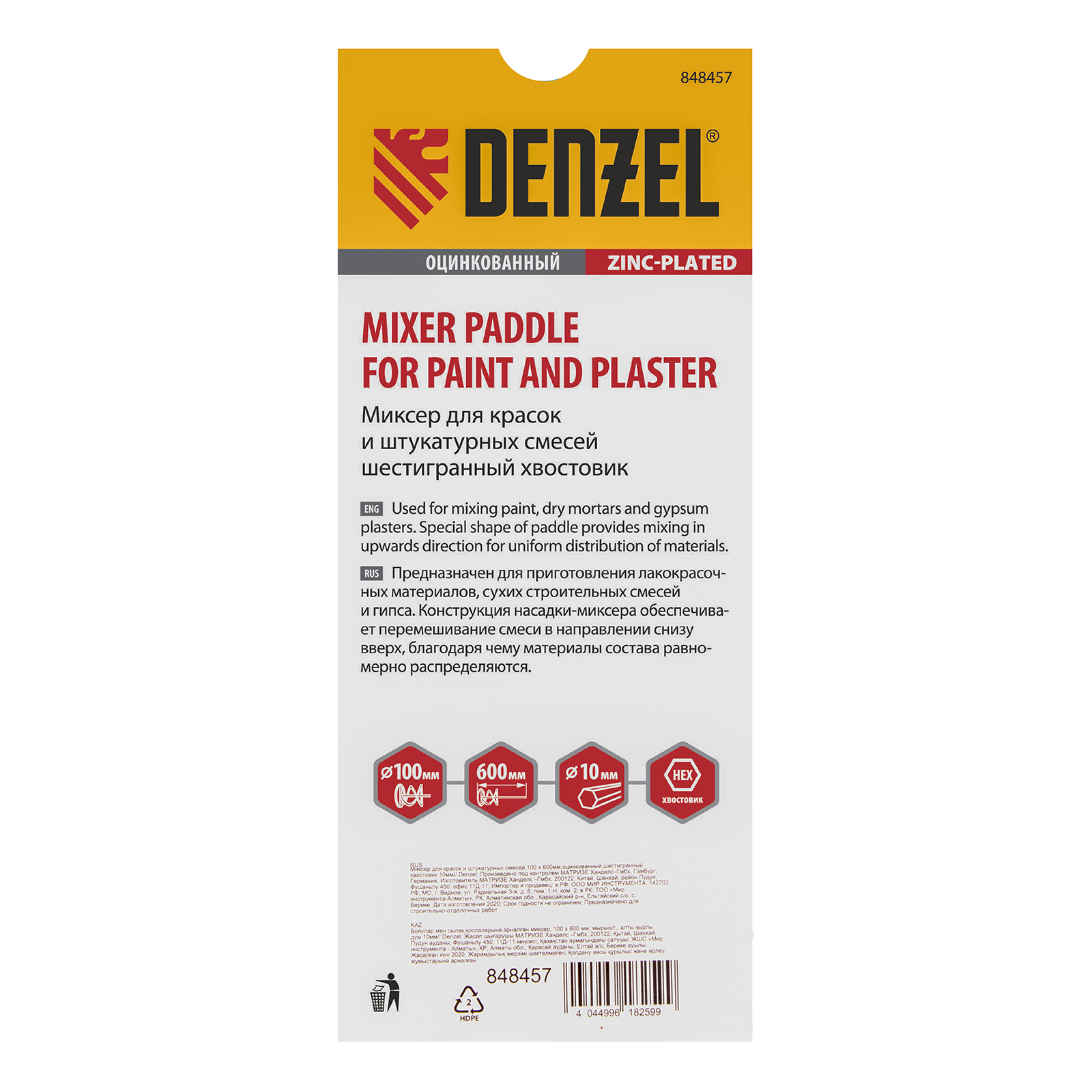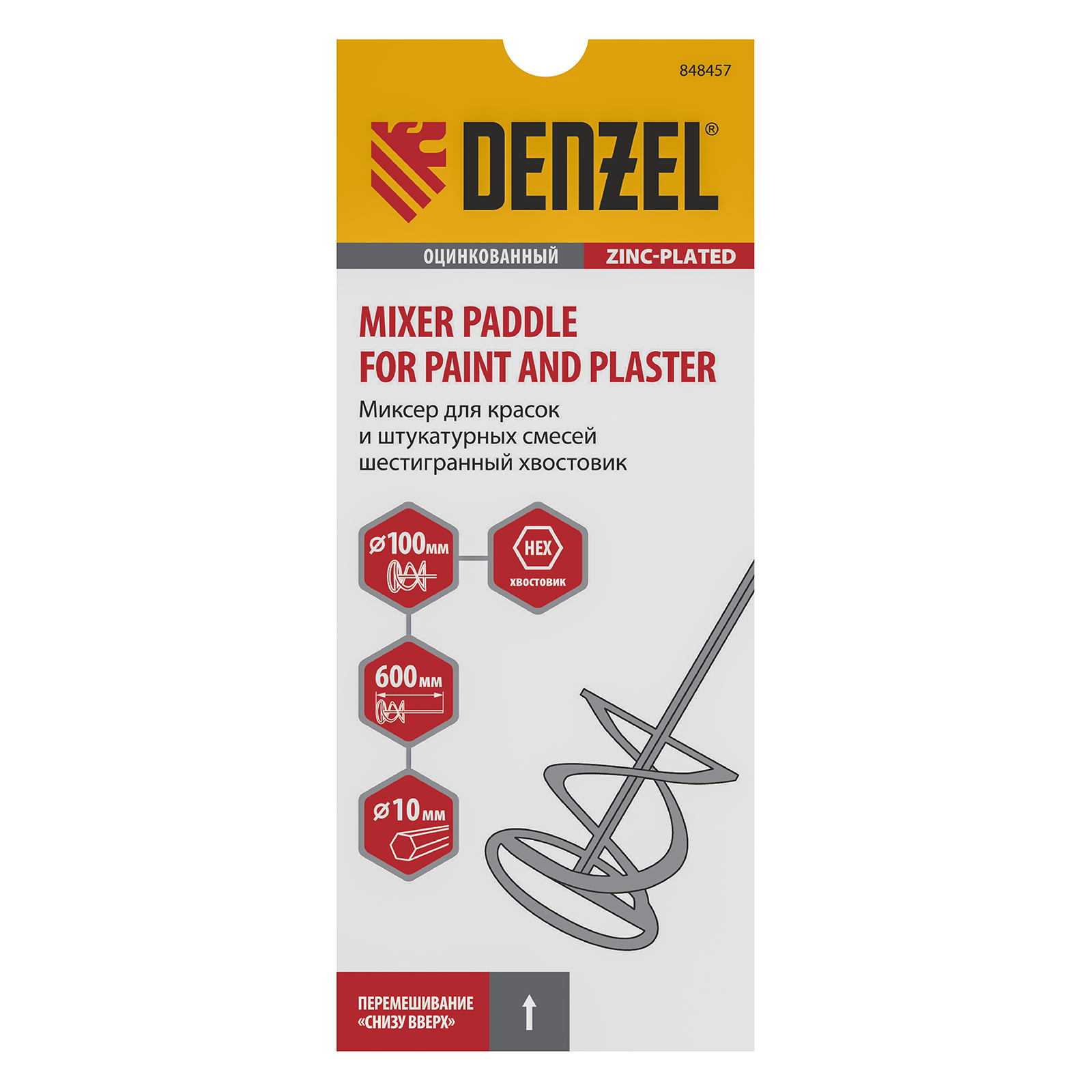 Миксер для красок и штукатурных смесей, 100 х 600 мм, оцинкованный, шестигранный хвостовик 10мм Denzel в Екатеринбурге