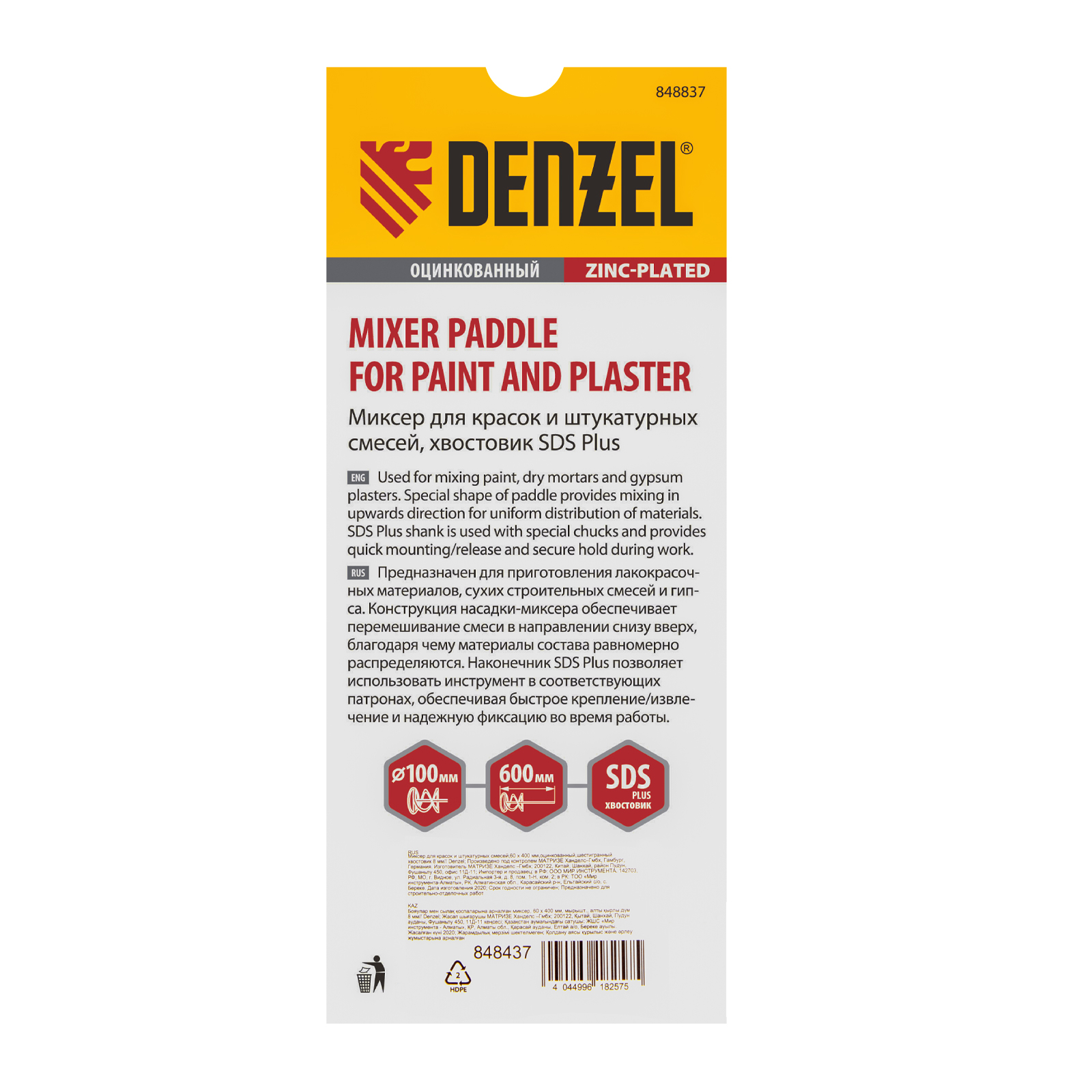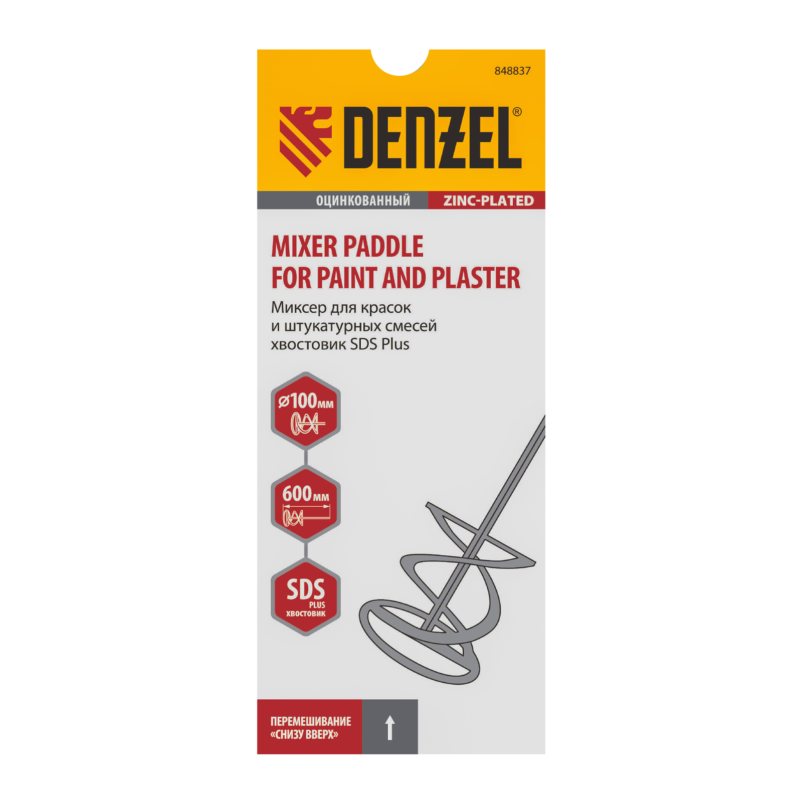 Миксер для красок и штукатурных смесей, 60 х 400 мм, оцинкованный, шестигранный хвостовик 8 мм Denzel в Екатеринбурге