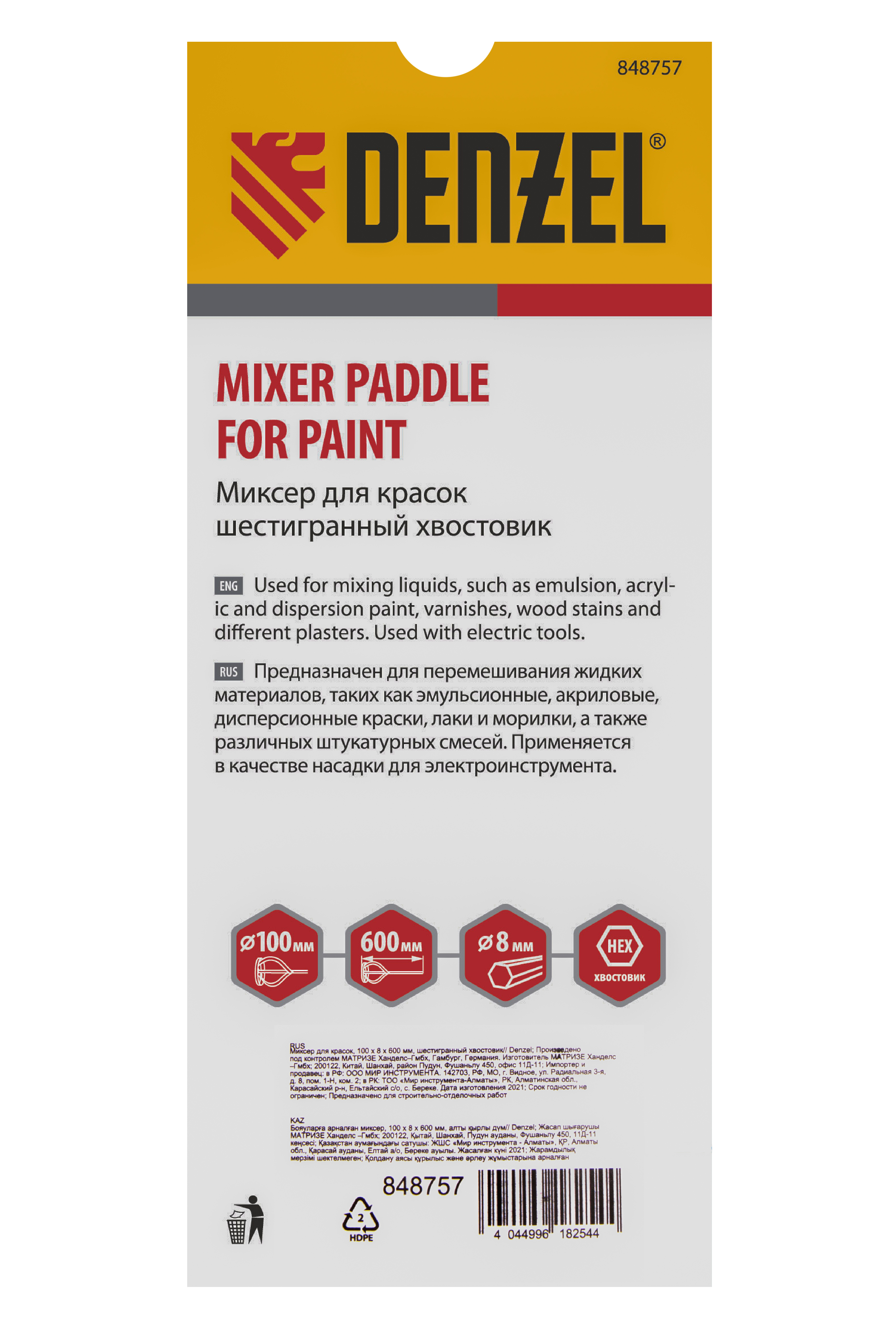 Миксер для красок, 100 х 8 х 600 мм, шестигранный хвостовик Denzel в Екатеринбурге