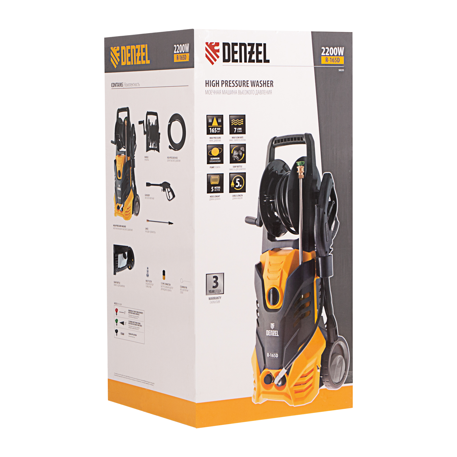 Колесная моечная машина высокого давления Denzel R-165D 58235 производительностью 7 л/мин, мощностью 2200 Вт, с максимальным давлением 165 бар, используется для мытья автомобилей, садового инвентаря, велосипедов, дорожек и заборов. Мощный мотор и помпа высокой производительности позволяют быстро справляться даже с серьезными загрязнениями. Если нет доступа к водопроводу, мойка может осуществлять забор воды из резервуара в режиме самовсасывания, теряя при этом всего 5% давления.
