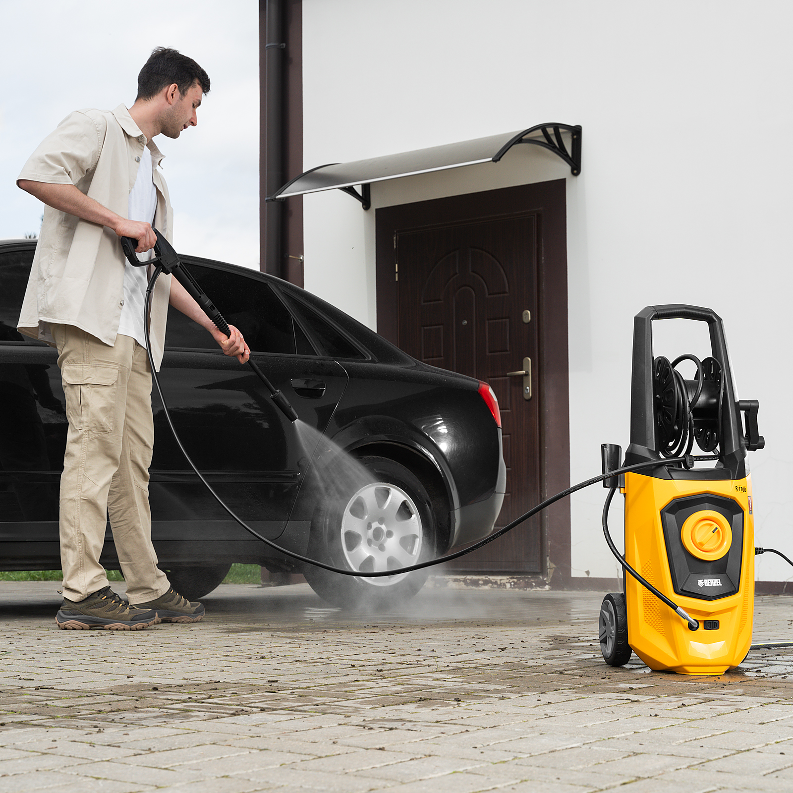 Моечная машина высокого давления Denzel R-170D 58229 с барабаном, мощностью 2000 Вт и производительностью 360 л/ч, подает струю воды под давлением 170 бар и используется для очищения поверхностей. Позволяет быстро удалить загрязнения с кузова автомобиля, мотоцикла, велосипеда, садового и хозяйственного инвентаря, очистить садовую дорожку и террасу, а также стены и окна строений. Источником воды может служить водопроводная линия, а также любая емкость — машина способна работать в режиме самовсасывания. Мойка пригодится владельцам загородных участков.