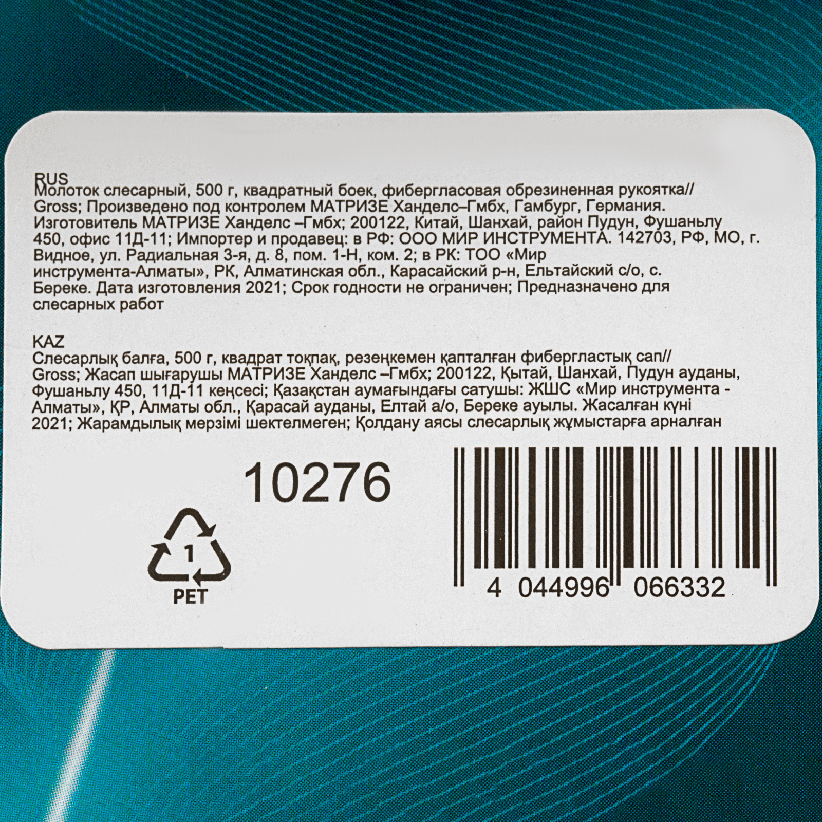 Молоток слесарный, 500 г, квадратный боек, фибергласовая обрезиненная рукоятка Gross в Екатеринбурге