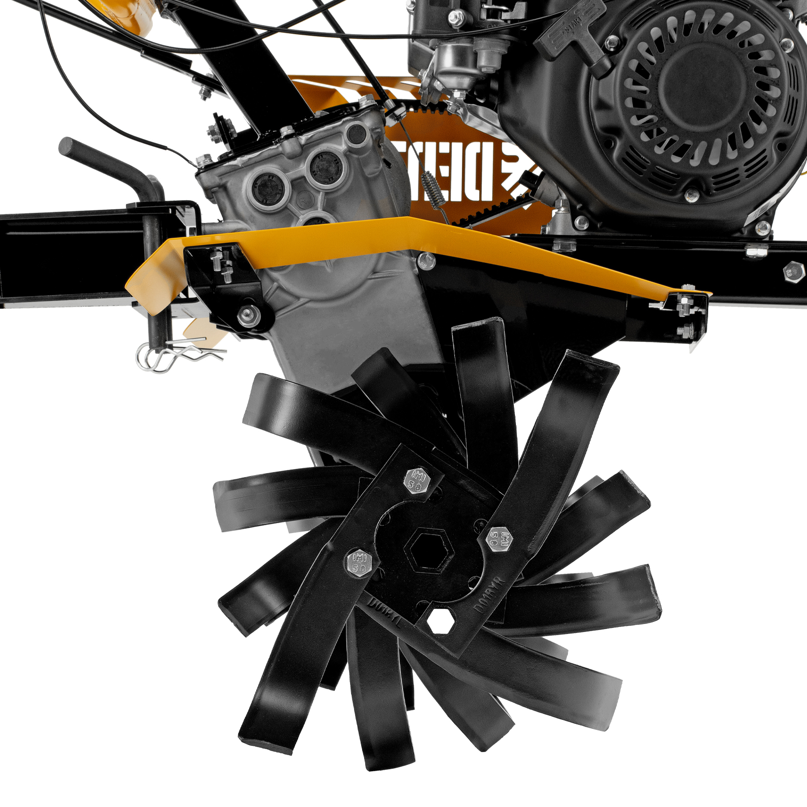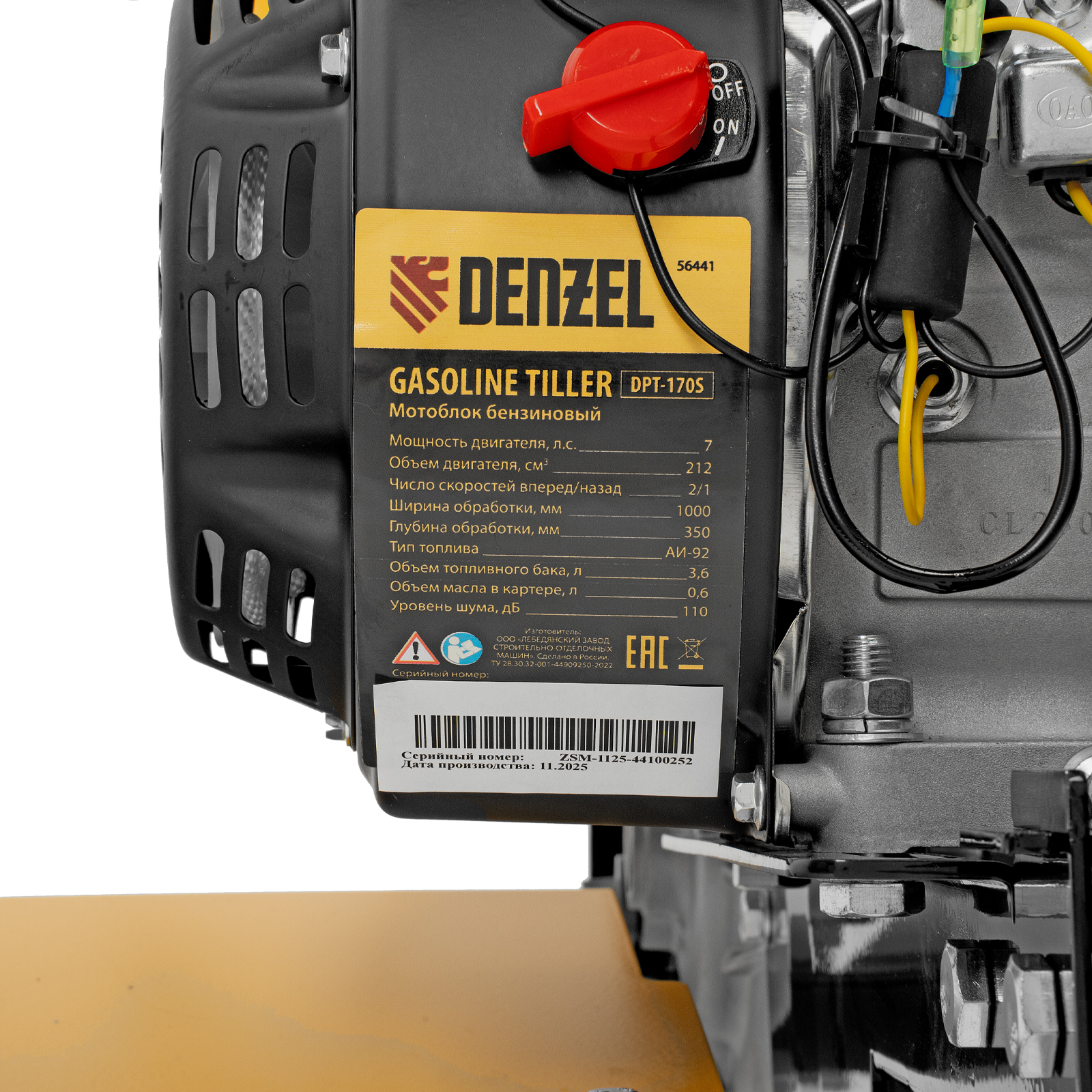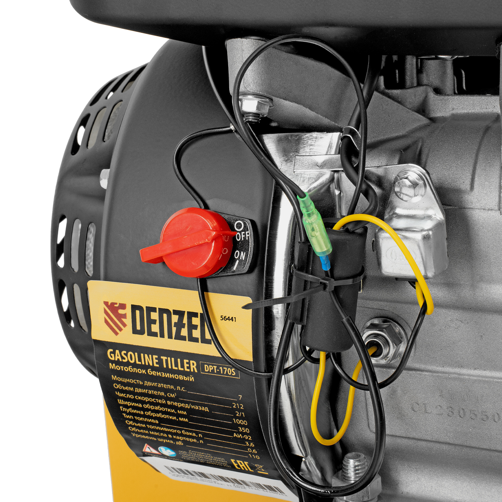 Мотоблок Denzel DPT-170S 56441 с двигателем мощностью 7 л. с., ременным механизмом сцепления, фрезами 3 х 4, шкивом отбора мощности (ШОМ) и коробкой передач 2В/1Н предназначен для проведения сельскохозяйственных работ. Максимальная ширина обработки составляет 1000 мм, глубина — 350 мм. Фрезы собираются из двух двойных и двух одинарных секций, что позволяет регулировать ширину вспашки. ,Шкив отбора мощности и универсальный кронштейн диаметром 30 мм позволяют установить любое навесное оборудование Denzel, например. плуг, окучник, картофелевыкапыватель. Такое решение значительно расширяет возможности мотоблока и позволяет минимизировать расходы на закупку сельскохозяйственной техники.