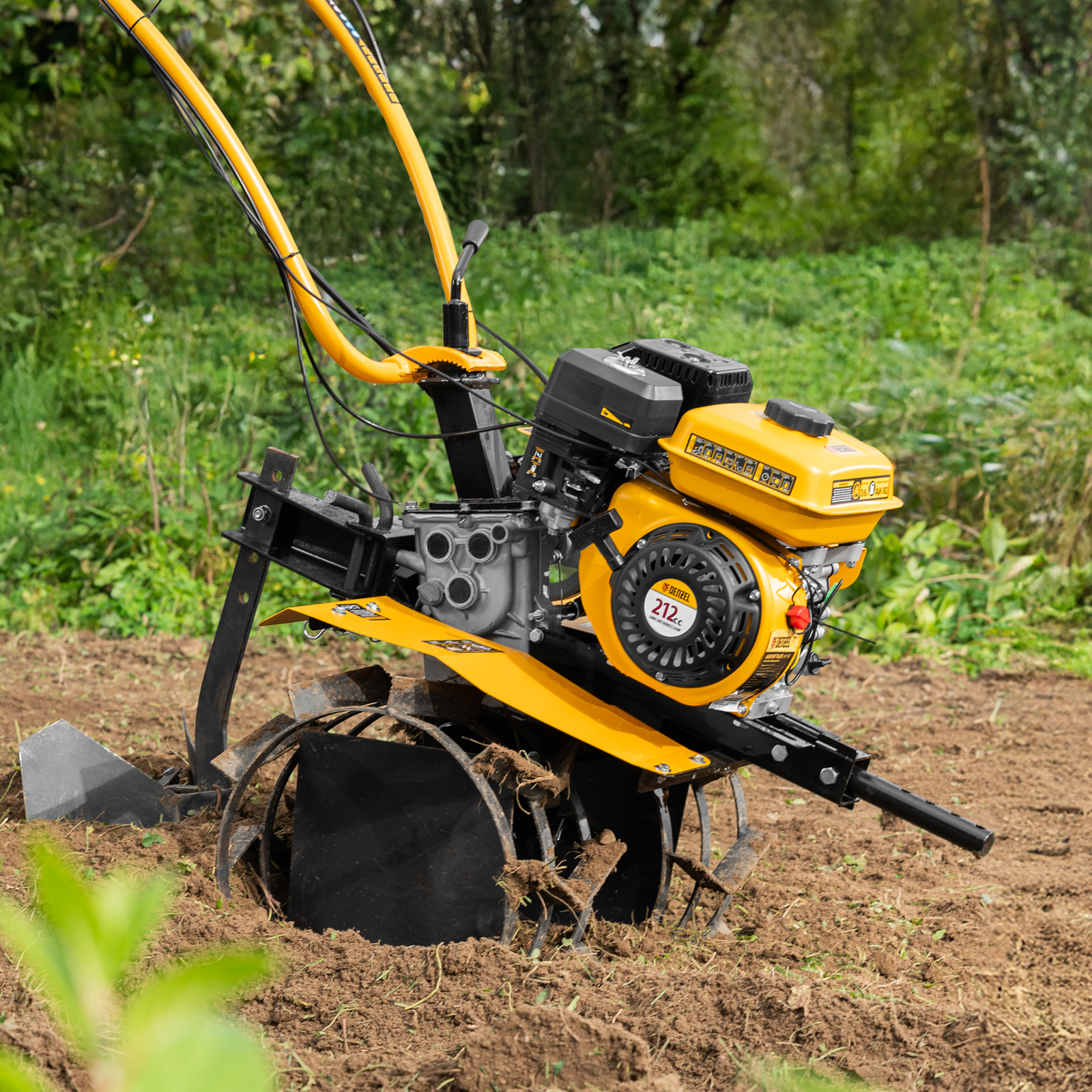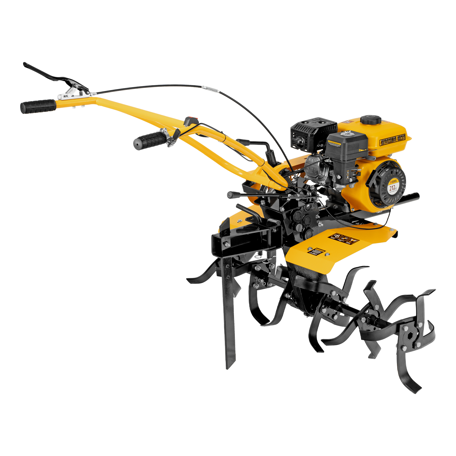 - Эффективная работа — благодаря усиленному шестеренчато-цепному редуктору с чугунным корпусом мотоблок успешно справляется даже с плотным, глинистым грунтом.
