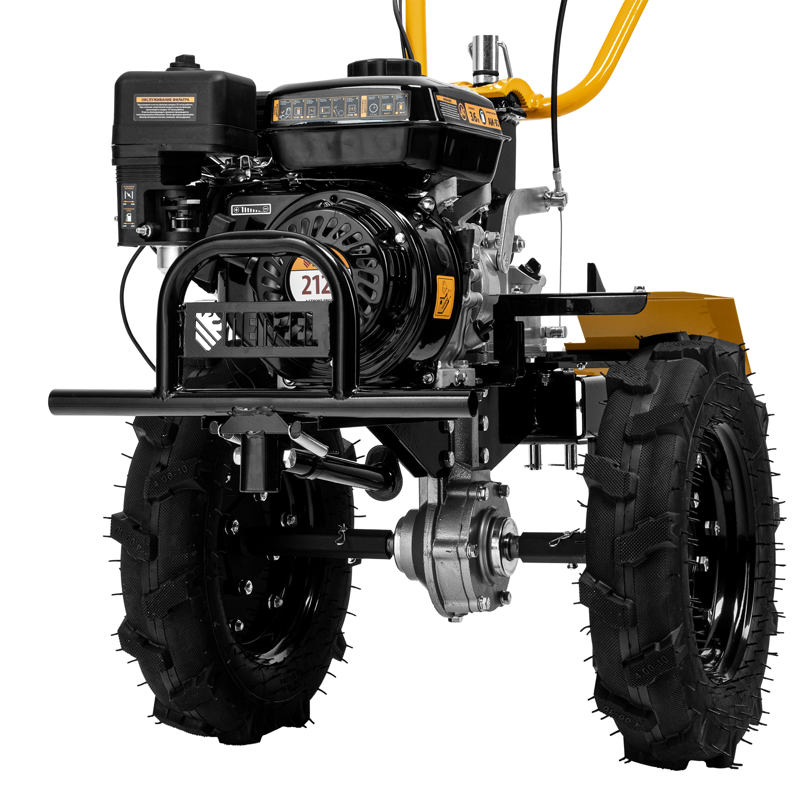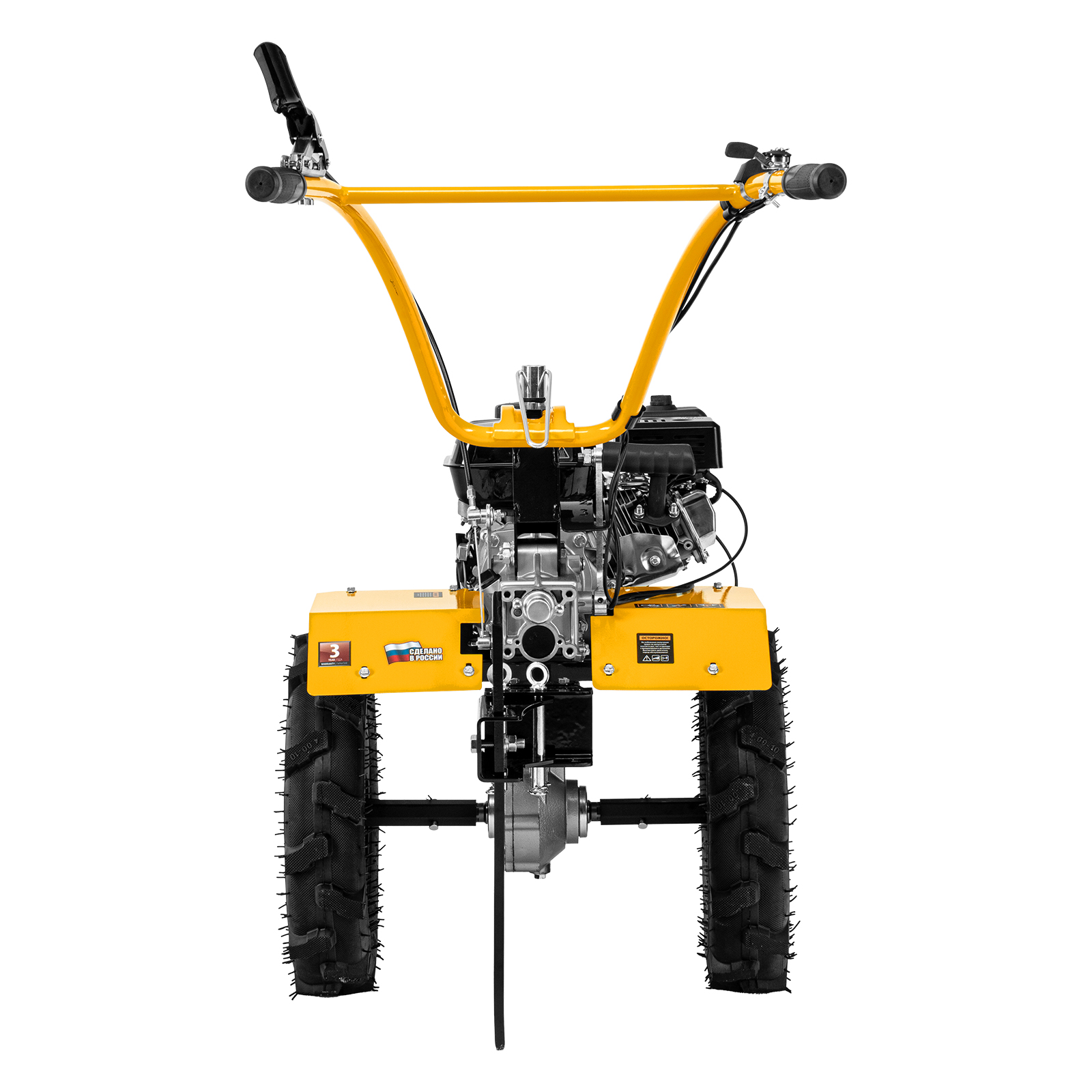 - Комфортная транспортировка — усиленная рукоятка-бампер и большие колеса с глубоким протектором позволяют с легкостью перемещать мотоблок до нужного места.