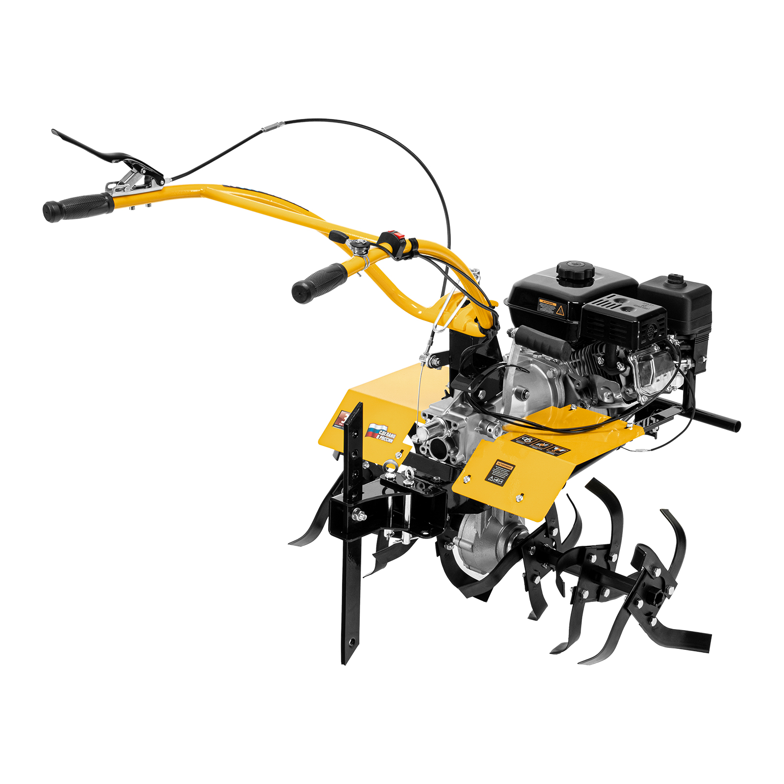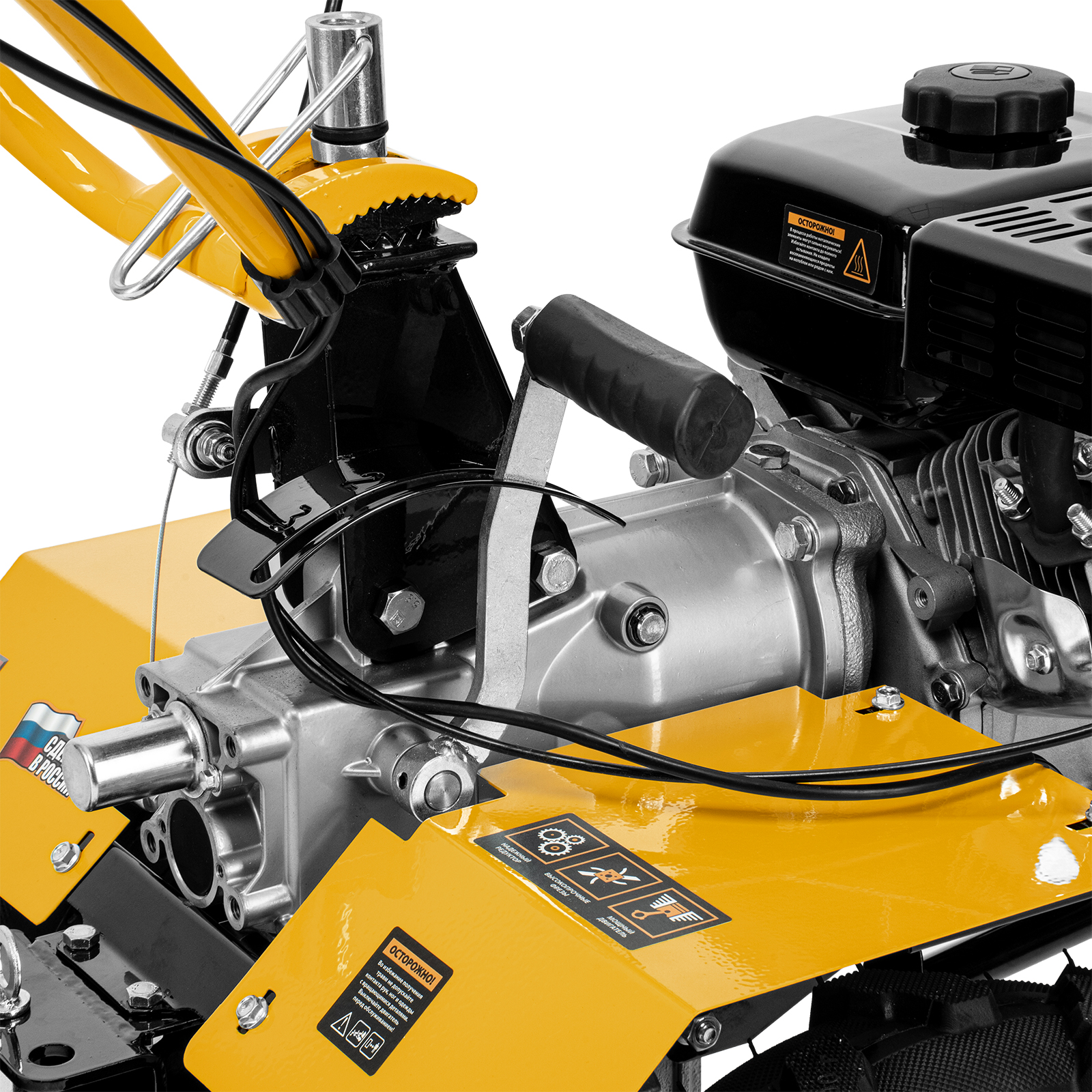 - Легкое управление — регулятор оборотов двигателя, выключатель зажигания и рычаг сцепления находятся на рукоятке перед пользователем.
