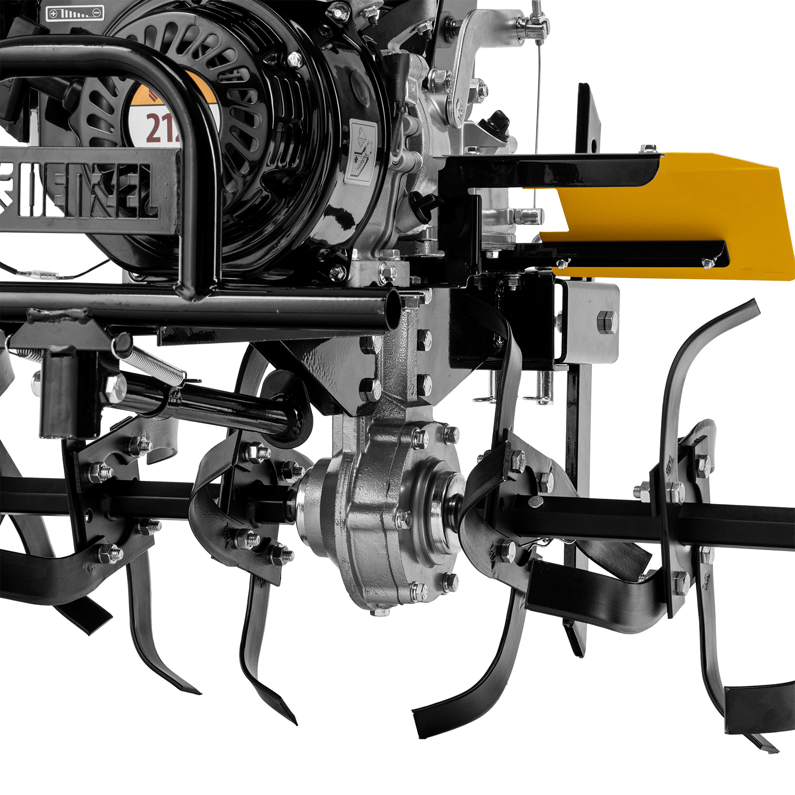 - Усиленный сошник толщиной 12 мм — можно менять глубину вспахивания, удерживать равновесие при обработке почвы и использовать его в качестве задней опоры при хранении мотоблока.