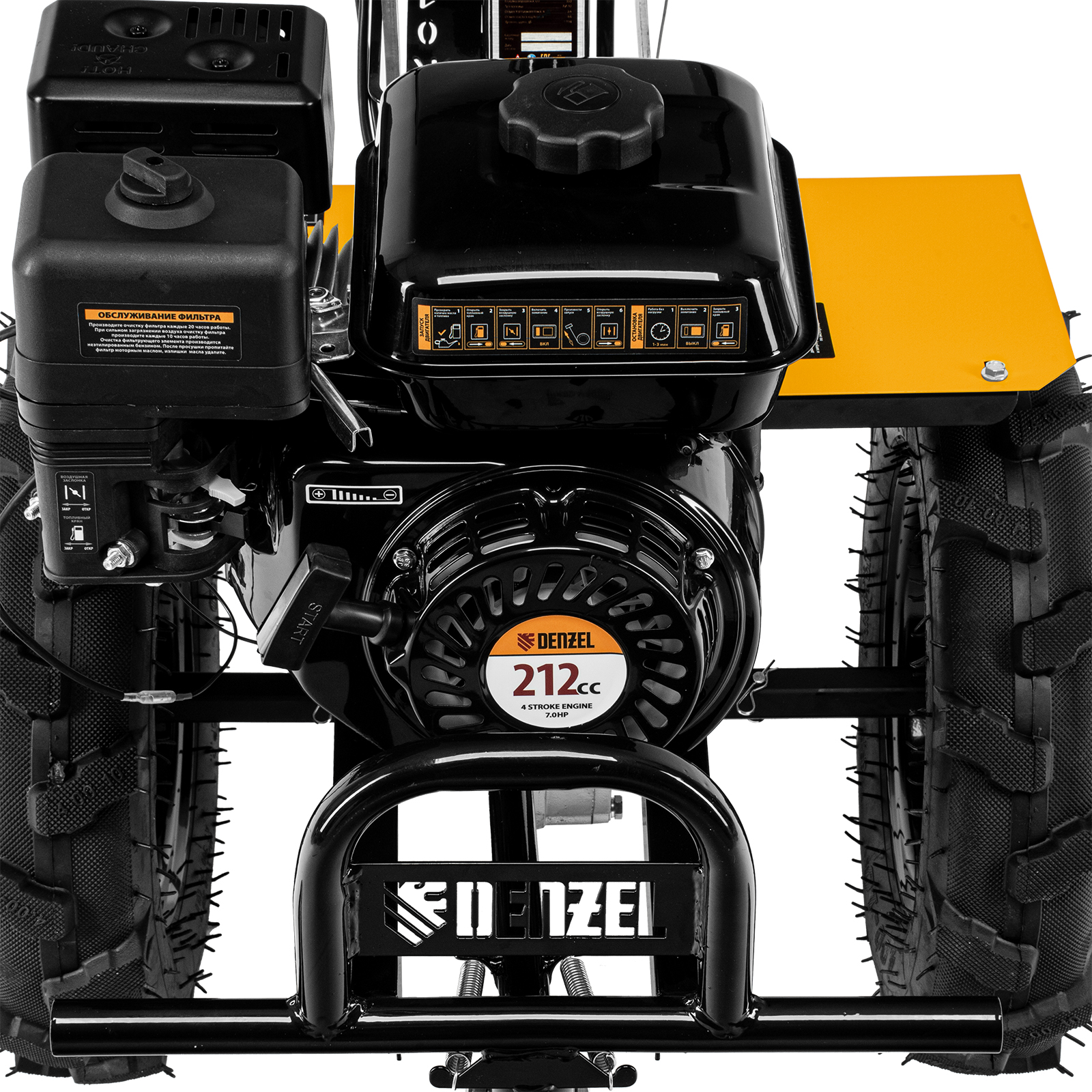 Мотоблок Denzel 56406 DPT-370X мощностью 7 л.с., с дисковым сцеплением, фрезами 3 х 4, валом отбора мощности (ВОМ), передачами 3В/1Н, имеет ширину вспахивания 90 см и глубину обработки 35 см. Предназначен для обработки почвы: рыхления, боронования, выравнивания, прополки и выполнения других задач на приусадебных и садовых участках, уверенно справляется с плотной глинистой почвой.,Мощный и экономичный одноцилиндровый четырехтактный двигатель Denzel серии Long Life с рабочим объемом 212 см3 отличается надежностью и продолжительным ресурсом. Многодисковый механизм сцепления обеспечивает передачу высокого крутящего момента на колеса. Мотоблок предназначен для работы на большой территории и широко используется в быту.