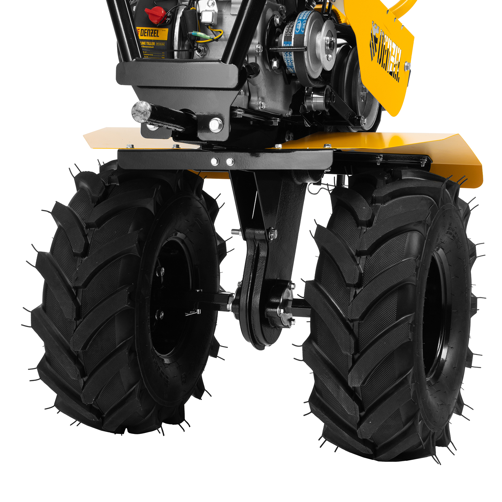 - Повышенная проходимость — мотоблок оснащен тракторными пневматическими колесами.