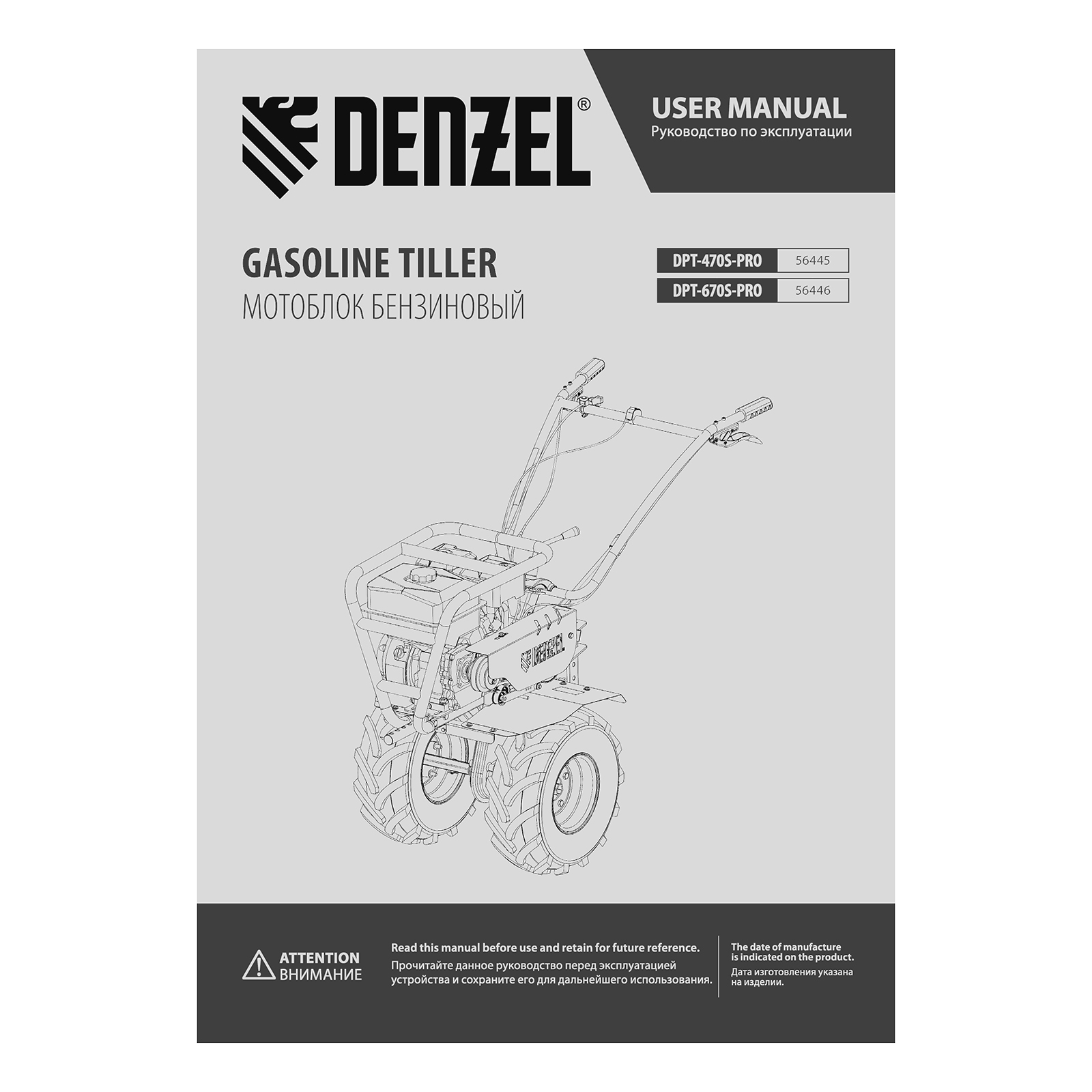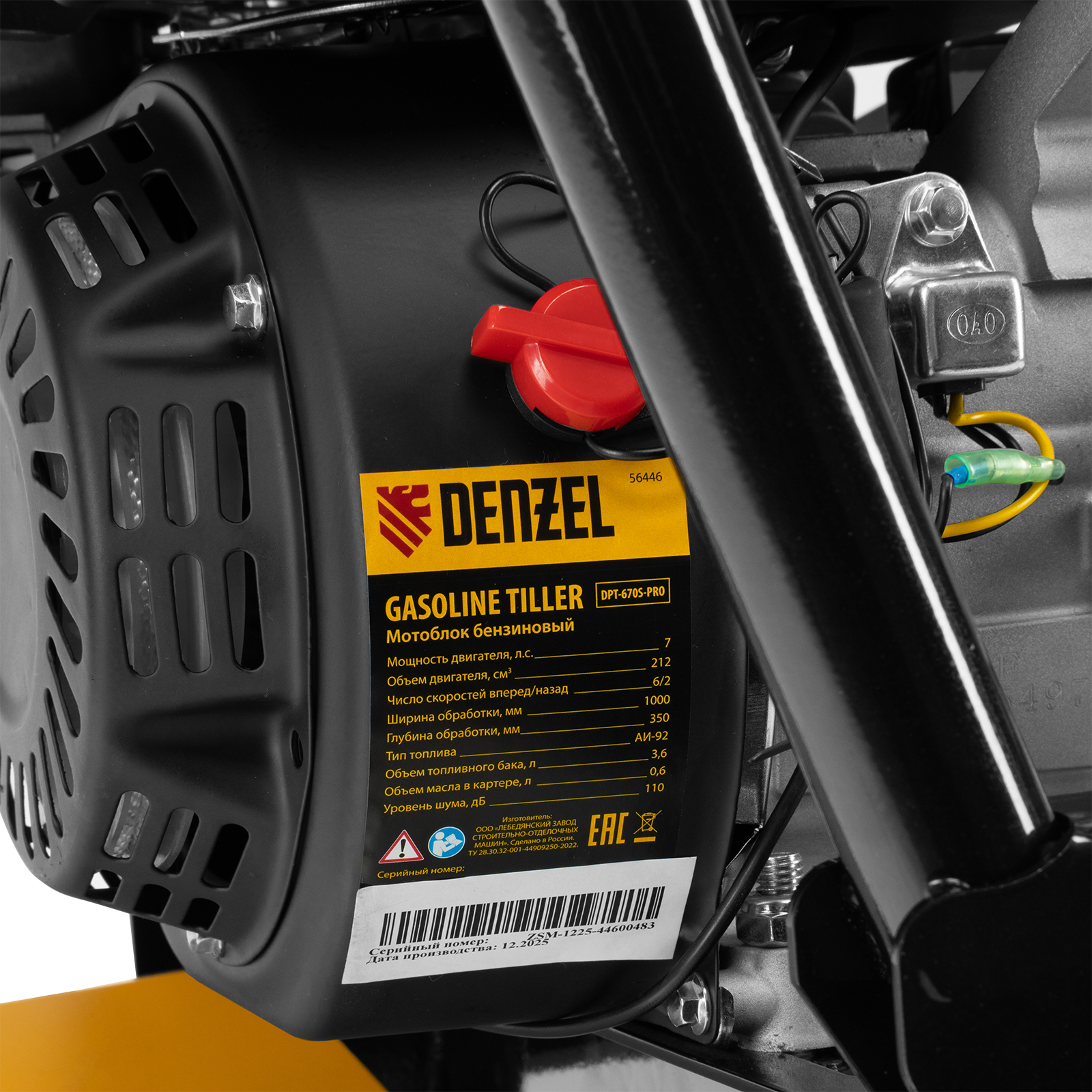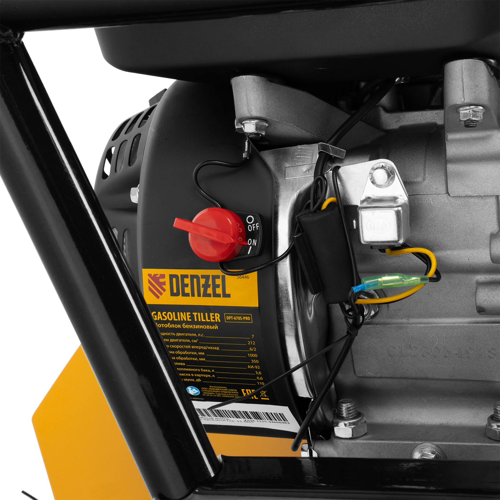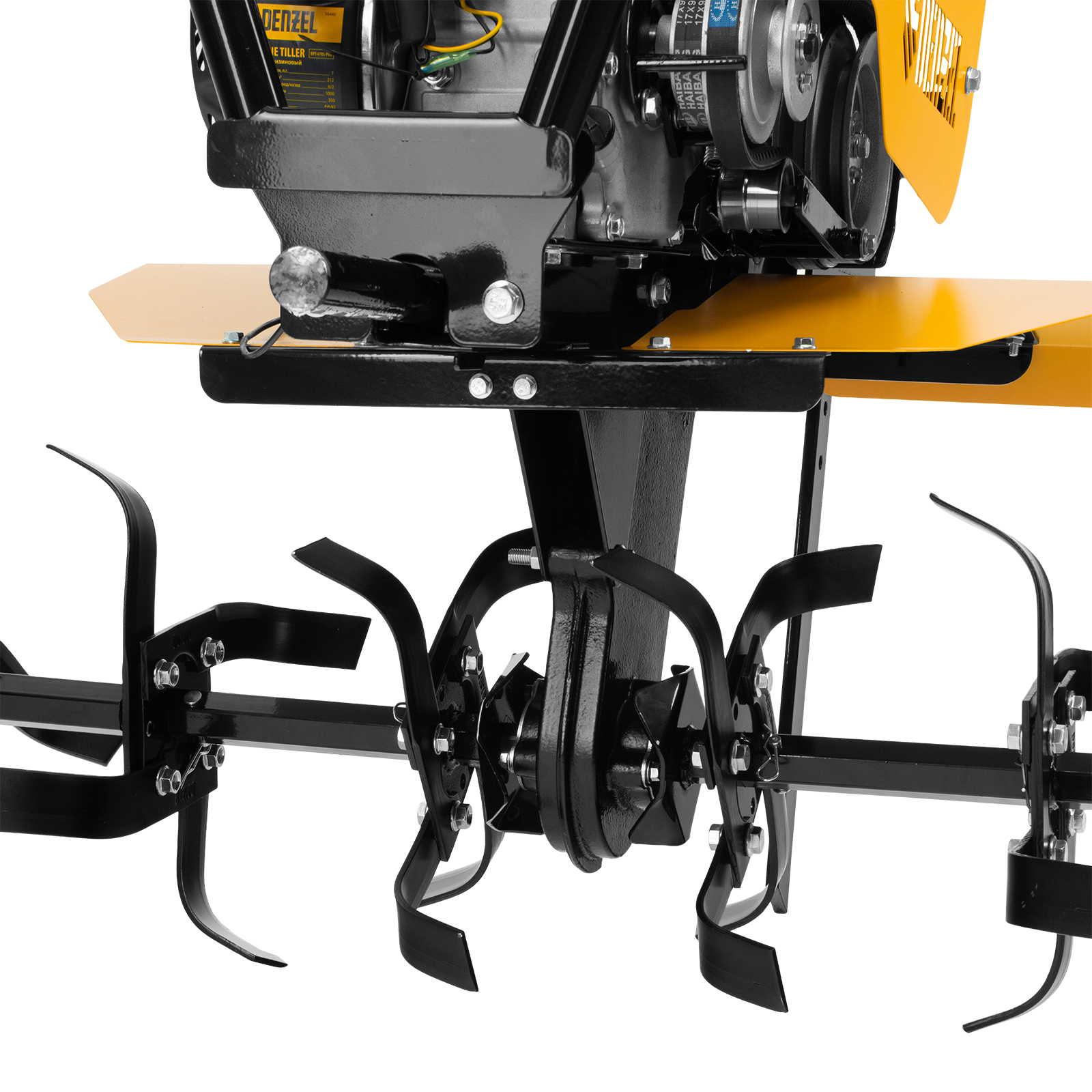 Мотоблок Denzel DPT-670S-PRO 56446 с ременным сцеплением, двигателем объемом 212 см3 и мощностью 7 л.с., с коробкой передач 6 вперед/2 назад и шкивом отбора мощности, комплектуется 24 фрезами (3х4). Предназначен для выполнения земляных работ: прополки, вспахивания, боронования грунта, перевозки грузов и т.д.