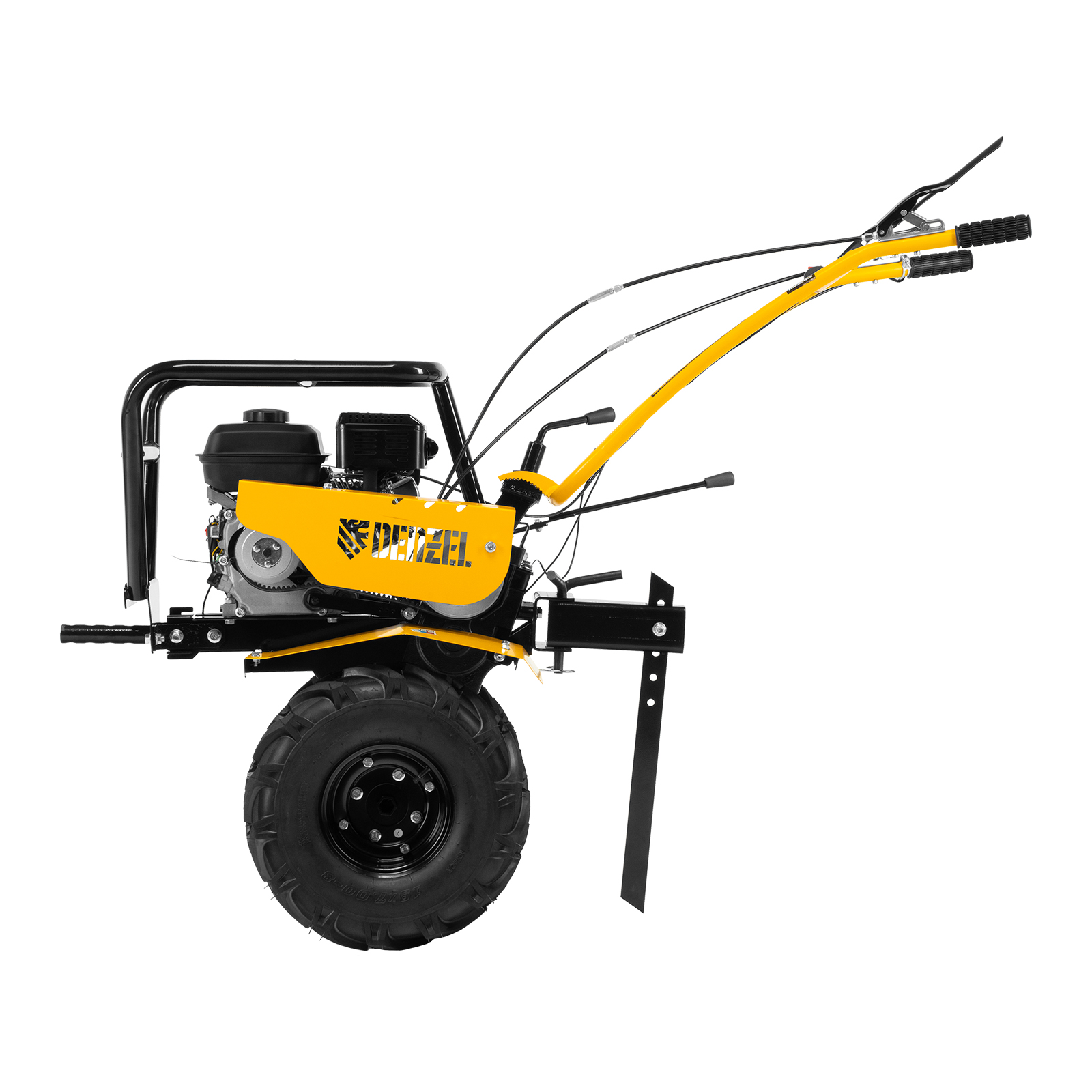 - Возможность использования в качестве транспортного средства — установив прицеп Denzel 59950, можно перемещаться по территории, а также перевозить грузы.