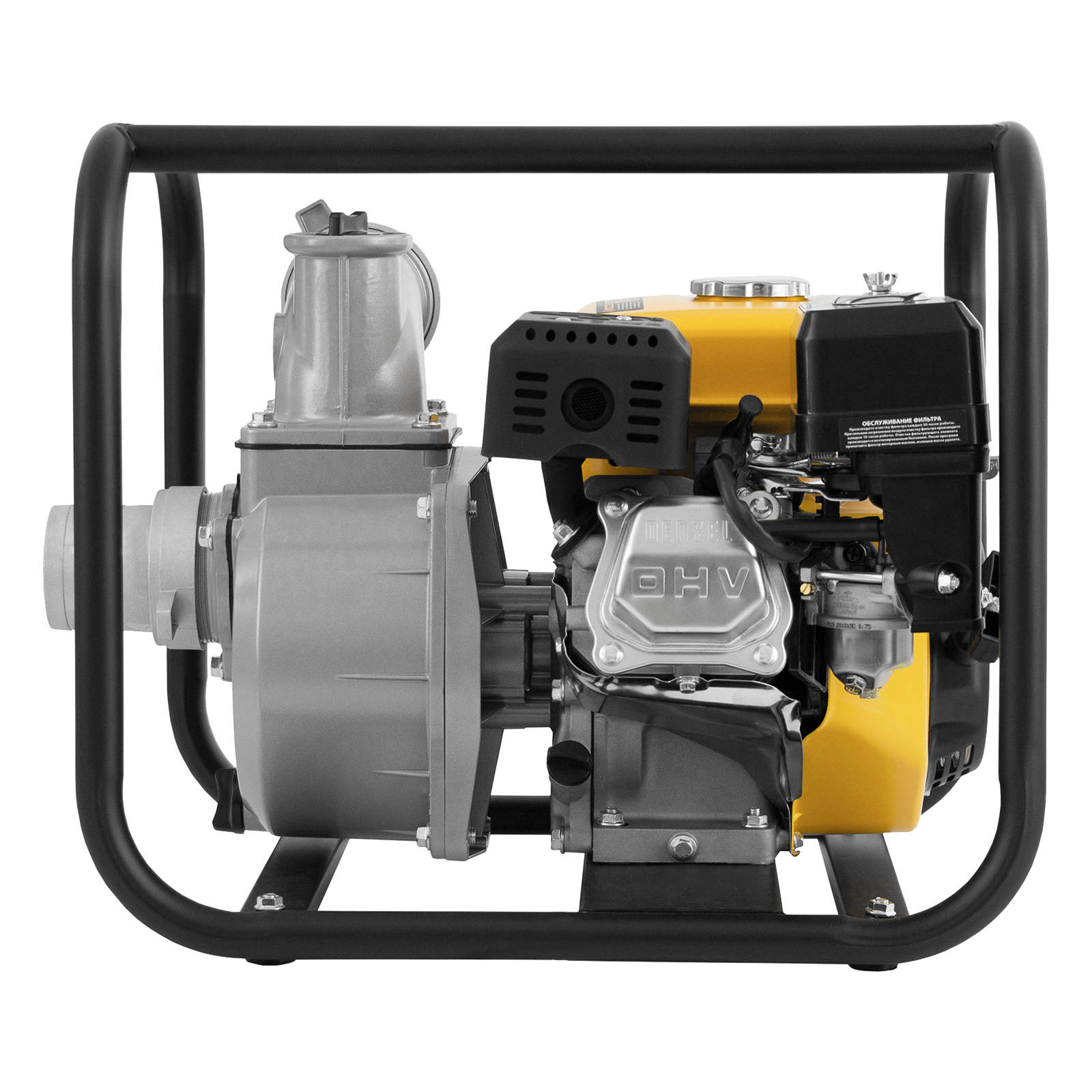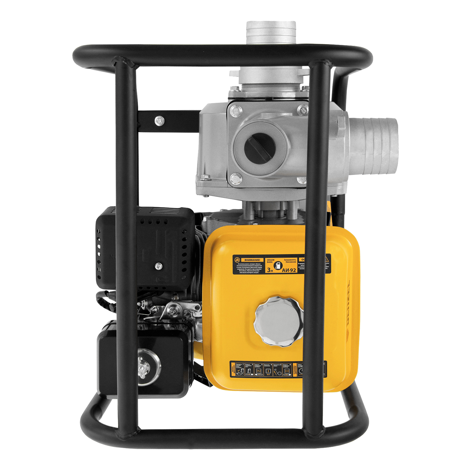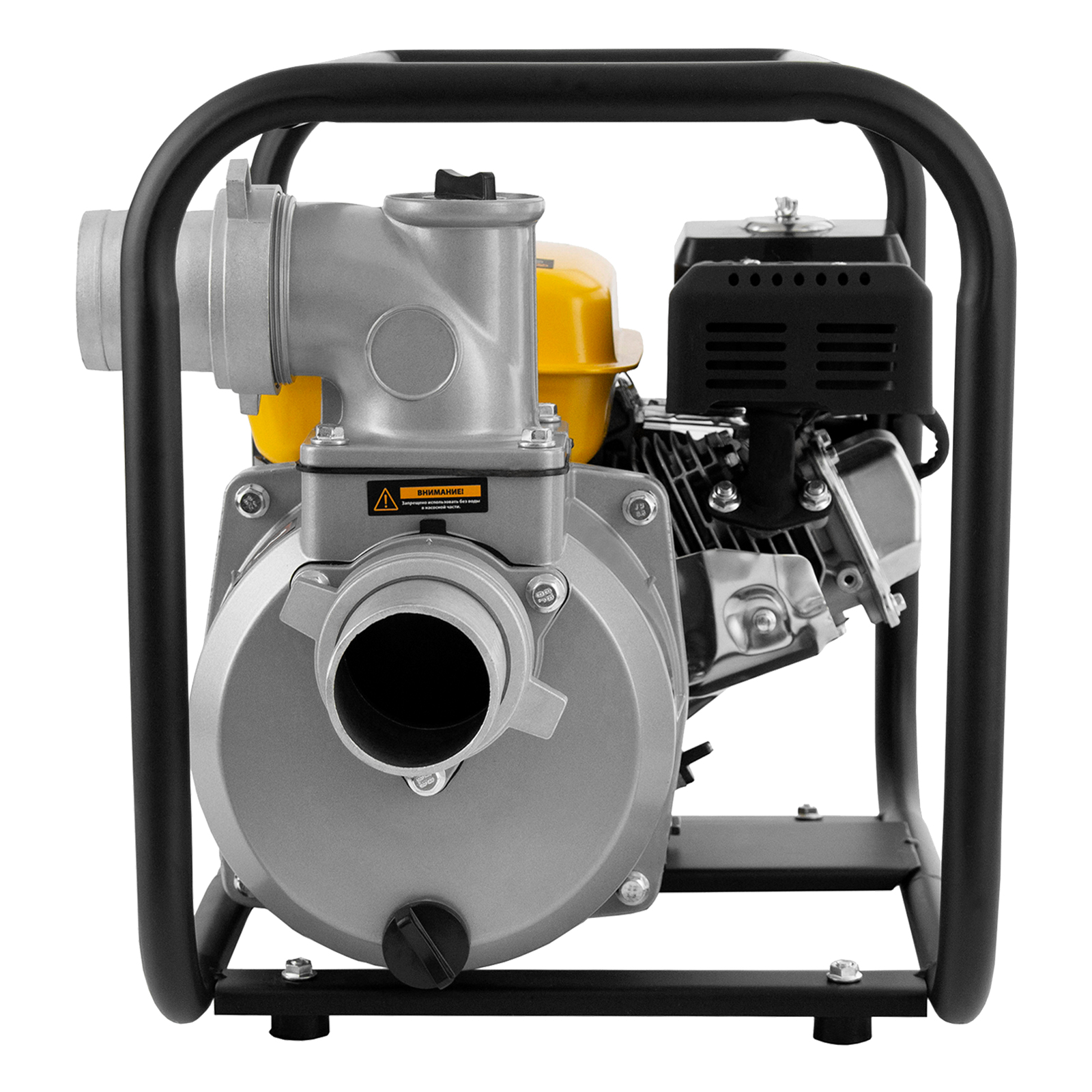- Надежная конструкция — усиленная стальная рама с широким основанием защищает мотопомпу от повреждений и обеспечивает ее устойчивость во время работы.