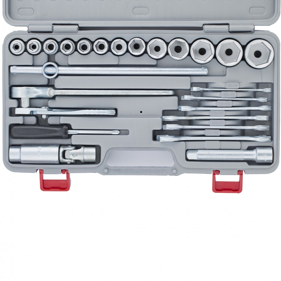 Головки 10, 11, 12, 13, 14, 15, 17, 19, 22, 24, 27, 30, 32 - 13 штКлючи 8х10, 10х12, 12х14, 13х15, 14х17, 17х19 - 6 штКлюч трещотка - 1 штВороток Т-образный - 1 штУдлинитель - 1 штШарнир - 1 штГоловка свечная - 1 штПлоскогубцы - 1 штОтвертка - 1 штКейс - 1 штПлоскогубцы - 1 штТрещотка - 1 шт |