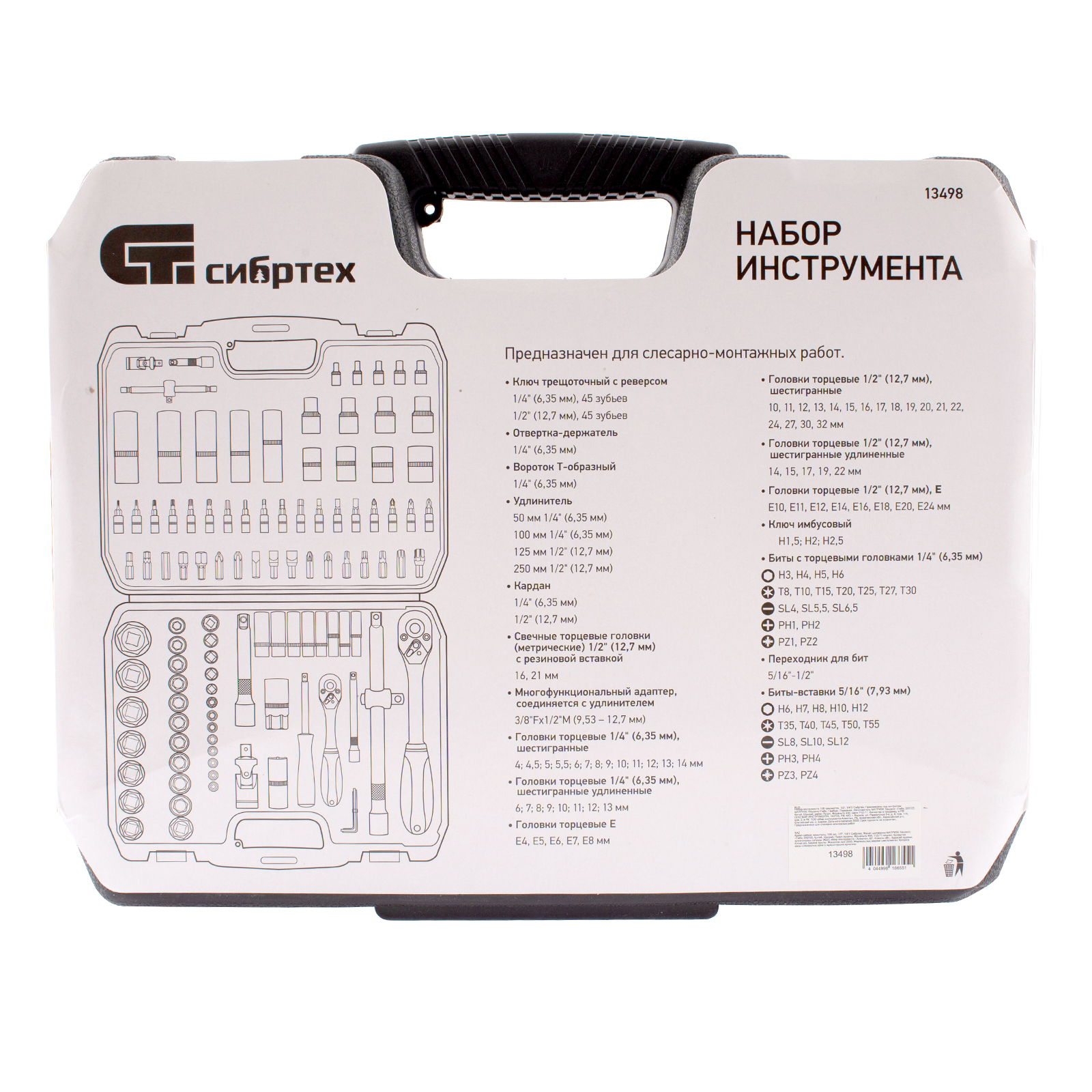 Набор инструмента Сибртех 13498 состоит из 108 предметов с присоединительными размерами 1/2" и 1/4". Предназначен для ремонта и обслуживания автомобилей, а также выполнения бытовых работ. Имеющиеся в комплекте насадки рассчитаны на крепеж с различными типами профилей и шлицев, включая HEX и TORX. Набор будет полезен автолюбителю и профессиональному мастеру.
