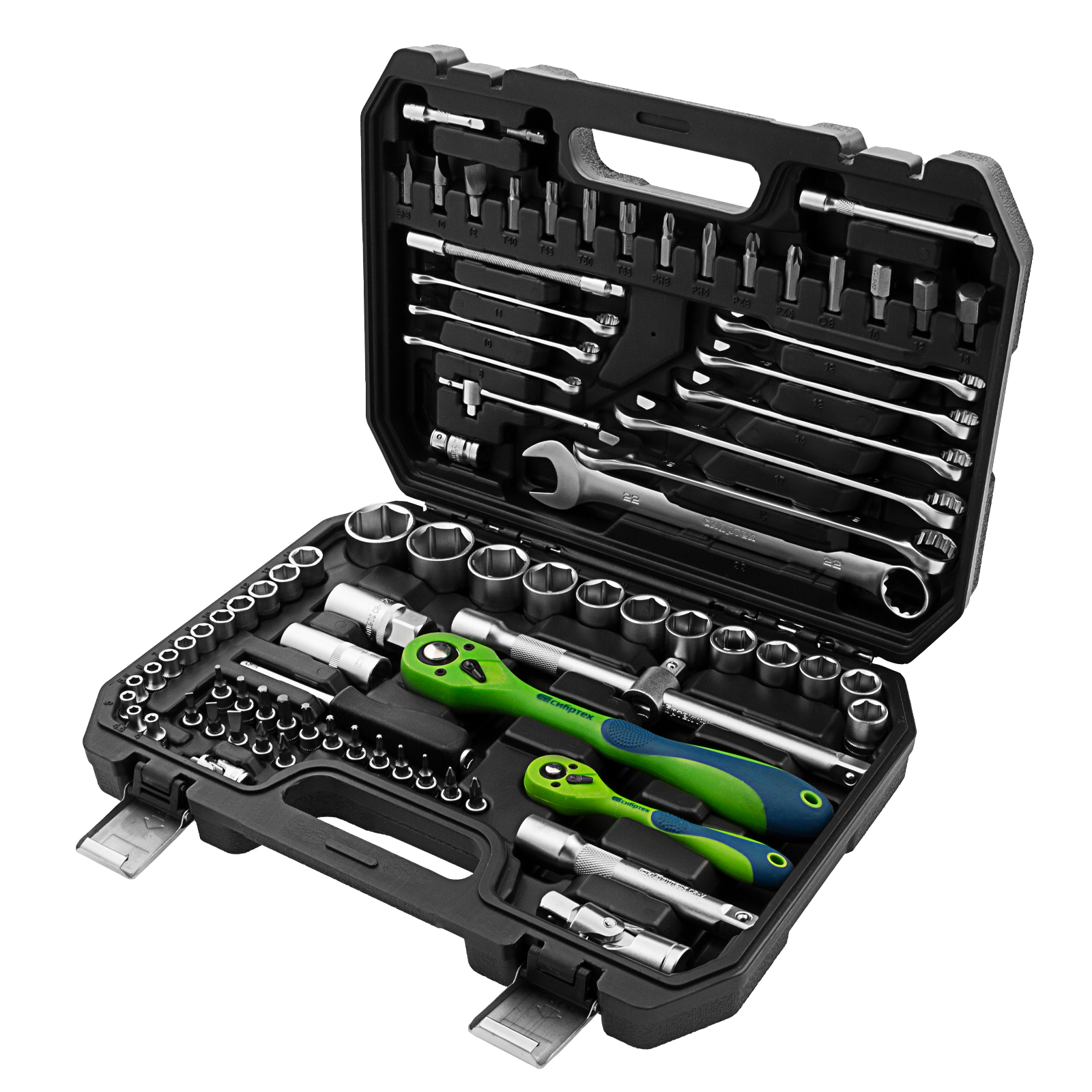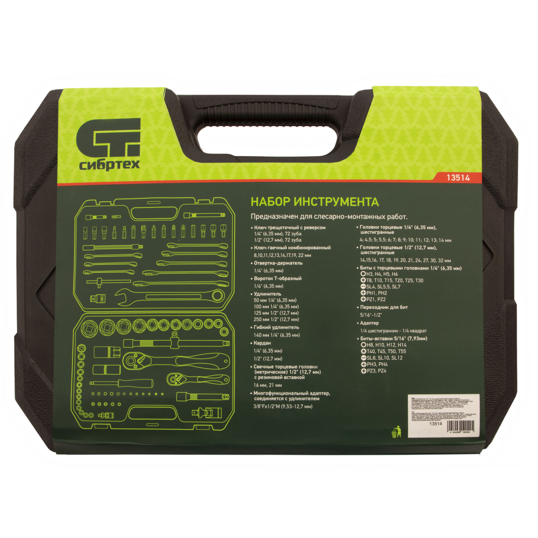 Набор инструментов Сибртех 13514 включает в себя 82 предмета из стали CrV, с присоединительными размерами 1/2" и 1/4", поставляется в пластиковом кейсе. Инструменты предназначенны для проведения слесарных работ, преимущественно монтажа и демонтажа резьбовых крепежей с разными типами шлицев. В комплект входят карданы, удлинители и переходники, облегчающие работу в труднодоступных местах. Набор используется для ремонта автомобилей, также пригодится в быту.