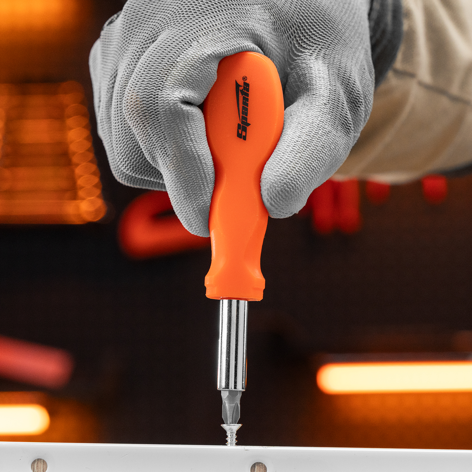 Набор Sparta 13546 из 19 предметов используется для проведения слесарно-монтажных работ. В комплект входят отвертки для точных работ, отвертка для бит, биты и торцевые головки для монтажа/демонтажа крепежных элементов, бокорезы и длинногубцы для захвата, удержания и перекусывания проводов и мелких деталей. Набор будет полезен дома и в частной мастерской.