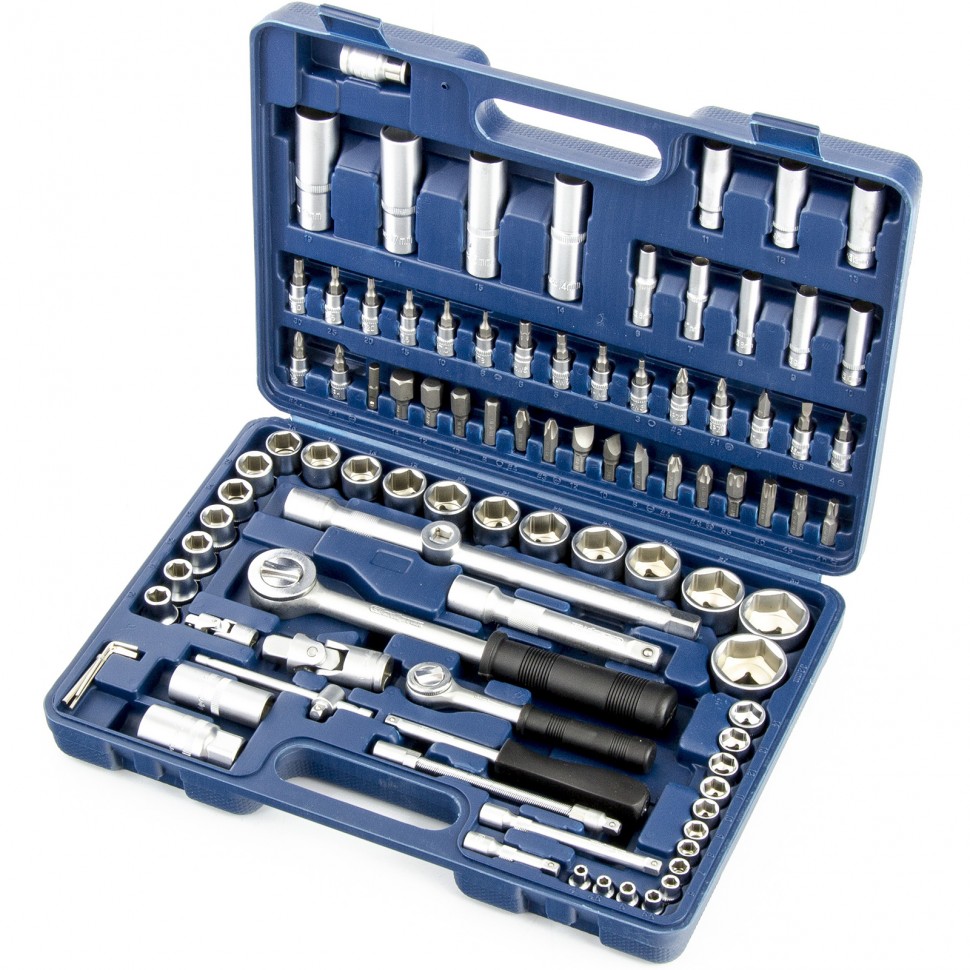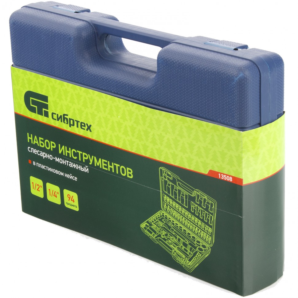 Набор инструментов Сибртех 13508 с присоединительными размерами 1/2 и 1/4 дюйма содержит 94 предмета для проведения слесарно-монтажных работ. С его помощью можно отремонтировать автомобиль без обращения в специализированный сервис, а также решить несложные бытовые задачи дома или на даче. Комплект поставляется в кейсе с транспортировочной ручкой, удобном для размещения в багажнике авто.