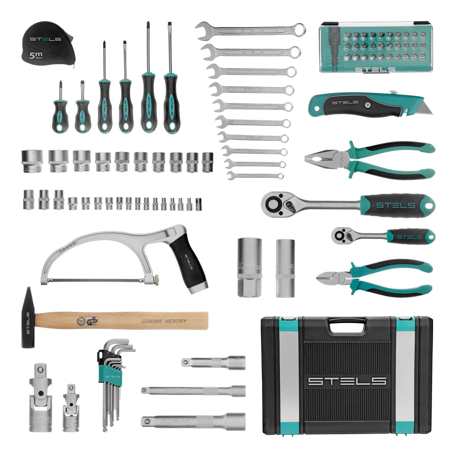 Набор инструментов Stels 14111 в ударопрочным пластиковом кейсе состоит из 98 предметов с присоединительными квадратами 1/2″ и 1/4″, из стали CrV и S2, и предназначен для выполнения слесарно-монтажных работ. Включает инструменты и насадки для работы с резьбовыми крепежами, а также удлинители, облегчающие работу в труднодоступных местах. Молоток, плоскогубцы, бокорезы, ручная ножовка, хозяйственный нож и рулетка расширяют возможности использования набора. Набор предназначен для профессионального использования в автомастерской, будет полезен и для решения бытовых задач.