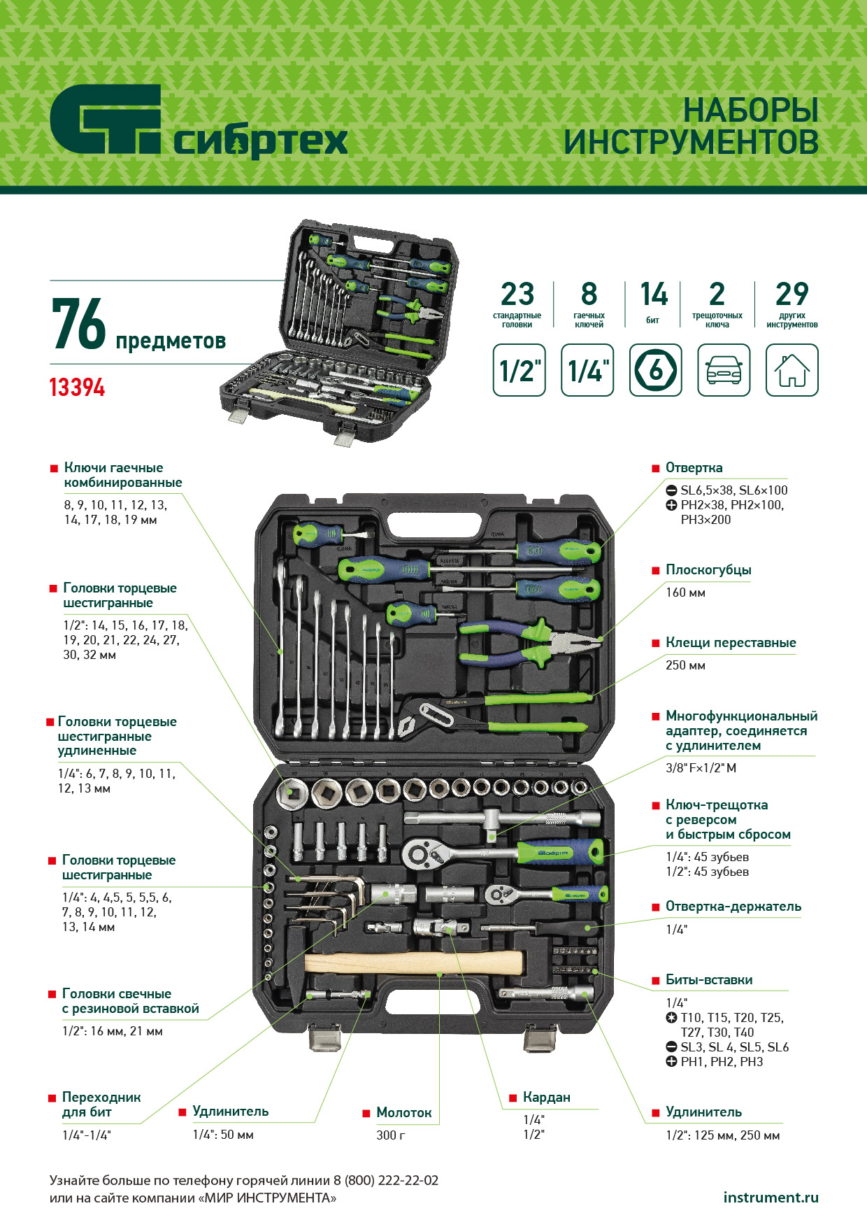 Набор инструментов Сибртех 13394 упакован в пластиковый кейс и состоит из 76 предметов с присоединительным размером 1/2" и 1/4", предназначенных для монтажа и демонтажа резьбового крепежа с разными типами шлицев, а также для ударных и других слесарно-монтажных работ. В комплект поставки входят карданы, удлинители и переходники, облегчающие работу в труднодоступных местах. Набор используется для ремонта автомобилей, а также полезен в быту.